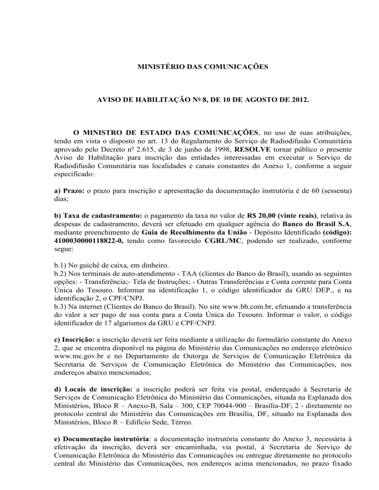 MINISTÉRIO DAS COMUNICAÇÕES AVISO DE HABILITAÇÃO No 8, DE 10 DE AGOSTO DE 2012. O MINISTRO DE ESTADO DAS COMUNICAÇÕES, no uso de suas atribuições, tendo em vista o disposto no art. 13 do Regulamento do Serviço de Radiodifusão Comunitária aprovado pelo Decreto nº 2.615, de 3 de junho de 1998, RESOLVE tornar público o presente Aviso de Habilitação para inscrição das entidades interessadas em executar o Serviço de Radiodifusão Comunitária nas localidades e canais constantes do Anexo 1, conforme a seguir especificado: a) Prazo: o prazo para inscrição e apresentação da documentação instrutória é de 60 (sessenta) dias; b) Taxa de cadastramento: o pagamento da taxa no valor de R$ 20,00 (vinte reais), relativa às despesas de cadastramento, deverá ser efetuado em qualquer agência do Banco do Brasil S.A, mediante preenchimento de Guia de Recolhimento da União - Depósito Identificado (código): 4100030000118822-0, tendo como favorecido CGRL/MC, podendo ser realizado, conforme segue: b.1) No guichê de caixa, em dinheiro. b.2) Nos terminais de auto-atendimento - TAA (clientes do Banco do Brasil), usando as seguintes opções: - Transferência;- Tela de Instruções; - Outras Transferências e Conta corrente para Conta Única do Tesouro. Informar na identificação 1, o código identificador da GRU DEP., e na identificação 2, o CPF/CNPJ. b.3) Na internet (Clientes do Banco do Brasil). No site www.bb.com.br, efetuando a transferência do valor a ser pago de sua conta para a Conta Única do Tesouro. Informar o valor, o código identificador de 17 algarismos da GRU e CPF/CNPJ. c) Inscrição: a inscrição deverá ser feita mediante a utilização do formulário constante do Anexo 2, que se encontra disponível na página do Ministério das Comunicações no endereço eletrônico www.mc.gov.br e no Departamento de Outorga de Serviços de Comunicação Eletrônica da Secretaria de Serviços de Comunicação Eletrônica do Ministério das Comunicações, nos endereços abaixo mencionados; d) Locais de inscrição: a inscrição poderá ser feita via postal, endereçado à Secretaria de Serviços de Comunicação Eletrônica do Ministério das Comunicações, situada na Esplanada dos Ministérios, Bloco R – Anexo-B, Sala – 300, CEP 70044-900 – Brasília-DF; 2 - diretamente no protocolo central do Ministério das Comunicações em Brasília, DF, situado na Esplanada dos Ministérios, Bloco R – Edifício Sede, Térreo. e) Documentação instrutória: a documentação instrutória constante do Anexo 3, necessária à efetivação da inscrição, deverá ser encaminhada, via postal, à Secretaria de Serviço de Comunicação Eletrônica do Ministério das Comunicações ou entregue diretamente no protocolo central do Ministério das Comunicações, nos endereços acima mencionados, no prazo fixado neste Aviso. Qualquer documento postado e apresentado, de forma voluntária, pela entidade, após o esgotamento do prazo, não será passível de análise, sendo considerado intempestivo. A apresentação da referida documentação é obrigatória, acarretando a não apresentação, no prazo estabelecido, no indeferimento do pedido de inscrição. PAULO BERNARDO SILVA Ministro de Estado das Comunicações AVISO DE HABILITAÇAO Nº 8, DE 10 DE AGOSTO DE 2012. Anexo 1 Estado AL AL AM BA BA BA BA BA BA BA BA BA CE ES GO GO GO MG MG MG MG MG MG MS MT MT PA PB PE PE PE PE PE PR PR PR RJ RN RS RS RS SC SC SC SC Município Boca da Mata Murici Itacoatiara Araci Campo Formoso Canudos Caraíbas Cocos Guanambi Itatim Itororó Manoel Vitorino Camocim Anchieta São Miguel do Araguaia Aparecida de Goiânia São Simão Centralina Senhora dos Remédios Visconde do Rio Branco Luz Pitangui Santa Juliana Amambaí Juara Juina São Sebastião da Boa Vista Pianco Brejão Cabo de Santo Agostinho Gravata Itapetim Vicencia Laranjeiras do Sul Cambe Cornélio Procópio São Pedro da Aldeia Patú Cachoeira do Sul Cachoeirinha Casca Garopaba Irineópolis Indaial Lages Canal* 285 200 285 285 285 200 200 285 285 200 290 285 254 253 285 200 285 285 254 285 200 200 200 290 200 200 285 200 200 253 253 285 253 200 200 200 200 200 285 200 200 252 200 252 200 SP SP SP SP SP SP SP SP SP SP SP SP SP SP SP SP SP SP SP TO Águas de Santa Barbara Areiópolis Cajamar Cajurú Campo Limpo Paulista Casa Branca Conchal Fartura Franco da Rocha Guapiaçú Guaraçaí Itupeva Jau Lorena Mirante do Paranapanema São Roque Lins Nova Campina Orlândia Paraíso do Tocantins 200 200 198 200 254 200 200 200 198 285 200 200 200 300 285 198 254 200 290 285 * Os canais designados para os municípios poderão ser alterados em decorrência de atos futuros da Anatel, motivados por diversos fatores, inclusive por eventuais solicitações formuladas pelo Ministério das Comunicações, no intuito de viabilizar o maior número possível de estações. Anexo 2 REQUERIMENTO PARA AUTORIZAÇÃO DE EXECUÇÃO DO SERVIÇO DE RADIODIFUSÃO COMUNITÁRIA Exmo Sr. Ministro de Estado das Comunicações, A____________________________________________, (denominação da requerente), inscrita no CNPJ sob o no _________________/_____-___, com sede _________________________________, na cidade de ____________________________, Estado ___________________________, CEP _______________-_____, Telefone 0XX(_____) ______________________, correio eletrônico________________________________________________________________, entidade sem fins lucrativos, legalmente constituída e devidamente registrada no órgão competente, vem, respeitosamente à presença de Va. Ex a., em atendimento ao Aviso n° ________, apresentar a documentação de que trata o item 8 da Norma nº 1/2011, aprovada pela Portaria MC nº 462, de 14 de Outubro de 2011, publicada no Diário Oficial da União no dia 18 de outubro do mesmo ano. ___________________________, _____ de de 20___. (local e data) ______________________________________________ (assinatura do representante legal da entidade) 