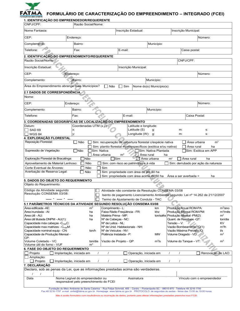 FORMULÁRIO DE CARACTERIZAÇÃO DO EMPREENDIMENTO – INTEGRADO (FCEI) 1. IDENTIFICAÇÃO DO EMPREENDEDOR/REQUERENTE CNPJ/CPF: Razão Social/Nome: Nome Fantasia: Inscrição Estadual: CEP: Inscrição Municipal: Endereço: Complemento: Bairro: Telefone: Fax: Número: Município: E-mail: Caixa postal: 2. IDENTIFICAÇÃO DO EMPREENDIMENTO/REQUERENTE Razão Social/Nome: Inscrição Estadual: CNPJ/CPF: Inscrição Municipal: CEP: Endereço: Complemento: Número: Bairro: Município: Área do Empreendimento abrange mais Municípios? Não Sim Nome do(s) Município(s): 2.1 DADOS DE CORRESPONDÊNCIA Nome: CEP: Número: Endereço: Complemento: Bairro: Telefone: Fax: Município: E-mail: Caixa Postal: 3. COORDENADAS GEOGRÁFICAS DE LOCALIZAÇÃO DO EMPREENDIMENTO Datum: Coordenadas UTM (x,y): Latitude e longitude: Latitude (S) x: g: SAD 69 Longitude (W): g: y: WGS 84 4. EXPLORAÇÃO FLORESTAL Reposição Florestal: Não Sim: recuperação de cobertura florestal c/espécie nativa Exploração Florestal de Bracatinga: Sim: plantio florestal monoespecíficos (exótica e/ou nativa) Sim: Nativa Sim: Nativa Plantada Área urbana m2 Área rural ha Não Sim Área urbana m2 Aproveitamento de Material Lenhoso: Não Sim: com risco ao patrimônio e à vida Corte Eventual de Árvores: Averbação de Reserva Legal: Não Não Sim Sim: propriedade com área de até 50 ha Sim: propriedade com área acima de 50 ha Supressão de Vegetação: Não m: m: s: s: m2 Área urbana Área rural ha Sim: Exótica em APP Área rural ha Sim: derrubado por ação da natureza Área a ser averbada = ha 5. DADOS DO OBJETO DO REQUERIMENTO Objeto do Requerimento: Código da Atividade segundo Resolução CONSEMA 03/08: . . Atividade não constante da Resolução CONSEMA 03/08 Isento de pagamento Licenciamento Ambiental segundo: Lei nº 14.262 de 21/12/2007 Termo de Ajustamento de Conduta - TAC 5.1 PARÂMETROS TÉCNICOS DA ATIVIDADE SEGUNDO RESOLUÇÃO CONSEMA 03/08 Área edificada -AE: m2 Comprimento - L: km Área inundada - AI: ha Faixa Rádio Freqüência - FR: khz Área útil - AU: ha Matéria Prima - MP: ton/safra Área útil titulada DNPM - AU(1): ha Nº de Cabeças - NC: Capacidade máx cabeças -CmáxC: Nº de Leitos - NL: Capacidade max matrizes - CmáxM: Nº de Unid. Habitacionais - NH: Capacidade nominal equip - CN: ton/h Nº de Veículos - NV: Capacidade de Produção Mensal Potência Instalada - P: MW CP: Volume Coletado - VC ton/dia Vazão de Projeto - QP m3/s Volume útil do forno - VUF m3 6. FASE DO OBJETO DO REQUERIMENTO Projeto Implantação, iniciada em / / Operação, iniciada em Ampliação: Projeto Implantação, iniciada em / / Operação, iniciada em 7. DECLARAÇÃO Declaro, sob as penas da Lei, que as informações prestadas acima são verdadeiras . / Data Produção Anual ROM-PA: Produção Mensal ROM-PM: Produção Mensal -PM(2): Quant. de Resíduos -QT: Tensão – V: Vazão Bombeamento -Q(1): Vazão Máxima Prevista -Q: Volume Dragado - VD: m3/ano m3/mês m2 ton/dia KV m3/h l/s m3 Volume do Tanque – VT: m3 / / / / Renovação de LAO / Nome Legível do empreendedor ou responsável pelo preenchimento do FCEI Assinatura Vínculo com o empreendedor Fundação do Meio Ambiente de Santa Catarina – Rua Felipe Schmidt, 485 – Centro – Florianópolis-SC – 88010-970 - Telefone 48 3216-1700 Fax 48 3216-1797 e-mail [email protected] Homepage www.fatma.sc.gov.br PROTOCOLO: de segundas às sextas - feiras das 13:00 às 19:00 horas. Não é aceito formulário com insuficiência ou incorreção de dados, portanto para alterar informações prestadas preencha novo FCEI. Apresentação O Formulário de Caracterização do Empreendimento-Integrado - FCEI é utilizado para cadastramento de empreendedores e empreendimentos junto a FATMA, e constitui-se em instrumento para caracterização de empreendimentos/atividades. Após a digitação dos dados do FCEI, o Sistema Integrado de Informação Ambiental – SINFAT gera automaticamente a Instrução Normativa – IN correspondente ao empreendimento/atividade requerida. Você pode preencher este formulário de forma manual ou não. Porém lembre-se sempre da importância das assinaturas, e dos documentos a serem anexados. 1. IDENTIFICAÇÃO DO EMPREENDEDOR/REQUERENTE EMPREENDEDOR/REQUERENTE Pessoa física ou jurídica responsável pelo empreendimento e/ou atividade objeto do requerimento. Ex.: Vale do Rio Claro Mineração S/A; Município de Tubarão; Transportadora Céu Azul Ltda; Laticínios Porto Seguro S/A; Eduardo Silva Firma Individual Ltda; Fazenda Boa Nova, José Antônio da Silva, etc. (Não se trata do consultor ou empresa de consultoria). CNPJ/CPF: Razão Social/Nome: Nome Fantasia: Inscrição Estadual: Inscrição Municipal: CNPJ/CPF: Informar o CNPJ se pessoa jurídica ou CPF se pessoa física, do empreendedor/requerente. RAZÃO SOCIAL/NOME: Informar Razão Social/Nome da pessoa física ou jurídica do empreendedor/requerente responsável pelo empreendimento e/ou atividade. NOME FANTASIA: Informar o Nome Fantasia do empreendedor/requerente, se houver. INSCRIÇÃO ESTADUAL: Informar o da Inscrição Estadual do empreendedor/requerente, se for o caso. INSCRIÇÃO MUNICIPAL: Informar o da Inscrição Municipal do empreendedor/requerente, se for o caso. CEP: Endereço: Complemento: Bairro: Telefone: Fax: Número: Município: E-mail: Caixa postal: CEP: Informar o CEP do endereço do empreendedor/requerente. ENDEREÇO: Preencher os dados relativos ao tipo e nome do logradouro do empreendedor/requerente. Por exemplo: Rua das Flores, Avenida Santa Catarina, Rodovia SC-401, etc. NÚMERO: Informar número. COMPLEMENTO: Informar o complemento, se houver (bloco, sala, apto.). BAIRRO: Informar o bairro (nome do bairro, localidade, linha). MUNICÍPIO: Informar o nome no Município. TELEFONE: Informar o número do telefone, indicando o código DDD (Ex.: 48 3216-1700). FAX: Informar o número do Fax, indicando o código DDD (Ex.: 48 3216-1797). E-MAIL: Informar o endereço de 