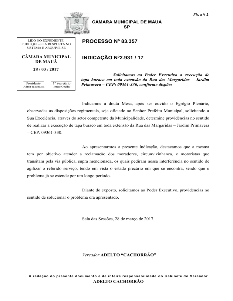 Fls. n: 1 CÂMARA MUNICIPAL DE MAUÁ SP LIDO NO EXPEDIENTE, PUBLIQUE-SE A RESPOSTA NO SISTEMA E ARQUIVE-SE PROCESSO Nº 83.357 CÂMARA MUNICIPAL DE MAUÁ INDICAÇÃO Nº2.931 / 17 28 / 03 / 2017 Presidente 1º Secretário Admir Jacomussi Irmão Ozelito Solicitamos ao Poder Executivo a execução de tapa buraco em toda extensão da Rua das Margaridas – Jardim Primavera – CEP: 09361-330, conforme dispõe: Indicamos à douta Mesa, após ser ouvido o Egrégio Plenário, observadas as disposições regimentais, seja oficiado ao Senhor Prefeito Municipal, solicitando a Sua Excelência, através do setor competente da Municipalidade, determine providências no sentido de realizar a execução de tapa buraco em toda extensão da Rua das Margaridas – Jardim Primavera – CEP: 09361-330. Ao apresentarmos a presente indicação, destacamos que a mesma tem por objetivo atender a reclamação dos moradores, circunvizinhança, e motoristas que transitam pela via pública, supra mencionada, os quais pediram nossa interferência no sentido de agilizar o referido serviço, tendo em vista o estado precário em que se encontra, sendo que o problema já se estende por um longo período. Diante do exposto, solicitamos ao Poder Executivo, providências no sentido de solucionar o problema ora apresentado. Sala das Sessões, 28 de março de 2017. Vereador ADELTO “CACHORRÃO” A redação do presente documento é de inteira responsabilidade do Gabinete do Vereador ADELTO CACHORRÃO