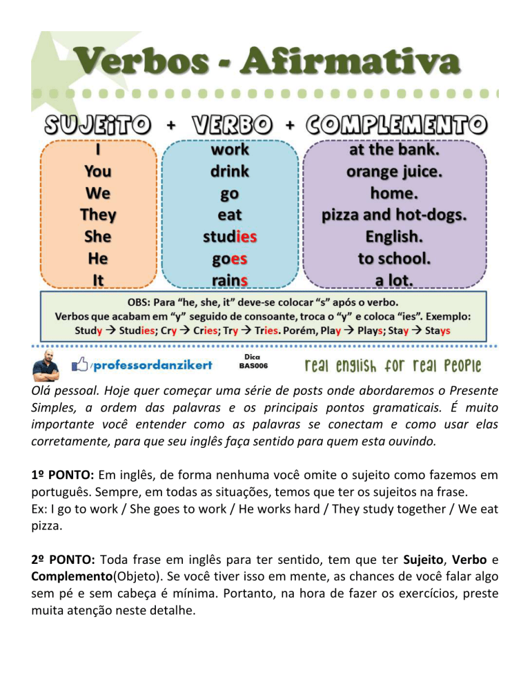 Olá pessoal. Hoje quer começar uma série de posts onde abordaremos o Presente Simples, a ordem das palavras e os principais pontos gramaticais. É muito importante você entender como as palavras se conectam e como usar elas corretamente, para que seu inglês faça sentido para quem esta ouvindo. 1º PONTO: Em inglês, de forma nenhuma você omite o sujeito como fazemos em português. Sempre, em todas as situações, temos que ter os sujeitos na frase. Ex: I go to work / She goes to work / He works hard / They study together / We eat pizza. 2º PONTO: Toda frase em inglês para ter sentido, tem que ter Sujeito, Verbo e Complemento(Objeto). Se você tiver isso em mente, as chances de você falar algo sem pé e sem cabeça é mínima. Portanto, na hora de fazer os exercícios, preste muita atenção neste detalhe. 3º PONTO: A 3º pessoa do singular, ou seja: He, She e it; sempre tem uma ‘frescura’ com eles. Preste muita atenção, na afirmativa, você é obrigado acrescentar o ‘s’ no verbo. Porém verbos que acabam em “y” seguido de consonante, troca-se para “ies”. Verbos que acabam em “y” seguido de vogal, só acrescenta ‘s’ mesmo. Verbos que acabam em: CH, SH, O, SS, X acrescenta-se “es”. Exemplos: Watch – Watches; Wash – Washes; Do – Does; Kiss – Kisses; Fix – Fixes. 4º PONTO: O complemento pode ser um objeto, uma pessoa ou simplesmente mais informações sobre o verbo que esta sendo executado. Exemplo: I work with him – Eu trabalho com ele. (Objeto pessoa) I work hard at the factory – Eu trabalho duro na fábrica (Informação complementar) Acredito ser esses os principais pontos, para você a partir de hoje começar a trabalhar com verbos e se fazer entendido de forma mais clara e objetiva. Tenha sempre esses em mentes esses pontos, e pratique muito. Vou deixar abaixo um link com muitos exercícios para você praticar e trainar muito. Bons estudos. Até a próxima. EXERCISES 1 Reescreva os verbos abaixo, acrescentando ‘s’, ‘ies’ ou ‘es’. 1 (read) She ………………………………………… 7 (close) It …………………………………………… 2 (think) He ………………………………………… 8 (like) She ………………………………………….. 3 (fly) It……………………………………………….. 9 (speak) He ………………………………………… 4 (dance) He………………………………………… 10 (open) It …………………………………………. 5 (have) She…………………………………………. 11 (teach) She ……………………………………… 6 (finish) It……………………………………………. 12 (wash) He ……………………………………….. 2 Escreva frases afirmativas. Você tem o sujeito, o verbo e o complemento. Não esqueça do ‘S’ para a 3º pessoa do singular. Siga o exemplo abaixo: 1 (he / go to school every day) He goes to school every day. 2. (I / like swimming) 3. (you / play badminton on Saturdays) 4. (the class / begin at 9 a.m.) 5. (they / sometimes go to the cinema) 6. (she / love chocolate) 7. (we / study French) 8. (they / live in London) 9. (he / work in a restaurant) 10. (Lucy / play the guitar) 11. (we / cook every day) 12. (he / clean the house at the weekends) 13. (I / like reading detective stories) 14. (you / come from France) 15. (John and David / often go to restaurants) 16. (Susie / study English every night) 17. (the train / leave at 6 p.m.) 18. (we / go to the park on Sundays) 19. (he / likes taking photographs) 20. (the moon / go round the earth) 3 Escreva frases afirmativas. Você tem o sujeito, o verbo e o complemento. Não esqueça do ‘S’ para a 3º pessoa do singular. 1. (we / often watch TV) 2. (I / hate mushrooms) 3. (she / visit her grandmother every Christmas) 4. (they / use the Internet every evening) 5. (you / often go swimming) 6. (John / hate waiting for the bus) 7. (Lucy and Jill / want to go out tonight) 8. (I / usually stay at home on Fridays) 9. (he / love driving fast cars) 10. (they / often have parties) 11. (she / take a piano lesson every Monday) 12. (we / like watching French films) 13. (you / go to bed very early) 14. (I / always eat breakfast) 15. (they / often arrive late) 16. (he / live in Beijing) 17. (David / work in a school) 18. (she / read a lot of novels) 19. (the Queen / like her dogs) 20. (I / cook almost every night) Respostas neste link: https://drive.google.com/folderview?id=0B7RTz8s3gC1QdVJ6SGxuSVFWQVE&tid=0B7RTz8s 3gC1QMkpNX0xFOEx5MkU