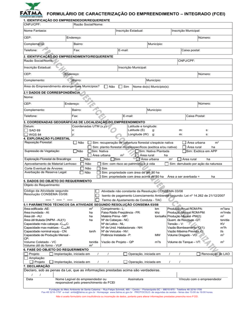 FORMULÁRIO DE CARACTERIZAÇÃO DO EMPREENDIMENTO – INTEGRADO (FCEI) 1. IDENTIFICAÇÃO DO EMPREENDEDOR/REQUERENTE CNPJ/CPF: Razão Social/Nome: Nome Fantasia: Inscrição Estadual: CEP: Inscrição Municipal: Endereço: Complemento: Bairro: Telefone: Fax: Número: Município: E-mail: Caixa postal: 2. IDENTIFICAÇÃO DO EMPREENDIMENTO/REQUERENTE Razão Social/Nome: Inscrição Estadual: CNPJ/CPF: Inscrição Municipal: CEP: Endereço: Complemento: Número: Bairro: Município: Área do Empreendimento abrange mais Municípios? Não Sim Nome do(s) Município(s): 2.1 DADOS DE CORRESPONDÊNCIA Nome: CEP: Número: Endereço: Complemento: Bairro: Telefone: Fax: Município: E-mail: Caixa Postal: 3. COORDENADAS GEOGRÁFICAS DE LOCALIZAÇÃO DO EMPREENDIMENTO Datum: Coordenadas UTM (x,y): Latitude e longitude: Latitude (S) x: g: SAD 69 Longitude (W): g: y: WGS 84 4. EXPLORAÇÃO FLORESTAL Reposição Florestal: Não Sim: recuperação de cobertura florestal c/espécie nativa Exploração Florestal de Bracatinga: Sim: plantio florestal monoespecíficos (exótica e/ou nativa) Sim: Nativa Sim: Nativa Plantada Área urbana m2 Área rural ha Não Sim Área urbana m2 Aproveitamento de Material Lenhoso: Não Sim: com risco ao patrimônio e à vida Corte Eventual de Árvores: Averbação de Reserva Legal: Não Não Sim Sim: propriedade com área de até 50 ha Sim: propriedade com área acima de 50 ha Supressão de Vegetação: Não m: m: s: s: m2 Área urbana Área rural ha Sim: Exótica em APP Área rural ha Sim: derrubado por ação da natureza Área a ser averbada = ha 5. DADOS DO OBJETO DO REQUERIMENTO Objeto do Requerimento: Código da Atividade segundo Resolução CONSEMA 03/08: . . Atividade não constante da Resolução CONSEMA 03/08 Isento de pagamento Licenciamento Ambiental segundo: Lei nº 14.262 de 21/12/2007 Termo de Ajustamento de Conduta - TAC 5.1 PARÂMETROS TÉCNICOS DA ATIVIDADE SEGUNDO RESOLUÇÃO CONSEMA 03/08 Área edificada -AE: m2 Comprimento - L: km Área inundada - AI: ha Faixa Rádio Freqüência - FR: khz Área útil - AU: ha Matéria Prima - MP: ton/safra Área útil titulada DNPM - AU(1): ha Nº de Cabeças - NC: Capacidade máx cabeças -CmáxC: Nº de Leitos - NL: Capacidade max matrizes - CmáxM: Nº de Unid. Habitacionais - NH: Capacidade nominal equip - CN: ton/h Nº de Veículos - NV: Capacidade de Produção Mensal Potência Instalada - P: MW CP: Volume Coletado - VC ton/dia Vazão de Projeto - QP m3/s Volume útil do forno - VUF m3 6. FASE DO OBJETO DO REQUERIMENTO Projeto Implantação, iniciada em / / Operação, iniciada em Ampliação: Projeto Implantação, iniciada em / / Operação, iniciada em 7. DECLARAÇÃO Declaro, sob as penas da Lei, que as informações prestadas acima são verdadeiras . / Data Produção Anual ROM-PA: Produção Mensal ROM-PM: Produção Mensal -PM(2): Quant. de Resíduos -QT: Tensão – V: Vazão Bombeamento -Q(1): Vazão Máxima Prevista -Q: Volume Dragado - VD: m3/ano m3/mês m2 ton/dia KV m3/h l/s m3 Volume do Tanque – VT: m3 / / / / Renovação de LAO / Nome Legível do empreendedor ou responsável pelo preenchimento do FCEI Assinatura Vínculo com o empreendedor Fundação do Meio Ambiente de Santa Catarina – Rua Felipe Schmidt, 485 – Centro – Florianópolis-SC – 88010-970 - Telefone 48 3216-1700 Fax 48 3216-1797 e-mail [email protected] Homepage www.fatma.sc.gov.br PROTOCOLO: de segundas às sextas - feiras das 13:00 às 19:00 horas. Não é aceito formulário com insuficiência ou incorreção de dados, portanto para alterar informações prestadas preencha novo FCEI. Apresentação O Formulário de Caracterização do Empreendimento-Integrado - FCEI é utilizado para cadastramento de empreendedores e empreendimentos junto a FATMA, e constitui-se em instrumento para caracterização de empreendimentos/atividades. Após a digitação dos dados do FCEI, o Sistema Integrado de Informação Ambiental – SINFAT gera automaticamente a Instrução Normativa – IN correspondente ao empreendimento/atividade requerida. Você pode preencher este formulário de forma manual ou não. Porém lembre-se sempre da importância das assinaturas, e dos documentos a serem anexados. 1. IDENTIFICAÇÃO DO EMPREENDEDOR/REQUERENTE EMPREENDEDOR/REQUERENTE Pessoa física ou jurídica responsável pelo empreendimento e/ou atividade objeto do requerimento. Ex.: Vale do Rio Claro Mineração S/A; Município de Tubarão; Transportadora Céu Azul Ltda; Laticínios Porto Seguro S/A; Eduardo Silva Firma Individual Ltda; Fazenda Boa Nova, José Antônio da Silva, etc. (Não se trata do consultor ou empresa de consultoria). CNPJ/CPF: Razão Social/Nome: Nome Fantasia: Inscrição Estadual: Inscrição Municipal: CNPJ/CPF: Informar o CNPJ se pessoa jurídica ou CPF se pessoa física, do empreendedor/requerente. RAZÃO SOCIAL/NOME: Informar Razão Social/Nome da pessoa física ou jurídica do empreendedor/requerente responsável pelo empreendimento e/ou atividade. NOME FANTASIA: Informar o Nome Fantasia do empreendedor/requerente, se houver. INSCRIÇÃO ESTADUAL: Informar o da Inscrição Estadual do empreendedor/requerente, se for o caso. INSCRIÇÃO MUNICIPAL: Informar o da Inscrição Municipal do empreendedor/requerente, se for o caso. CEP: Endereço: Complemento: Bairro: Telefone: Fax: Número: Município: E-mail: Caixa postal: CEP: Informar o CEP do endereço do empreendedor/requerente. ENDEREÇO: Preencher os dados relativos ao tipo e nome do logradouro do empreendedor/requerente. Por exemplo: Rua das Flores, Avenida Santa Catarina, Rodovia SC-401, etc. NÚMERO: Informar número. COMPLEMENTO: Informar o complemento, se houver (bloco, sala, apto.). BAIRRO: Informar o bairro (nome do bairro, localidade, linha). MUNICÍPIO: Informar o nome no Município. TELEFONE: Informar o número do telefone, indicando o código DDD (Ex.: 48 3216-1700). FAX: Informar o número do Fax, indicando o código DDD (Ex.: 48 3216-1797). E-MAIL: Informar o endereço de 