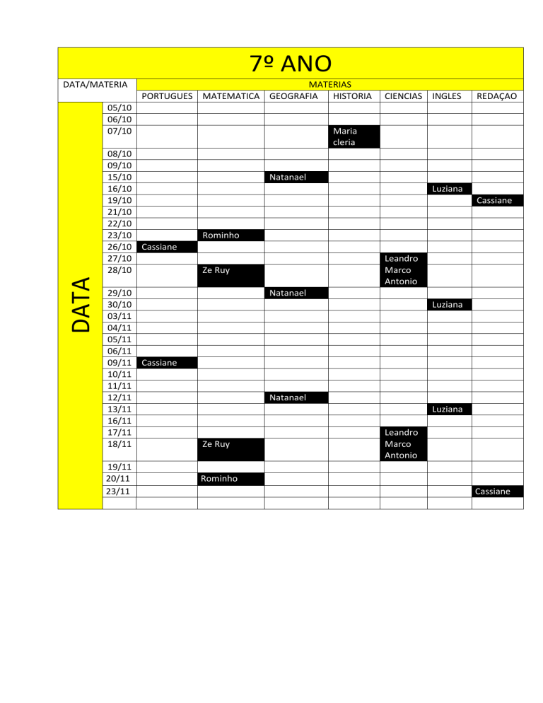 7º ANO DATA/MATERIA MATERIAS PORTUGUES MATEMATICA GEOGRAFIA HISTORIA 05/10 06/10 07/10 DATA 08/10 09/10 15/10 16/10 19/10 21/10 22/10 23/10 26/10 Cassiane 27/10 28/10 29/10 30/10 03/11 04/11 05/11 06/11 09/11 Cassiane 10/11 11/11 12/11 13/11 16/11 17/11 18/11 19/11 20/11 23/11 CIENCIAS INGLES REDAÇAO Maria cleria Natanael Luziana Cassiane Rominho Leandro Marco Antonio Ze Ruy Natanael Luziana Natanael Luziana Ze Ruy Leandro Marco Antonio Rominho Cassiane