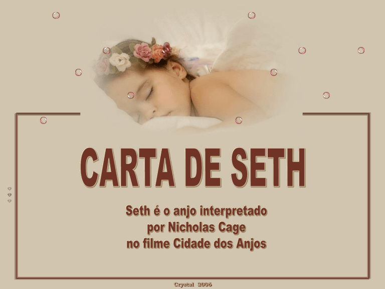 Crystal 2006 Sou feito de sentimentos, emoções, de luz, de amor. Sou a voz que você ouve quando pede um conselho, sou quem te toma nos braços quando necessita, talvez, agora, enquanto lê essas palavras, eu esteja aí, ao seu lado, olhando dentro dos seus olhos como quem quisesse enxergar o que teu coração demonstra... Mais tarde... à noite, quando você se deita... sou quem nina seus sonhos sentado ao seu lado esperando você dormir... dizendo que tudo vai ficar bem. Se ao menos você pudesse me perceber, se notasse o que sinto ao seu lado... Basta você querer, basta por alguns instantes esquecer seus problemas, fechar os olhos, como se nada mais existisse, me deixe chegar perto de ti... te abraçando... sinta meu coração batendo ao compasso do teu... sinta que não está sozinha, nunca esteve! Apenas esqueceste de olhar mais com os olhos do teu coração... Então abra os olhos... veja os meus... me conheça. Quem sou eu pra pedir para que me note? Apenas um anjo que se deixa levar por suas emoções, que desconhece o que é errado... se entrega, se rende... vagando por estrelas, nuvens, pelo céu escuro da noite... olhando pelos outros, despertando amores, anseios, paz nas almas que fraquejam! Sentado ali de cima te olhando... te observando... deixando, às vezes, uma lágrima cair e se fazer uma gota de sereno que te toca os lábios... lágrima essa por não poder nada mais que apenas te ver... sentir sem poder tocar. Manifestando através de pequenas coisas, como um sorriso sincero nos lábios de alguém que você não conhece, o toque de uma criança a te fazer carinho, palavras escritas nas páginas de um livro que te chamam atenção, palavras que mexem e emocionam o coração ditas do nada, como um sussurro em seu ouvido... E se um dia uma brisa leve e suave tocar seu rosto, não tenha medo, é apenas minha saudade que te beija em silêncio. Os humanos têm um hábito muito peculiar de julgar seus semelhantes por sua aparência, de rotular pessoas as quais nunca viram... apenas pelo modo como ela se apresenta... porém, consigo ver dentro de cada um o que realmente são... E me assusto algumas vezes em como podem os humanos deixar-se levarem por embalagens, por invólucros... deixam de terem muitas vezes ao seu lado verdadeiros tesouros, amizade sincera, lealdade, companheirismo... simplesmente por não terem gostado do rosto do indivíduo. Imagine uma roseira cheia de espinhos, ninguém acreditaria que dela pudesse brotar uma rosa tão bela, sensível e delicada.! É do interior que nascem as flores. Pude conhecer seu interior... me deparei com uma flor linda... e com muitas qualidades. Muitas vezes é melhor sermos o que realmente somos... a viver como as pessoas acham que deveríamos ser... Não existe ninguém melhor, ou pior que ninguém... apenas diferentes umas das outras e essas diferenças são que mostram quem realmente você é. Fico assim... dizendo as coisas que me aparecem dentro do peito, contando o que se passa em mim, como se estivesse desabafando... pois Deus nos fez para cuidar dos outros... e quem cuidará de nós? Continuarei aqui... meio que escondido, ao teu lado, te olhando, te sentindo... esperando para que um dia você deixe seu coração "olhar" e me ver... Daí, enfim, poderia eu mostrar o quanto você é especial pra mim. Um poema deixado no ar, palavras implorando para viver como uma estrela que o dia não vê e que espera a noite chegar para poder mostrar-se, A canção de amor que sai da sua boca... são as coisas que sempre sussurro ao seu coração! Tento traduzir emoções que nunca senti antes, algo realmente novo pra mim, Paz, Átração, Paixão, Amor... Algo especial... Sincero... Verdadeiro! CLIQUE AQUI para informações sobre O CD de PPS Crystal CLIQUE AQUI Receba novos PPS Gotas de Crystal Musica: Sarah Mclachlan - In The Arms Of The Angel