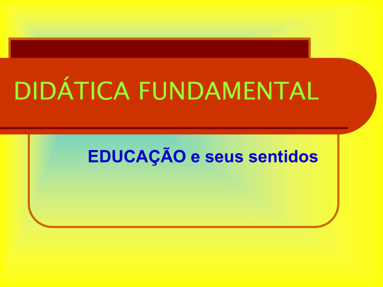 DIDÁTICA FUNDAMENTAL EDUCAÇÃO e seus sentidos Fenômeno Realidade mutável Quem é educador? Algumas definições Concepções naturalistas ( inatistas) Ênfase nos fatores biológicos do desenvolvimento. A educação e o ensino devem adaptarse à natureza biológica e psicológica da criança e às tendências de seu desenvolvimento que estavam basicamente prontas desde o nascimento. Finalidade: Tirar para fora o que já existe dentro do indivíduo. Concepções pragmáticas Educação é um processo imanente ao desenvolvimento humano cujo resultado é a adaptação do indivíduo ao meio social. É pela experiência que o indivíduo desenvolve suas funções cognitivas. Finalidade: se confunde com o processo de desenvolvimento. Jonh Dewey – a criança é o ponto de partida , o centro e o fim; seu desenvolvimento e seu crescimento – o ideal. Concepções espiritualistas Educação é um processo interior mediante o qual cada pessoa vai se aperfeiçoando. Busca o fim último da vida que é regenerar o homem corrompido pelo pecado original, preparando-o para a vida eterna. Deve-se cultivar as faculdades mentais para atingir o ideal de perfeição cujo modelo é Cristo. Concepções culturalistas Atividade cultural dirigida à formação dos indivíduos mediante a transmissão de bens culturais que se transformam em forças espirituais internas no educando. Para formar sua vida interior e sua personalidade o indivíduo se apropria dos valores culturais e com isso pode criar mais cultura. Concepções ambientalistas 1 Jogam no ambiente externo toda a força de atuação sobre o indivíduo para configurar sua conduta às exigências da sociedade. Durkheim – é a sociedade que propicia valores, idéias, regras, às quais o espírito do educando deve submeter-se. É uma imposição ao educando de maneiras de ver, de sentir e de agir em consonância com os valores sociais. Concepções Ambientalistas 2: Behavioristas O homem é um ser moldável e suas características se desenvolvem mediante a ação do ambiente externo. A educação é a organização de situações estimuladoras pelas quais se controla o comportamento das pessoas sem considerar seu raciocínio, desejos, fantasias e sentimentos. Concepções interacionistas O ser humano se desenvolve biológica e psicologicamente na interação com o ambiente, implicando a interação entre o sujeito e o meio. A aprendizagem é um processo interativo em que os sujeitos constroem seus conhecimentos através da sua interação com o meio numa inter-relação constante entre fatores internos e externos. Concepção histórico-social O processo educativo é um fenômeno social enraizado nas contradições, nas lutas sociais de modo que é nos embates da práxis social que vai se configurando o ideal de formação humana. A educação é uma atividade intencionalizada – uma prática social cunhada como influência do meio social sobre o desenvolvimento dos indivíduos na sua relação ativa com o meio natural e social, tendo em vista potencializar essa atividade humana para tornála mais rica, mais produtiva, mais eficaz diante das tarefas da práxis social postas num dado sistema de relações sociais. Formação humana – dimensões homem integral ( omnilateral) Intelectual ou cognitiva Social Afetiva Física Estética Ética Espiritual SISTEMA Conjunto articulado e coordenado de princípios, instituições, estruturas, processos, para atingir determinados objetivos. Sistema educacional Compreende ações educativas de caráter formal e não-formal que guardam o caráter de intencionalidade e institucionalidade.