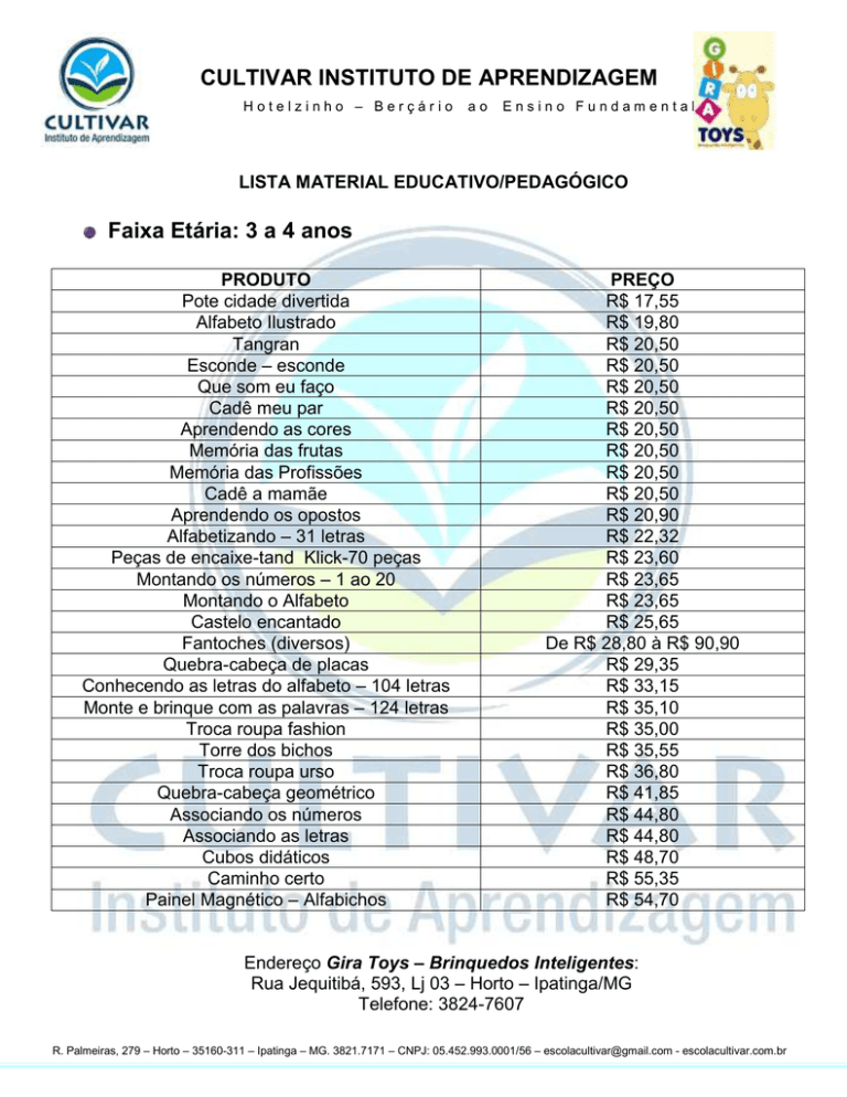 CULTIVAR INSTITUTO DE APRENDIZAGEM Hotelzinho – Berçário ao Ensino Fundamental 1 LISTA MATERIAL EDUCATIVO/PEDAGÓGICO Faixa Etária: 3 a 4 anos PRODUTO Pote cidade divertida Alfabeto Ilustrado Tangran Esconde – esconde Que som eu faço Cadê meu par Aprendendo as cores Memória das frutas Memória das Profissões Cadê a mamãe Aprendendo os opostos Alfabetizando – 31 letras Peças de encaixe-tand Klick-70 peças Montando os números – 1 ao 20 Montando o Alfabeto Castelo encantado Fantoches (diversos) Quebra-cabeça de placas Conhecendo as letras do alfabeto – 104 letras Monte e brinque com as palavras – 124 letras Troca roupa fashion Torre dos bichos Troca roupa urso Quebra-cabeça geométrico Associando os números Associando as letras Cubos didáticos Caminho certo Painel Magnético – Alfabichos PREÇO R$ 17,55 R$ 19,80 R$ 20,50 R$ 20,50 R$ 20,50 R$ 20,50 R$ 20,50 R$ 20,50 R$ 20,50 R$ 20,50 R$ 20,90 R$ 22,32 R$ 23,60 R$ 23,65 R$ 23,65 R$ 25,65 De R$ 28,80 à R$ 90,90 R$ 29,35 R$ 33,15 R$ 35,10 R$ 35,00 R$ 35,55 R$ 36,80 R$ 41,85 R$ 44,80 R$ 44,80 R$ 48,70 R$ 55,35 R$ 54,70 Endereço Gira Toys – Brinquedos Inteligentes: Rua Jequitibá, 593, Lj 03 – Horto – Ipatinga/MG Telefone: 3824-7607 R. Palmeiras, 279 – Horto – 35160-311 – Ipatinga – MG. 3821.7171 – CNPJ: 05.452.993.0001/56 – [email protected] - escolacultivar.com.br
