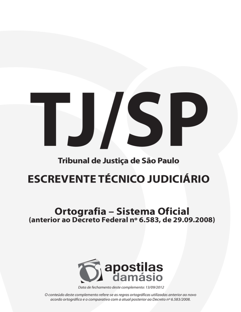 TJ/SP Tribunal de Justiça de São Paulo ESCREVENTE TÉCNICO JUDICIÁRIO Ortografia – Sistema Oficial (anterior ao Decreto Federal nº 6.583, de 29.09.2008) Data de fechamento deste complemento: 13/09/2012 O conteúdo deste complemento refere-se as regras ortográficas utilizadas anterior ao novo acordo ortográfico e o comparativo com a atual posterior ao Decreto nº 6.583/2008. 2012 Proibida a reprodução total ou parcial. Os infratores serão processados na forma da legislação vigente. Direitos exclusivos para a língua portuguesa cedidos à ACJ Editora LTDA. Rua da Glória, 195 – sala 206 – Liberdade CEP: 01510-001– São Paulo – SP – Brasil Tel.: (11) 3274-7153 www.apostilas.damasio.com.br Ortografia ORTOGRAFIA Letra Z Derivadas de primitivas com z: enraizar (raiz), vazar (vazio). Emprego de letras Sufixo -izar: liga-se a substantivos e adjetivos quando a letra s não fizer parte do radical da palavra de origem: real/ realizar; moderno/modernizar; terror/aterrorizar; útil/utilizar; economia/economizar. Letra H Inicial, quando etimológico: horizonte, hulha. Medial, como integrante dos dígrafos ch, lh, nh: chamada, molha, sonho. Em algumas interjeições: oh!, hum!. Em palavras compostas unidas por hífen, se algum elemento começa com h: hispano-americano, super-homem. Palavras compostas ligadas sem hífen não são escritas com h. Exemplo: reaver (derivado do verbo haver) No substantivo próprio Bahia (Estado do Brasil), por tradição. As palavras derivadas desta são escritas sem h: baiano. Sufixo -ez(a) formador de substantivos abstratos: timidez, viuvez. Na formação do diminutivo de palavras que não possuem s: florzinha, pezinho. Exceções: catequizar/catequese; batizar/batismo. Letras SS Terminação dos superlativos sintéticos e do imperfeito de todos verbos: belíssimo, fôssemos. Letra E Prefixo ante- (antes, anterior): antecipar, antebraço. Algumas formas de verbos terminados em -oar, -uar: doem (doar), flutuem (flutuar). Palavras/radicais iniciados por s que entram na formação de palavras derivadas ou compostas: homossexual (homo + sexual). Atenção para as correlações Letra I Prefixo anti- (contra): antipatia, antitetânico. Algumas formas de verbos terminados em -uir: possui (possuir), retribui (retribuir). Letra G Derivadas de palavras que possuam g: rabugento (rabugem), selvageria (selvagem). Palavras terminadas em -agem, -igem, -ugem, -ágio, -égio, -ígio, -ógio, -úgio: garagem, vertigem, ferrugem, relógio, refúgio, estágio, colégio, prodígio. Exceções: pajem e lambujem. Letra J Derivadas de palavras que possuam j e verbos que terminem em -jar ou -jear: gorjeta (gorja), nojento (nojo), cerejeira (cereja), arranjar (arranjo, arranjaria). Palavras de origem africana ou indígena: jiló, Ubirajara, acarajé. Verbo com Substantivo com S nd – estender ns – extensão rg – imergir rs – imersão rt – inverter rs – inversão pel – impelir puls – impulso corr – correr curs – cursivo Verbo com Substantivo com SS ced – ceder cess – cessão gred – agredir gress – agressão prim – comprimir press – compressão tir – admitir ssão – admissão Letra Ç (Só é grafado antes de a, o, u). Palavras derivadas de primitivas escritas com ç: embaçado (embaço). Verbos terminados em -ecer, -escer: anoiteça (anoitecer), desça (descer). Palavras de origem árabe, indígena e africana: paçoca, muçulmano, miçanga. Letra S Derivadas de primitivas com s: visitante (visita), casinha (casa). Nas formas dos verbos pôr, querer e seus derivados (repor, requerer): pusesse, quisesse. Após um ditongo: maisena, pausa (Maizena é um substantivo próprio, marca registrada). Sufixo -oso formador de adjetivos: amoroso, atencioso. Sufixos -isa, -ês, -esa usados na constituição de vocábulos que indicam profissão, nacionalidade, estado social e títulos: baronesa, norueguês, sacerdotisa, cortês, camponês. Verbos terminados em -isar: são formados por palavras cujo radical termina em s e ganham o sufixo -ar (terminação verbal da 1ª conjugação): liso/alisar; análise/analisar; aviso/ avisar; bis/bisar; friso/frisar; paralisia/paralisar; pesquisa/ pesquisar; piso/pisar; preciso/precisar. Exceção: catequese/ catequizar. Letra X Depois de ditongo: peixe, ameixa, caixa, frouxo. Depois da sílaba me-: mexer, mexerico. Exceção: mecha (cabelo). Depois da sílaba en-: enxoval. Exceções: encher, encharcar, enchumaçar e derivados. Palavras de origem indígena/africana: orixá, abacaxi. Letras CH Palavras derivadas de latinas escritas com pl, fl e cl: chumbo (plúmbeo), chave (clave) Verbos encher (cheio), encharcar (charco), enchumaçar (chumaço), enchoçar (choça) e derivados. 1 Língua Portuguesa Grafam-se com C, Ç A seguir, algumas palavras que podem oferecer dúvidas: Acetinado, açafrão, almaço, anoitecer, censura, cimento, dança, dançar, contorção, exceção, endereço, Iguaçu, maçarico, maçaroca, maço, maciço, miçanga, muçulmano, muçurana, paçoca, pança, pinça, suíça, suíço, vicissitude etc. Grafam-se com a letra E Arrepiar, cadeado, candeeiro, cemitério, Cireneu, confete, creolina, cumeeira, desperdiçar, desperdício, destilar, disenteria, empecilho, encarnar, encarnação, energúmeno, homogêneo, indígena, irrequieto, lacrimogêneo, mexerica, mexerico, mimeógrafo, orquídea, quase, quepe, senão, sequer, seriema, seringa, umedecer, Zeferino. Grafam-se com S Ânsia, ansiar, ansioso, ansiedade, cansar, cansado, descansar, descanso, diversão, excursão, farsa, ganso, hortênsia, pretensão, pretensioso, propensão, remorso, sebo, siso, tenso, utensílio etc. Grafam-se com a letra I Aborígine, açoriano, angioma, artifício, artimanha, bilíngue, camoniano, Casimiro, chefiar, cimento, crânio, criar, criador, criação, crioulo, digladiar, disenteria, displicência, displicente, erisipela, escárnio, feminino, Filipe, frontispício, lfigênia, inclinar, inclinação, incinerar, inigualá