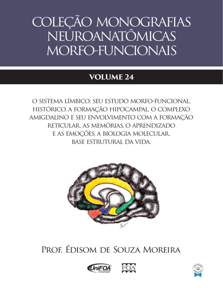 COLEÇÃO MONOGRAFIAS NEUROANATÔMICAS MORFO-FUNCIONAIS VOLUME 24 O SISTEMA LÍMBICO: SEU ESTUDO MORFO-FUNCIONAL, HISTÓRICO. A FORMAÇÃO HIPOCAMPAL, O COMPLEXO AMIGDALINO E SEU ENVOLVIMENTO COM A FORMAÇÃO RETICULAR. AS MEMÓRIAS, O APRENDIZADO E AS EMOÇÕES. A BIOLOGIA MOLECULAR, BASE ESTRUTURAL DA VIDA. Prof. Édisom de Souza Moreira CENTRO UNIVERSITÁRIO DE VOLTA REDONDA FUNDAÇÃO OSWALDO ARANHA COLEÇÃO MONOGRAFIAS NEUROANATÔMICAS MORFO-FUNCIONAIS Volume 24 O SISTEMA LÍMBICO: SEU ESTUDO MORFO-FUNCIONAL, HISTÓRICO. A FORMAÇÃO HIPOCAMPAL, O COMPLEXO AMIGDALINO E SEU ENVOLVIMENTO COM A FORMAÇÃO RETICULAR. AS MEMÓRIAS, O APRENDIZADO E AS EMOÇÕES. A BIOLOGIA MOLECULAR, BASE ESTRUTURAL DA VIDA. Profº. Édisom de Souza Moreira 2017 FOA FOA Presidente Dauro Peixoto Aragão Vice-Presidente Eduardo Guimarães Prado Diretor Administrativo - Financeiro Iram Natividade Pinto Diretor de Relações Institucionais José Tarcísio Cavaliere Superintendente Executivo Jairo Conde Jogaib Superintendência Geral José Ivo de Souza UniFOA Reitora Claudia Yamada Utagawa Pró-reitor Acadêmico Carlos José Pacheco Pró-reitor de Pesquisa e Pós-graduação Alden dos Santos Neves Pró-reitor de Extensão Otávio Barreiros Mithidieri Editora FOA Editor Chefe Laert dos Santos Andrade FICHA CATALOGRÁFICA Bibliotecária: Alice Tacão Wagner - CRB 7/RJ 4316 M835s Moreira, Édisom de Souza. O sistema límbico: seu estudo morfo-funcional, histórico. A formação hipocampal, o complexo amigdalino e seu envolvimento com a formação reticular. As memórias, o aprendizado e as emoções. A biologia molecular, base estrutural da vida. [recurso eletrônico]. / Édisom de Souza Moreira. - Volta Redonda: UniFOA, 2017. v.24. p.288 Il (Coleção Monografias Neuroanatômicas Morfo-Funcionais) ISBN: 978-85-5964-064-9 1. Anatomia humana. 2. Sistema límbico. I. Fundação Oswaldo Aranha. II. Centro Universitário de Volta Redonda. III. Título. CDD – 611 Profº. Édisom de Souza Moreira Professor Titular da Disciplina de Neuroanatomia Funcional do Centro Universitário de Volta Redonda (UniFOA), da Fundação Oswaldo Aranha (FOA), Curso de Medicina. Ex-Titular da Disciplina de Anatomia do Curso de Medicina do Centro Universitário de Volta Redonda (UniFOA), da Fundação Oswaldo Aranha (FOA). Ex-Titular da Disciplina de Anatomia do Curso de Odontologia do Centro Universitário de Volta Redonda (UniFOA), da Fundação Oswaldo Aranha (FOA). Ex-Titular da Disciplina de Anatomia do Curso de Educação Física do Centro Universitário de Volta Redonda (UniFOA), da Fundação Oswaldo Aranha (FOA). Ex-Titular da Disciplina de Embriologia do Curso de Odontologia do Centro Universitário de Volta Redonda (UniFOA), da Fundação Oswaldo Aranha (FOA). Ex-Titular da Disciplina de Anatomia do Curso de Enfermagem do Centro Universitário da Sociedade Barramansense de Ensino Superior (SOBEU), de Barra Mansa. Doutor em Cirurgia Geral pela Faculdade de Medicina da Universidade Federal de Minas Gerais de Belo Horizonte (U.F.M.G.). Colaboradores: Dra. Sônia Cardoso Moreira Garcia. Dr. Bruno Moreira Garcia: Assessoria Computacional Gráfica SUMÁRIO Pág.: 1. – Sistema Límico e seu Estudo Morfo-funcional: Histórico........................................01 2. – Componentes do Sistema Límbico..............................................................................09 2.1 – Componentes corticais do Sistema límbico..................................................34 3. – Principais Regiões funcionais do Sistema Límbico...................................................37 3.1 – Formação Hipocampal...................................................................................38 3.2 – Complexo Amigdalóide.........................................................................57 e 58 3.3 – Sistema Límbico e os Sistemas Neurotransmissores Monoaminérgicos..92 3.4 – Os Componentes do Sistema Límbico e suas Relações com os sistemas Motores: Endócrino, Autonômico e Somático Voluntário.............. ........114 4. – Sistema Límbico: Memória e Aprendizado..................................................... .......119 5. – O Sistema Límbico e seu envolvimento com a Formação Reticular............ ........122 6. – Sistema Límbico e Sistemas Efetores ( Motores )............................................ ......135 7. – Sistema Límbico e as Áreas corticais de Associações e Emoções................. ........151 8. – Funções do Complexo Amigdalóide................................................................ .......170 9. – Funções da Formação Hipocampal: Memória e Aprendizado................... .........177 10. Desenvolvimento do Telencéfalo, do Sistema Límbico, dos Núcleos da base e Do Diencéfalo..................................................................................................... .......240 11.Vascularização arterial das estruturas do Sistema límbico.....................................250 12. Lesões das Principais Estruturas – Chave do Sistema Límbico.............................255 ÍNDICE GERAL, SEGUNDO A ORDEM PROGRESSIVA DE LOCALIZAÇÃO DOS ASUNTOS, NO TEXTO. Pág. Sistema limbico e seu estudo morfo-funcional..................................................................... 01 Historico ............................................................................................................................... 01 Grande lobo límbico de Broca .............................................................................................. 01 Cérebro olfativo ( rinencéfalo ) ........................................................................................... 02 A Doença de Alzheimer ( Alois Alzheimer ) ....................................................................... 03 As experiências de Hess e o hipotálamo .............................................................................. 04 O Circuito de Papez ( Jame