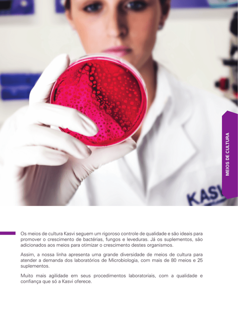 meios de cultura Os meios de cultura Kasvi seguem um rigoroso controle de qualidade e são ideais para promover o crescimento de bactérias, fungos e leveduras. Já os suplementos, são adicionados aos meios para otimizar o crescimento destes organismos. Assim, a nossa linha apresenta uma grande diversidade de meios de cultura para atender a demanda dos laboratórios de Microbiologia, com mais de 80 meios e 25 suplementos. Muito mais agilidade em seus procedimentos laboratoriais, com a qualidade e confiança que só a Kasvi oferece. meios de cultura meios de cultura modelo descrição apresentação K25-611001 Agar Bacteriológico Frasco 500 g K25-610004 Aagar Baird-Parker Base Frasco 500 g K25-610153 Agar Base Azida Sangue Frasco 500 g K25-610114 Agar Base Bacillus Cereus (Mossel) Frasco 500 g K25-610013 Agar Base Columbia Frasco 500 g K25-610134 Agar Base M-Enterococcus Frasco 500 g K25-611012 Agar Base M-FC Frasco 500 g K25-610092 Agar Base XLT 4 Frasco 500 g K25-610102 Agar Batata Dextrose Frasco 500 g K25-610210 Agar Bile Esculina Frasco 500 g K25-610059 Agar Bile Vermelho Violeta Glicose Frasco 500 g K25-610058 Agar Bile Vermelho Violeta Lactose Frasco 500 g K25-610041 Agar Cetrimide Frasco 500 g K25-610046 Agar Citrato Simmons Frasco 500 g K25-620012 Agar CLED Frasco 100 g K25-610012 Agar CLED Frasco 500 g K25-610096 Agar Clostridial Reforçado Frasco 500 g K25-610207 Agar Clostridium perfringens (SFP/TSC) Frasco 500 g K25-610040 Agar Contagem de Placas Frasco 500 g meios de cultura Fabricados através de um rigoroso controle de qualidade, os meios de cultura Kasvi foram especialmente desenvolvidos para atender à demanda de todos os laboratórios que analisam microrganismos em suas rotinas. Adequados para promover o crescimento de bactérias, fungos e leveduras nas mais diversas áreas de análise. Imagens meramente ilustrativas. Produtos não passíveis de regulamentação, conforme estabelece a nota técnica n° 001/2012/GEVIT/GGTPS/ANVISA. 143 Modelo meios de cultura Descrição Apresentação K25-610095 Agar Czapek Dox Frasco 500 g K25-610198 Agar Dextrose Triptona Frasco 500 g K25-610237 Agar Dicloran Rosa Bengala Cloranfenicol Base (DRBC) Frasco 500 g K25-610019 Agar Eosina Azul de Metileno (EMB Levine) Frasco 500 g K25-610089 Agar Extrato Glicose Triptona Frasco 500 g K25-610039 Agar Fenilalanina Frasco 500 g K25-610021 Agar Hektoen Entérico Frasco 500 g K25-620007 Agar Infusão Cérebro e Coração (BHI) Frasco 100 g K25-610007 Agar Infusão Cérebro e Coração (BHI) Frasco 500 g K25-610023 Agar Kligler Ferro (KIA) Frasco 500 g K25-610027 Agar Lisina Ferro (LIA) Frasco 500 g K25-620028 Agar Mac Conkey Frasco 100 g K25-610028 Agar Mac Conkey Frasco 500 g K25-611011 Agar M-ENDO LES Frasco 500 g K25-610024 Agar MRS Frasco 500 g K25-620627 Agar Mueller Hinton II Frasco 100 g K25-610627 Agar Mueller Hinton II Frasco 500 g K25-620033 Agar Mueller Hinton Frasco 100 g K25-610033 Agar Mueller Hinton Frasco 500 g K25-620036 Agar Nutriente Frasco 100 g K25-610036 Agar Nutriente Frasco 500 g K25-610002 Agar Peptona Dextrose Frasco 500 g K25-610129 Agar R2A Frasco 500 g K25-610203 Agar Sabouraud Cloranfenicol Frasco 500 g K25-620103 Agar Sabouraud Dextrose Frasco 100 g K25-610103 Agar Sabouraud Dextrose Frasco 500 g Imagens meramente ilustrativas. Produtos não passíveis de regulamentação, conforme estabelece a nota técnica n° 001/2012/GEVIT/GGTPS/ANVISA. 144 Descrição Apresentação K25-620029 Agar Sal Manitol Base Frasco 100 g K25-610029 Agar Sal Manitol Frasco 500 g K25-610042 Agar Salmonella Shigella (SS) Frasco 500 g K25-610005 Agar Sangue Base Frasco 500 g K25-610078 Agar Soro de Laranja Frasco 500 g K25-611401 Agar Sulfito Ferro Frasco 500 g K25-620055 Agar Tríplice Açúcar Ferro (TSI) Frasco 100 g K25-610055 Agar Tríplice Açúcar Ferro (TSI) Frasco 500 g K25-620052 Agar Triptona de Soja (TSA) Frasco 100 g K25-610052 Agar Triptona de Soja (tsa) Frasco 500 g K25-610107 Agar Ureia Base Frasco 500 g K25-610009 Agar Verde Brilhante Frasco 500 g K25-610060 Agar XLD Frasco 500 g K25-611014 Água Peptona Tamponada Frasco 500 g K25-610038 Água Peptona Frasco 500 g K25-610206 Água Triptona Frasco 500 g K25-610003 Caldo Azida Dextrose Frasco 500 g K25-610208 Caldo Base Letheen Frasco 500 g K25-610106 Caldo Batata Dextrose Frasco 500 g K25-610010 Caldo Bile Verde Brilhante 2% Frasco 500 g K25-610072 Caldo Czapek Dox Frasco 500 g K25-610091 Caldo Demi Fraser Base Frasco 500 g K25-610063 Caldo EC Frasco 500 g K25-620008 Caldo Infusão Cérebro e Coração Frasco 100 g K25-610008 Caldo Infusão Cérebro e Coração Frasco 500 g K25-611202 Caldo Lactose Frasco 500 g meios de cultura Modelo Imagens meramente ilustrativas. Produtos não passíveis de regulamentação, conforme estabelece a nota técnica n° 001/2012/GEVIT/GGTPS/ANVISA. 145 Modelo meios de cultura Descrição Apresentação K25-610085 Caldo Lauril Triptose Frasco 500 g K25-610171 Caldo Mac Conkey Frasco 500 g K25-610025 Caldo MRS Frasco 500 g K25-610032 Caldo MR-VP Frasco 500 g K25-610034 Caldo Mueller Hinton Frasco 500 g K25-610037 Caldo Nutriente Frasco 500 g K25-610175 Caldo Rappaport vassiliadis Frasco 500 g K25-610104 Caldo Sabouraud Dextrose Frasco 500 g K25-610150 Caldo Selenito Cistina Frasco 500 g K25-610163 Caldo Shigella Frasco 500 g K25-610051 Caldo Todd Hewitt Frasco 500 g K25-620053 Caldo Triptona Soja (TSB) Frasco 100 g K25-610053 Caldo Triptona Soja (TSB) Frasco 500 g K25-610497 Extrato de Carne Frasco 500 g K25-611005 Extrato de Levedura Frasco 500 g K25-611006 Extrato de Malte Frasco 500 g K25-611402 Meio de Transporte Cary-Blair Frasco 500 g K25-610022 Meio GC Frasco 500 g K25-610084 Meio LB (Luria Bertani) Frasco 500 g K25-610181 Meio SIM Frasco 500 g K25-610050 Meio Tioglicolato Frasco 500 g K25-610185 Meio Tríptico Cistina (CTA) Frasco 500 g K25-611701 Peptona Bacteriológica Frasco 500 g K25-611502 Peptona de Caseína Frasco 500 g K25-612501 Peptona de Soja Frasco 500 g K25-611004 Triptona 
