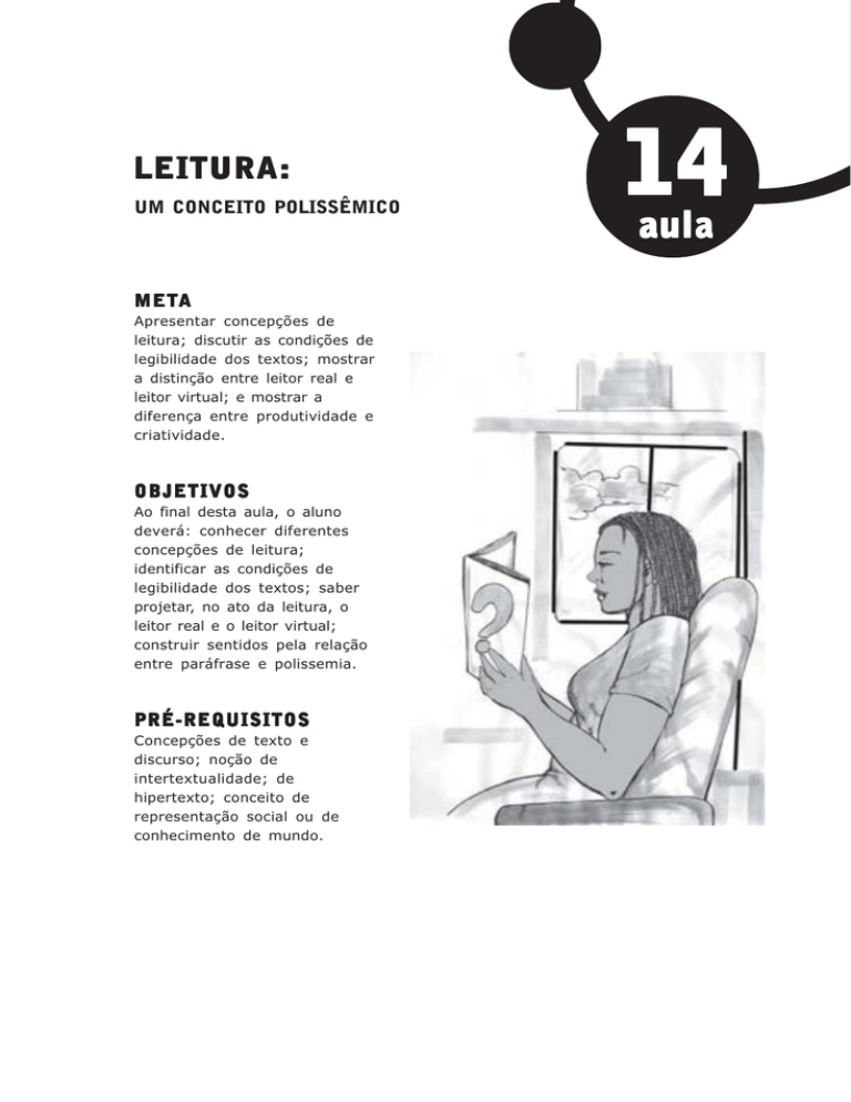 Um pouco de história: o ensino de leitura - ontem e hoje LEITURA LEITURA:: UM CONCEITO POLISSÊMICO MET A META Apresentar concepções de leitura; discutir as condições de legibilidade dos textos; mostrar a distinção entre leitor real e leitor virtual; e mostrar a diferença entre produtividade e criatividade. OBJETIVOS Ao final desta aula, o aluno deverá: conhecer diferentes concepções de leitura; identificar as condições de legibilidade dos textos; saber projetar, no ato da leitura, o leitor real e o leitor virtual; construir sentidos pela relação entre paráfrase e polissemia. PRÉ-REQUISITOS Concepções de texto e discurso; noção de intertextualidade; de hipertexto; conceito de representação social ou de conhecimento de mundo. 14 aula Produção e Recepção de Textos I N ão existe um conceito fixo de leitura, mas vários. Conceituaremos a leitura desde sua perspectiva mais ampla até a mais específica, de sorte a oferecer-lhe um painel rico dessa prática que nos acompanha em todos os momentos do dia. Ler implica ressignificar as coisas do mundo. A ressignificação altera o foco sobre a coisa INTRODUÇÃO significada, modificando-a. Por isso, ler é sempre saber que o sentido poderia ser outro. Você poderá discutir também se a legibilidade dos textos é uma questão interna ao texto ou depende de certas condições de produção da leitura. Poderá distinguir ainda dois tipos de leitor: o real e o virtual, bem como suas implicações no ato de escrita e/ou leitura de textos. Finalmente, estabelecerá a diferença entre produtividade e criatividade (Fonte: http://www.belezanegra.com). 156 Leitura: um conceito polissêmico O 14 aula conceito mais genérico de leitura é aquele que a toma como “atribuição de sentidos”. Nesse caso, ler pode ser utilizado tanto para a escrita quanto para a oralidade, visto que qualquer uso de linguagem, mesmo não-verbal, nos possibilita atribuir sentidos. De acordo com essa acepção, podemos falar em leitura tanto da fala cotidiana quanto de CONCEPÇÕES um texto de Machado de Assis, assim como de um sinal de trânsito ou de um quadro numa exposição. Leitura pode significar também “concepção”. Nesse caso, falamos de “leitura de mundo” e de suas implicações com a ideologia e com a cultura, por meio das representações ou conhecimentos de mundo dos diferentes grupos sociais. No sentido acadêmico, mais específico e restrito, leitura pode significar a construção de um suporte teórico-metodológico de abordagem de um texto: são as várias leituras de Platão ou de Shakespeare, por exemplo. Finalmente, em um sentido ainda mais restritivo, em termos de escolaridade, leitura circunscreve-se à alfabetização. Nesse caso, ela assume caráter de estrita aprendizagem formal. Poderíamos seguir elencando outras concepções de leitura, porém nos ocuparemos apenas das mais relevantes aqui apresentadas. Salientamos também que a interpretação e a compreensão, que serão oportunamente desenvolvidas na próxima aula, delimitam tais concepções de leitura. CONCEITO DE LEGIBILIDADE O que torna um texto legível? Essa questão nos leva a pensar que um texto bem escrito torna-se legível. Entretanto, perguntamos: bem escrito para quem? Legível para quem? Para Orlandi (1988), é a natureza da relação que alguém estabelece com o texto que está na base da caracterização da legibilidade. Além disso, para a autora, a legibilidade é uma questão de “graus”, e não de polari- 157 Produção e Recepção de Textos I dades entre legível versus ilegível. Em sentido amplo, os graus de legibilidade dependem das condições de produção sócio-históricas. Com o objetivo de melhor situarmos a questão da legibilidade, devemos admitir primeiramente a existência de dois tipos de leitores que concorrem nesse processo. O primeiro é o leitor virtual ou imaginário constituído no próprio ato da escrita, isto é, aquele que o autor imagina como leitor ideal para o seu texto. Esse leitor tanto pode ser seu “cúmplice” quanto seu “adversário”. O segundo é o leitor real, aquele que, de fato, lê o texto, apropriando-se dele. É errôneo pensar que o leitor real interage com o texto, o que caracterizaria um tipo de relação entre sujeito e objeto. Há, de fato, relação entre o leitor real e outro(s) sujeito(s), como leitor virtual, autor, etc. Assim, a relação da leitura se dá entre homens e, como tal, sua natureza é não apenas social, mas também histórica. O texto é apenas o centro comum de mediação de sentidos entre os participantes. Leitura e sentido, ou melhor, sujeitos e sentidos se constituem simultaneamente, num mesmo processo. Mas não é só esta relação que pode indicar a dinâmica do processo de leitura, há também, segundo Orlandi (1988), as condições de produção que orientam a participação do leitor real nesse processo. Eis algumas delas: a) relação do texto com o autor: o que o autor quis dizer? b) relação do texto com outros textos: em que este texto difere ou se assemelha a tal(is) texto(s)? c) relação do texto com seu referente: o que o texto diz de X? d) relação do texto com o leitor: o que você entendeu? Todos esses componentes das condições de produção da leitura instauram dois processos antagônicos de produção de sentidos: o parafrástico e o polissêmico. O processo parafrástico é o que permite a produção do mesmo sentido sob diferentes formas do dizer. Já o processo polissêmico é aquele que responde pelo fato de que são sempre possíveis sentidos diferentes, múltiplos. 158 Leitura: um conceito polissêmico A tensão do mesmo com o diferente é que constitui o conflito entre o sentido institucionalizado e legitimado e aquilo que, no domínio da polissemia, tem de se institucionalizar para se legitimar. Decorre também dessa tensão a diferença entre produtividade e criatividade. A primeira tende ao parafrástico e a segunda ao polissêmico. 