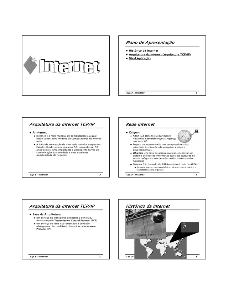 Plano de Apresentação Histórico da Internet Arquitetura da Internet (arquitetura TCP/IP) Nível Aplicação Cap. 9 —INTERNET Arquitetura da Internet TCP/IP Rede Internet A Internet Internet é a rede mundial de computadores, à qual estão conectados milhões de computadores do mundo todo; A idéia de concepção de uma rede mundial surgiu nos Estados Unidos ainda nos anos 50, tornando-se, 50 anos depois, uma importante e abrangente forma de comunicação da sociedade e uma excelente oportunidade de negócios Origem ARPA (U.S Defense Department's Advanced Research Projects Agency) nos anos 60 Projeto de interconexão dos computadores das principais instituições de pesquisa, ensino e governamentais Objetivo: em caso de ataque nuclear, encontrar um sistema de rede de informação que seja capaz de se auto-configurar caso uma das malhas venha a não funcionar Sistema foi chamado de ARPAnet (isto é rede da ARPA). Cap. 9 —INTERNET 3 Arquitetura da Internet TCP/IP 2 fornecia apenas serviços básicos de correio eletrônico e transferência de arquivos Cap. 9 —INTERNET 4 Histórico da Internet Base da Arquitetura um serviço de transporte orientado à conexão, fornecido pelo Transmission Control Protocol (TCP) um serviço de rede não-orientado à conexão (datagrama não confiável), fornecido pelo Internet Protocol (IP) Sputnik, 1957 Cap. 9 —INTERNET 5 Cap. 9 —INTERNET 6 Introdução Introdução Origem dos protocolos TCP/IP Criação Agency) da ARPA (Advanced Research Project Implementação da ARPANET 1968 — Interconexão de 4 universidades americanas (Stanford, Berkeley, UCLA, Utah) Definição de uma rede para garantir a comunicação na eventualidade de um ataque nuclear 1964/1967 — Projeto de uma rede baseada em comutação de pacotes e na existência de “caminhos redundantes” 1969 — Início das operações da ARPANET 1972 — 15 nós e 23 hosts Demonstração pública Cap. 9 —INTERNET 7 Introdução 9 Introdução Cap. 9 —INTERNET 1972 — Correio Eletrônico, inventado pela BBN (empresa que inventou o modem e havia construído o IMP da ARPA) 1972 — Especificação dos protocolos Telnet e FTP 1973 — ARPANET torna-se uma rede intercontinental (Inglaterra e Noruega) 1974 — 62 servidores na rede... esquema de endereçamento do NCP apresentava limitações Cap. 9 —INTERNET Conferência Internacional sobre Comunicações Computacionais — Washington, 1972 8 Introdução Evolução da ARPANET Interconexão através de um equipamento especial denominado IMP (Interface Message Processor) Definição de um protocolo — NCP (Network Control Protocol) Aparecimento do TCP/IP Esquema de endereçamento capaz de suportar até 4 bilhões de máquinas (adeus ao NCP) Adoção de uma arquitetura multicamadas Função do TCP (Transmission Control Protocol) — entrega “confiável” das mensagens trocadas entre dois hosts Função do IP (Internet Protocol) — definir o caminho a ser seguido pelas mensagens trocadas entre dois hosts Cap. 9 —INTERNET 10 Histórico da Internet Explosão da INTERNET Evolução da INTERNET 1990 — Divisão da ARPANET MILNET — aplicações militares ARPANET — pesquisa Dias atuais: INTERNET vira um grande negócio!!!!! Cap. 9 —INTERNET 11 Cap. 9 —INTERNET 12 Internet no Brasil 1991 a 1997 Cap. 9 —INTERNET Operação da INTERNET 13 Arquitetura da Internet TCP/IP Inter-rede Idéia baseia-se na seguinte constatação: não existe nenhuma tecnologia de rede que atenda aos anseios de toda a comunidade de usuários 15 Arquitetura da Internet TCP/IP Única forma de permitir que um grande volume de usuários possa trocar informações é interligar as redes às quais eles estão conectados Alguns precisam de redes de alta velocidade que cobrem uma área geográfica restrita Outros se contentam com redes de baixa velocidade que conectam equipamentos distantes milhares de quilômetros uns dos outros Cap. 9 —INTERNET Formando uma inter-rede Para interligar duas redes distintas É necessário conectar uma máquina a ambas as redes Máquina fica responsável pela tarefa de transferir mensagens de uma rede para a outra Máquina que conecta duas ou mais redes é denominada Internet gateway ou Internet router (roteadores) Cap. 9 —INTERNET 16 Arquitetura da Internet TCP/IP Para realizar o roteamento Gateways precisam conhecer a topologia da inter-rede Rede 1 Rede 2 G G G à qual todas as máquinas estão conectadas G Rede 4 precisam saber como as diversas redes estão interconectadas Usuários vêem a inter-rede como uma rede virtual única Rede 3 G 14 Arquitetura da Internet TCP/IP Arquitetura Internet TCP/IP dá uma ênfase à interligação de diferentes tecnologias de redes Cap. 9 —INTERNET não importando a forma física de interconexão Rede 1 Rede 2 G G G Rede 3 G Rede 4 Rede 5 G Cap. 9 —INTERNET 17 Cap. 9 —INTERNET Rede 5 18 Arquitetura Internet Para transmissão mensagens são divididas em pequenas parcelas cada parcela é repetidamente acondicionada (empacotada) a medida que seguem o seu caminho Segmentos de dados da aplicação acondicionados em protocolos da aplicação (HTTP, FTP, SMTP, etc.) Dado da aplicação é colocado em um pacote TCP ou UDP Pacote TCP ou UDP é colocado em um pacote IP Pacote IP é colocado em um quadro de enlace invólucros são bits adicionais colocados à frente e atrás da parcela Arquitetura Internet Nível de Aplicação oferece aos softwares do usuário o acesso à Internet são softwares utilitários rotinas que são usadas como ferramentas pelas aplicações tradicionais protocolos e serviços padronizados de comunicação para as tarefas mais comuns na rede o correio eletrônico (SMTP), a conexão remota (TELNET) e a transferência de arquivo (FTP), entre outros Na recepção da mensagem e endereço divide a mensagem em segmentos de tamanho compatível com as especificações da camada de transporte acrescenta números de seqüência aos segmentos anexa o endereço destinatário desp