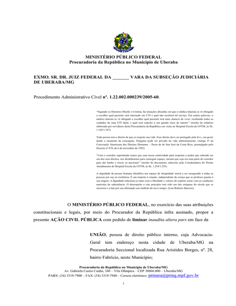 MINISTÉRIO PÚBLICO FEDERAL Procuradoria da República no Município de Uberaba EXMO. SR. DR. JUIZ FEDERAL DA _______ VARA DA SUBSEÇÃO JUDICIÁRIA DE UBERABA/MG Procedimento Administrativo Cível nº. 1.22.002.000239/2005-60. “Segundo os Diretores Murilo e Cristina, há situações absurdas em que o médico diarista se vê obrigado a escolher qual paciente será internado em UTI e qual não receberá tal serviço. Em outras palavras, o médico diarista se vê obrigado a escolher qual paciente terá mais chances de viver, recebendo todos os cuidados de uma UTI ideal, e qual será exposto a um grande risco de morrer.” (trecho do relatório elaborado por servidores desta Procuradoria da República em visita ao Hospital Escola da UFTM, às fls. 1.165/1.167). Toda pessoa tem o direito de que se respeite sua vida. Esse direito deve ser protegido pela lei e, em geral, desde o momento da concepção. Ninguém pode ser privado da vida arbitrariamente. (Artigo 4º da Convenção Americana dos Direitos Humanos – Pacto de de San José da Costa Rica, promulgado pelo Decreto nº 678, de 6 de novembro de 1992) “Com o corredor superlotado temos que usar nossa criatividade para respeitar o pudor que sabendo ser um dos seus direitos, nos desdobramos para conseguir espaço, mesmo que seja em uma parte do corredor para dar banho e trocar os pacientes” (trecho do documento subscrito pela Coordenadora do Pronto Atendimento do Hospital Escola da UFTM, às fls. 1.254/1.255). A dignidade da pessoa humana identifica um espaço de integridade moral a ser assegurado a todas as pessoas por sua só existência. É um respeito à criação, independente da crença que se professe quanto à sua origem. A dignidade relaciona-se tanto com a liberdade e valores do espírito como com as condições materiais de subsistência. O desrespeito a este princípio terá sido um dos estigmas do século que se encerrou e a luta por sua afirmação um símbolo do novo tempo. (Luís Roberto Barroso). O MINISTÉRIO PÚBLICO FEDERAL, no exercício das suas atribuições constitucionais e legais, por meio do Procurador da República infra assinado, propor a presente AÇÃO CIVIL PÚBLICA com pedido de liminar inaudita altera pars em face da UNIÃO, pessoa de direito público interno, cuja AdvocaciaGeral tem endereço nesta cidade de Uberaba/MG na Procuradoria Seccional localizada Rua Aristides Borges, nº. 28, bairro Fabrício, neste Município; Procuradoria da República no Município de Uberaba/MG Av. Gabriela Castro Cunha, 340 – Vila Olímpica – CEP 38066.000 – Uberaba/MG PABX: (34) 3319-7900 – FAX: (34) 3319-7940 – Correio eletrônico: [email protected] 1 MINISTÉRIO PÚBLICO FEDERAL Procuradoria da República no Município de Uberaba pelos fatos e fundamentos a seguir expostos: 1. Da legitimidade ministerial Indiscutível a legitimidade do órgão ministerial no presente caso, já que a saúde é direito INDISPONÍVEL, cabendo ao órgão ministerial nos termos do art. 127, caput, da CF, zelar pela defesa de tais direitos. Mais que isso, no presente caso, além dos direitos individuais de pessoas que se encontram aguardando tratamento urgente no Hospital Escola da Universidade Federal do Triângulo Mineiro e não conseguem, devido a ausência de leitos de UTI's suficientes, a presente ação objetiva a tutela difusa de toda a população do Município de Uberaba/MG e dos demais municípios referenciados que um dia pode vir a necessitar de tratamento em Unidades de Tratamento Intensivo. Outrossim, a legitimidade do Ministério Público Federal para a defesa do direito à vida e à saúde vem estampada no art. 129, incisos II e III, da Constituição Federal, na medida em que, dentre as funções institucionais atribuídas ao parquet, incumbe zelar pelo efetivo respeito dos poderes públicos e dos serviços de relevância pública aos direitos assegurados na Constituição, promovendo as medidas necessárias à sua garantia, bem como promover o inquérito civil e a ação civil pública, para a proteção de interesses difusos e coletivos. Ademais, importante realçar que o direito postulado contém a nota de permeabilidade e dispersão social que o caracteriza, indubitavelmente, como difuso, amoldando-se à discrição legal inserta no inciso I, do parágrafo único, do art. 81, do CDC Procuradoria da República no Município de Uberaba/MG Av. Gabriela Castro Cunha, 340 – Vila Olímpica – CEP 38066.000 – Uberaba/MG PABX: (34) 3319-7900 – FAX: (34) 3319-7940 – Correio eletrônico: [email protected] 2 MINISTÉRIO PÚBLICO FEDERAL Procuradoria da República no Município de Uberaba (interesses ou direitos transindividuais de natureza indivisível de que sejam titulares pessoas indeterminadas e ligadas por circunstâncias de fato). É dizer, o fato de inexistir a eficaz e satisfatória prestação de serviços de saúde à população caracteriza a circunstância que liga todos os que porventura precisem ou venham a precisar de tais serviços, revelando-se, à evidência, sua natureza indivisível. Nesse contexto, o fato em comento, além de ser difusa sua característica, por ser transindividual, reveste-se, consoante se ressaltou inicialmente, da nota de indisponibilidade (CF, art. 127), em face da afetação ao interesse público primário, que é o interesse do bem geral, ou seja, o interesse da sociedade ou da coletividade como um todo, potencialmente usuária desse serviço público, e, em sendo assim, sujeita aos efeitos nefastos da prestação do serviço irregular, em flagrante desrespeito do Poder Público a direitos assegurados na Constituição Federal, circunstância que, seguramente, confere ao Ministério Público a incumbência da defesa os interesses transindividuais indisponíveis através de Ação Civil Pública. A propósito, salutar o magistério de Nelson Nery Júnior: O Ministério Público está legitimado à defesa de interesses individuais homogêneos que tenham expressão para 