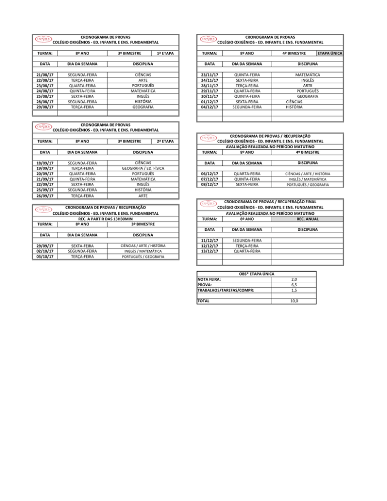 CRONOGRAMA DE PROVAS COLÉGIO OXIGÊNIOS - ED. INFANTIL E ENS. FUNDAMENTAL TURMA: 8º ANO DATA DIA DA SEMANA 21/08/17 22/08/17 23/08/17 24/08/17 25/08/17 28/08/17 29/08/17 SEGUNDA-FEIRA TERÇA-FEIRA QUARTA-FEIRA QUINTA-FEIRA SEXTA-FEIRA SEGUNDA-FEIRA TERÇA-FEIRA 3º BIMESTRE 1ª ETAPA CRONOGRAMA DE PROVAS COLÉGIO OXIGÊNIOS - ED. INFANTIL E ENS. FUNDAMENTAL TURMA: 8º ANO DISCIPLINA DATA DIA DA SEMANA CIÊNCIAS ARTE PORTUGUÊS MATEMÁTICA INGLÊS HISTÓRIA GEOGRAFIA 23/11/17 24/11/17 28/11/17 29/11/17 30/11/17 01/12/17 04/12/17 QUINTA-FEIRA SEXTA-FEIRA TERÇA-FEIRA QUARTA-FEIRA QUINTA-FEIRA SEXTA-FEIRA SEGUNDA-FEIRA 4º BIMESTRE ETAPA ÚNICA DISCIPLINA MATEMÁTICA INGLÊS ARTE PORTUGUÊS GEOGRAFIA CIÊNCIAS HISTÓRIA CRONOGRAMA DE PROVAS COLÉGIO OXIGÊNIOS - ED. INFANTIL E ENS. FUNDAMENTAL TURMA: 8º ANO 3º BIMESTRE 2ª ETAPA DATA DIA DA SEMANA DISCIPLINA 18/09/17 19/09/17 20/09/17 21/09/17 22/09/17 25/09/17 26/09/17 SEGUNDA-FEIRA TERÇA-FEIRA QUARTA-FEIRA QUINTA-FEIRA SEXTA-FEIRA SEGUNDA-FEIRA TERÇA-FEIRA CIÊNCIAS GEOGRAFIA / ED. FÍSICA PORTUGUÊS MATEMÁTICA INGLÊS HISTÓRIA ARTE CRONOGRAMA DE PROVAS / RECUPERAÇÃO COLÉGIO OXIGÊNIOS - ED. INFANTIL E ENS. FUNDAMENTAL REC. A PARTIR DAS 13H30MIN 3º BIMESTRE TURMA: 8º ANO DATA DIA DA SEMANA DISCIPLINA 29/09/17 02/10/17 03/10/17 SEXTA-FEIRA SEGUNDA-FEIRA TERÇA-FEIRA CIÊNCIAS / ARTE / HISTÓRIA INGLêS / MATEMÁTICA PORTUGUÊS / GEOGRAFIA CRONOGRAMA DE PROVAS / RECUPERAÇÃO COLÉGIO OXIGÊNIOS - ED. INFANTIL E ENS. FUNDAMENTAL AVALIAÇÃO REALIZADA NO PERÍODO MATUTINO 4º BIMESTRE TURMA: 8º ANO DATA DIA DA SEMANA DISCIPLINA 06/12/17 07/12/17 08/12/17 QUARTA-FEIRA QUINTA-FEIRA SEXTA-FEIRA CIÊNCIAS / ARTE / HISTÓRIA INGLÊS / MATEMÁTICA PORTUGUÊS / GEOGRAFIA CRONOGRAMA DE PROVAS / RECUPERAÇÃO FINAL COLÉGIO OXIGÊNIOS - ED. INFANTIL E ENS. FUNDAMENTAL AVALIAÇÃO REALIZADA NO PERÍODO MATUTINO REC. ANUAL TURMA: 8º ANO DATA DIA DA SEMANA 11/12/17 12/12/17 13/12/17 SEGUNDA-FEIRA TERÇA-FEIRA QUARTA-FEIRA DISCIPLINA OBS* ETAPA ÚNICA NOTA FEIRA: PROVA: TRABALHOS/TAREFAS/COMPR: 2,0 6,5 1,5 TOTAL 10,0