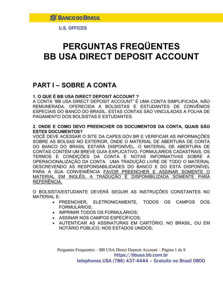 U.S. OFFICES PERGUNTAS FREQÜENTES BB USA DIRECT DEPOSIT ACCOUNT PART I – SOBRE A CONTA 1. O QUE É BB USA DIRECT DEPOSIT ACCOUNT ? A CONTA “BB USA DIRECT DEPOSIT ACCOUNT” É UMA CONTA SIMPLIFICADA, NÃO REMUNERADA, OFERECIDA A BOLSISTAS E ESTUDANTES DE CONVÊNIOS ESPECIAIS DO BANCO DO BRASIL. ESTAS CONTAS SÃO VINCULADAS A FOLHA DE PAGAMENTO DOS BOLSISTAS E ESTUDANTES. 2. ONDE E COMO DEVO PREENCHER OS DOCUMENTOS DA CONTA, QUAIS SÃO ESTES DOCUMENTOS? VOCÊ DEVE ACESSAR O SITE DA CAPES.GOV.BR E VERIFICAR AS INFORMAÇÕES SOBRE AS BOLSAS NO EXTERIOR, ONDE O MATERIAL DE ABERTURA DE CONTA DO BANCO DO BRASIL ESTARÁ DISPONÍVEL. O MATERIAL DE ABERTURA DE CONTAS CONTÉM UM BREVE GUIA EXPLICATIVO, FORMULÁRIOS CADASTRAIS, OS TERMOS E CONDIÇÕES DA CONTA E NOTAS INFORMATIVAS SOBRE A OPERACIONALIZAÇÃO DA CONTA. UMA TRADUÇÃO LIVRE DE TODO O MATERIAL DESCREVENDO AS RESPONSABILIDADES DO BANCO E DO ESTÁ DISPONÍVEL PARA A SUA CONVENIÊNCIA FAVOR PREENCHER E ASSINAR SOMENTE O MATERIAL EM INGLÊS, A TRADUÇÃO É DISPONIBILIZADA SOMENTE PARA REFERÊNCIA. O BOLSISTA/ESTUDANTE DEVERÁ SEGUIR AS INSTRUÇÕES CONSTANTES NO MATERIAL E: PREENCHER, ELETRONICAMENTE, TODOS OS CAMPOS DOS FORMULÁRIOS; IMPRIMIR TODOS OS FORMULÁRIOS; ASSINAR NOS CAMPOS ESPECÍFICOS; AUTENTICAR AS ASSINATURAS EM CARTÓRIO, NO BRASIL, OU EM NOTÁRIO PÚBLICO, NOS ESTADOS UNIDOS; Perguntas Frequentes – BB USA Direct Deposit Account – Página 1 de 8 https://bbusa.bb.com.br telephones USA (786) 437-4444 – Gratuíto no Brasil 0800 U.S. OFFICES ANEXAR CÓPIA DO DOCUMENTO DE IDENTIDADE VÁLIDA, COM FOTOGRAFIA LEGÍVEL; ENVIAR TODA A DOCUMENTAÇÃO, POR FAX PARA O BB (305) 577-0541 OU POR E-MAIL [email protected],; ENVIAR TAMBEM OS ORIGINAIS POR CORREIO, PARA O SEGUINTE ENDEREÇO: 2 S. BISCAYNE BLVD. #3870 MIAMI, FL 33131 3. O QUE A CONTA OFERECE? A CONTA OFERECE A MOVIMENTAÇÃO BANCÁRIA RÁPIDA, SEGURA E EFICIENTE ATRAVÉS DOS SERVIÇOS BB USA INTERNET BANKING E CARTÃO DE DÉBITO VISA, QUE PERMITE AO CLIENTE UTILIZAR CAIXAS AUTOMÁTICOS PARA SAQUES E CONSULTAS E FAZER COMPRAS EM QUALQUER ESTABELECIMENTO QUE ACEITE VISA, EM QUALQUER PARTE DO MUNDO. A CONTA PERMITE O CADASTRAMENTO DE UM BENEFICIÁRIO EM CASO DE FALECIMENTO DO CORRENTISTA, UTILIZANDO O FORMULÁRIO ITF-IN TRUST FORM. A CONTA É LIVRE DE DESPESAS GERAIS DE MANUTENÇÃO, DE TRANSFERÊNCIAS DE FUNDOS VIA INTERNET BANKING E COMPRAS VIA CARTÃO DE DÉBITO, OBSERVADOS OS SEUS TERMOS E CONDIÇÕES E TABELA DE TARIFAS DISPONIBILIZADA JUNTAMENTE COM A DOCUMENTAÇÃO DE ABERTURA DE CONTAS. 4. QUAIS SÃO OS SERVIÇOS QUE NÃO ESTÃO DISPONÍVEIS NA CONTA? EXISTEM ALGUNS SERVIÇOS OFERECIDOS A CONTAS CORRENTES REGULARES QUE NÃO ESTÃO DISPONÍVEIS PARA A SUA CONTA, COMO POR EXEMPLO INVESTIMENTOS, TALÃO DE CHEQUE, CONTA CONJUNTA. OUTROS SERVIÇOS COMO A SOLICITAÇÃO DE RECEBIMENTO DE EXTRATO FÍSICO OU ENVIO DE PEDIDO DE ORDEM DE PAGTO POR FAX, ESTARÃO DISPONÍVEIS, MAS SERÃO SUJEITOS A A TARIFAS CONFORME A TABELA DE TARIFAS DA CONTA. 5. COMO EU SEI SE TENHO QUE PREENCHER O FORMULÁRIO W-9, E PORQUÊ? SE VOCÊ RESIDIR NOS ESTADOS UNIDOS POR 183 DIAS OU MAIS, VOCÊ DEVE PREENCHER O FORMULÁRIO W9- REQUEST FOR TAXPAYER IDENTIFICATION Perguntas Frequentes – BB USA Direct Deposit Account – Página 2 de 8 https://bbusa.bb.com.br telephones USA (786) 437-4444 – Gratuíto no Brasil 0800 U.S. OFFICES NUMBER AND CERTIFICATION PARA A DEVIDA CERTIFICAÇÃO JUNTO A RECEITA FEDERAL AMERICANA (IRS) 6. O QUE ACONTECE SE EU TIVER INFORMADO O ENDEREÇO DE CORRESPONDÊNCIA ERRADO E COMO DEVO CORRIGIR O PROBLEMA? O ENDEREÇO DE CORRESPONDÊNCIA É UMA DAS INFORMAÇÕES MAIS IMPORTANTES DO SEU RELACIONAMENTO COM O BB, E É PARA ESTE ENDEREÇO QUE O BB ENVIARÁ A SENHA DA INTERNET, O SEU CARTÃO DE DÉBITO E A SENHA DO CARTÃO. É FUNDAMENTAL QUE VOCÊ TENHA CERTEZA ABSOLUTA QUE VOCÊ PODERÁ RECEBER AS CORRESPONDÊNCIAS NO ENDEREÇO INDICADO NOS FORMULÁRIOS, CASO CONTRÁRIO ENTRE IMEDIATAMENTE EM CONTATO COM O BB PARA REGULARIZAR E ATUALIZAR ESTA INFORMAÇÃO. SEU ENDEREÇO PODERÁ SER ATUALIZADO VIA INTERNET BANKING CASO VOCÊ JÁ TENHA CONSEGUIDO ACESSAR SUA CONTA. 7. COMO DEVO RESOLVER PROBLEMAS COM O SERVIÇO DE INTERNET DO BB E OUTRAS DÚVIDAS? O PRÓPRIO APLICATIVO DO BBUSA INTERNET BANKING O GUIARÁ PARA RESOLVER PROBLEMAS BÁSICOS QUE PROVENTURA SE APRESENTAREM. ADICIONALMENTE, O BB PODERÁ SER CONTATADO POR TELEFONE, E-MAIL OU FAX PARA PRESTAR A ASSISTÊNCIA NECESSÁRIA. BB New York Branch 600 Fifth Avenue 3rd Floor New York, NY 10020 Tel: 212-626-7000 Fax: 212-626-7045 e-mail: [email protected] BB Miami Agency 2 S. Biscayne Blvd. #3870 Miami, FL 33131 Tel: (786) 437-4444 Fax: (305) 577-0541 e-mail: [email protected] Favor notar que o BB Miami é a sua Agência de Relacionamento, embora sua conta pode ter sido aberta pelo BB NY. Perguntas Frequentes – BB USA Direct Deposit Account – Página 3 de 8 https://bbusa.bb.com.br telephones USA (786) 437-4444 – Gratuíto no Brasil 0800 U.S. OFFICES 8. QUANDO A MINHA BOLSA OU MISSÃO TERMINA POSSO CONTINUAR COM MINHA CONTA E RELACIONAMENTO BANCÁRIO COM O BB ? QUANDO A BOLSA OU A MISSÃO TERMINA, TAMBÉM ENCERRA A FOLHA DE PAGTO E O ACORDO VINCULDO A CONTA. CASO TENHA INTERESSE, O BOLSISTA OU ESTUDANTE DEVERÁ CONVERSAR COM O GERENTE DE CONTAS DO BB SOBRE AS CONDIÇÕES APLICÁVEIS E PROVIDÊNCIAS NECESSÁRIAS PARA A MANUTENÇÃO DE SUA CONTA, TRANSFORMANDO EM UMA CONTA REGULAR. PART II – SOBRE O CARTÃO DE DÉBITO 9. QUE DEVO FAZER APÓS O RECEBIMENTO DO MEU CARTÃO DE DÉBITO? VOCÊ DEVERÁ ATIVÁ-LO, LIGANDO PARA O SEU GERENTE DE CONTA OU NOSSA CENTRAL DE ATENDIMENTO (786) 437-3710. IMEDIATAMENTE, ASSINE ATRÁS DO SEU CARTÃO. 10. ONDE POSSO USAR MEU CARTÃO DE DÉBITO? PODERÁ SER USADO PARA COMPRAS MUNDIALMENTE, ONDE QUER QUE O CARTÃO VISA SEJA ACEITO. VOCÊ TAMBÉM PODERÁ USÁ-LO NOS ATM’S (CAIXA AUTOMÁTICO) QUE TIVEREM OS LOGOS QUE ESTÃO NA PARTE DE TRÁS DO SEU CARTÃO, INCLUINDO MAIS DE 1 MILHÃO DE AT