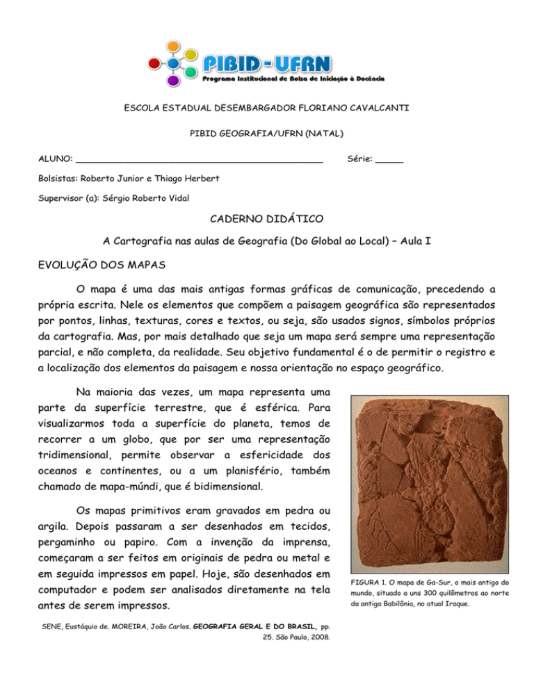 ESCOLA ESTADUAL DESEMBARGADOR FLORIANO CAVALCANTI PIBID GEOGRAFIA/UFRN (NATAL) ALUNO: ____________________________________________ Série: _____ Bolsistas: Roberto Junior e Thiago Herbert Supervisor (a): Sérgio Roberto Vidal CADERNO DIDÁTICO A Cartografia nas aulas de Geografia (Do Global ao Local) – Aula I EVOLUÇÃO DOS MAPAS O mapa é uma das mais antigas formas gráficas de comunicação, precedendo a própria escrita. Nele os elementos que compõem a paisagem geográfica são representados por pontos, linhas, texturas, cores e textos, ou seja, são usados signos, símbolos próprios da cartografia. Mas, por mais detalhado que seja um mapa será sempre uma representação parcial, e não completa, da realidade. Seu objetivo fundamental é o de permitir o registro e a localização dos elementos da paisagem e nossa orientação no espaço geográfico. Na maioria das vezes, um mapa representa uma parte da superfície terrestre, que é esférica. Para visualizarmos toda a superfície do planeta, temos de recorrer a um globo, que por ser uma representação tridimensional, permite observar a esfericidade dos oceanos e continentes, ou a um planisfério, também chamado de mapa-múndi, que é bidimensional. Os mapas primitivos eram gravados em pedra ou argila. Depois passaram a ser desenhados em tecidos, pergaminho ou papiro. Com a invenção da imprensa, começaram a ser feitos em originais de pedra ou metal e em seguida impressos em papel. Hoje, são desenhados em computador e podem ser analisados diretamente na tela antes de serem impressos. FIGURA 1. O mapa de Ga-Sur, o mais antigo do mundo, situado a uns 300 quilômetros ao norte da antiga Babilônia, no atual Iraque. SENE, Eustáquio de. MOREIRA, João Carlos. GEOGRAFIA GERAL E DO BRASIL, pp. 25. São Paulo, 2008. BRINCANDO COM A CARTOGRAFIA 01. Com base no texto, complete as Palavras - Cruzadas utilizando as palavras adequadas de acordo com as dicas e sua análise interpretativa do texto estudado. Representação tridimensional do planeta: ________________ Representação bidimensional do globo: __________________ Gravados em pedra de argila: ________________________ É uma das mais antigas formas gráficas de comunicação, precedendo a própria escrita: ______________________ PALAVRAS - CRUZADAS: EVOLUÇÃO DOS MAPAS 02. Elabore um desenho de um mapa do caminho da sua casa até a escola FLOCA, ou da própria escola. Nele, você pode colocar todos os elementos que ache necessários para sua produção cartográfica. LOCAL PARA O DESENHO DO SEU MAPA - CROQUI A Cartografia nas aulas de Geografia (Do Global ao Local) – Aula II OS ELEMENTOS DO MAPA CAÇA - PALAVRAS 01. Quais foram as cinco palavras encontradas? Após ter encontrado as palavras – chave, associe cada uma delas com os ssignificados que estão abaixo. A) A _________________ permite interpretar as informações contidas no mapa. B) O _________________ permite que o mapa responda três perguntas básicas: “O quê”, “O onde ou aonde” e o “Quando”. C) A _________________ expressa a proporção entre o objeto real e sua representação cartográfica. Influencia diretamente no nível de detalhamento a ser informado. D) O _________________ permite que o leitor do mapa se oriente no espaço geográfico por meio dos pontos cardeais. E) A __________________ concebe credibilidade a construção de um mapa informativo. 02. Observe o mapa e siga as instruções expostas a seguir. FIGURA 2. TIMES DE FUTEBOL DO CAMPEONATO BRASILEIRO – SÉRIES A, B, C 02. Quais elementos do mapa não estão presentes no mapa acima? Elabore-os no mapa. - _______________________ - _______________________ - _______________________ - _______________________ A) Trace uma linha no mapa dividindo o Brasil em suas cinco grandes regiões (Norte, Nordeste, Centro - Oeste, Sudeste e Sul). Em seguida escreva o nome das regiões no mapa e cite abaixo as que possuem o maior número de times de futebol. ___________________________________________________________________ ___________________________________________________________________ ___________________________________________________________________ ___________________________________________________________________ ___________________________________________________________________ ____________________ B) Com base nos seus conhecimentos sobre futebol e Geografia, cite três times que possuem as maiores torcidas em cada região. ___________________________________________________________________ ___________________________________________________________________ ___________________________________________________________________ ___________________________________________________________________ ___________________________________________________________________ ____________________ 03. A partir da análise e interpretação do mapa acima, coloque a sigla de cada estado do Brasil ao lado do seu nome. Rio Grande do Norte ________, Ceará ________, Paraíba ________, Pernambuco ________, Piauí ________, Alagoas ________, Maranhão ________, Bahia ________, Sergipe ________, Roraima ________, Rondônia ________, Amazonas ________, Acre ________, Amapá ________, Tocantins ________, Pará ________, Mato Grosso ________, Mato Grosso do Sul ________, Goiás ________, Distrito Federal ________, Minas Gerais ________, Espírito Santo ________, Rio de Janeiro ________, São Paulo ________, Paraná ________, Santa Catarina ________, Rio Grande do Sul ________. A Cartografia nas aulas de Geografia (Do Global ao Local) – Aula III Tecnologias tradicionais e modernas aplicadas a Cartografia A ROSA DOS VENTOS A Rosa – dos – Ventos é uma técnica utilizada para indicar os pontos cardeais, colaterais e subcolaterais com as abreviaturas usadas internacionalmente (em bússolas, cartas náuticas, navegação aérea etc.). Em países de língua portuguesa, o Leste (também chamado Este) muitas vezes é representado por L e o Oeste, por O. Esses pontos de or