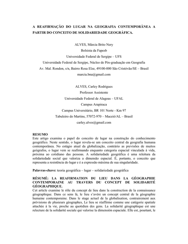 A REAFIRMAÇÃO DO LUGAR NA GEOGRAFIA CONTEMPORÂNEA A PARTIR DO CONCEITO DE SOLIDARIEDADE GEOGRÁFICA. ALVES, Márcia Brito Nery Bolsista da Fapesb Universidade Federal de Sergipe – UFS Universidade Federal de Sergipe, Núcleo de Pós-graduação em Geografia Av. Mal. Rondon, s/n, Bairro Rosa Elze, 49100-000 São Cristóvão/SE – Brasil [email protected] ALVES, Carley Rodrigues Professor Assistente Universidade Federal de Alagoas – UFAL Campus Arapiraca Campus Universitário, BR 101 Norte - Km 97 Tabuleiro do Martins, 57072-970 – Maceió/AL – Brasil [email protected] RESUMO Este artigo examina o papel do conceito de lugar na construção do conhecimento geográfico. Neste sentido, o lugar revela-se um conceito central da geografia humana contemporânea. No estágio atual da globalização, contrário as previsões de muitos geógrafos, o lugar vem se reafirmando enquanto categoria espacial vinculada à vida, próxima ao cotidiano das pessoas. A solidariedade geográfica é uma releitura da solidariedade social que valoriza a dimensão espacial. É, portanto, o conceito que representa a resistência do lugar e é a expressão máxima de sua singularidade. Palavras-chave: teoria geográfica – lugar – solidariedade geográfica RÉSUMÉ: LA REAFIRMATION DU LIEU DANS LA GÉOGRAPHIE CONTEMPORAINE AU TRAVERS DU CONCEPT DE SOLIDARITÉ GÉOGRAPHIQUE. Cet article examine le rôle du concept de lieu dans la construction de la connaissance géographique. Dans ce sens là, le lieu s’avère un concept central de la géographie humaine contemporaine. Dans le stage actuel de la globalisation, contrairement aux prévisions de plusieurs géographes, Le lieu se réaffirme comme une catégorie spatiale attachée à la vie, proche au quotidien des gens. La solidarité géographique est une relecture de la solidarité sociale qui valorise la dimensión espaciale. Elle est, pourtant, le concept qui répresent la resistence du lieu et en est aussi l´expression maximale de sa singularité. Mots-clé: théorie géographique – lieu – solidarité géographique INTRODUÇÃO A Geografia, para além de uma teoria do espaço, revela-se cada vez mais, na atualidade, como uma filosofia de vida, uma ideologia do cotidiano, ou, tão simplesmente, enquanto contemplação estética da paisagem. Daí concluir-se facilmente que a Geografia é, nas mesmas proporções, ciência, filosofia e arte. É através do conceito de lugar que a Geografia realiza a integração das dimensões da realidade. Neste sentido, o lugar é, por excelência, a zona de realização do espaço geográfico. Não resta dúvida sobre o papel que o lugar exerce no seio da ciência geográfica. O lugar é a síntese mais significativa da relação sociedade/natureza. Dos aspectos psicológicos aos geográficos que cercam a noção de lugar, traduz-se na unidade espaçotempo mais representativa da presença humana na superfície do Planeta. Ao analisar a obra de Milton Santos, Moreira (1999, p.151), conclui afirmando que [...] com o risco de reduzi-la ao essencial, não erraria em dizer que a teoria do espaço de Milton Santos fundamentalmente é uma teoria do lugar. Segundo Silva (2007, p.20), a conceituação de lugar parte do entendimento de que ele permite análises mais localizadas, no tempo e no espaço [...], pois é ele que representa a dimensão do espaço mais próxima seja para o indivíduo, seja para a coletividade. De outra maneira, significa dizer que, o lugar reafirma a importância do espaço para a sociedade enquanto palco da realização individual e coletiva. O lugar enquanto ponto de vista realiza uma miniaturização do mundo, constituindo-se em um ponto do holograma. Para Morin (1999), a metáfora do holograma faz referência a metapontos de vistas, por meio dos quais é possível enxergar o cenário como um todo a partir de um lugar distante. Na verdade, o desejo de ver a totalidade a partir do lugar foi um dos maiores sonhos da humanidade. Segundo Harvey (1993, p.224), Ptolomeu imaginava como o globo como um todo seria visto por um olho humano que o visse de fora. A partir do lugar é possível ter uma visão integrada do espaço. O Aleph é, na mesma proporção do holograma, uma excelente metáfora do lugar. Na ficção de Borges (2001), O Aleph é um dos pontos do espaço que contem todos os pontos. Enquanto fusão entre as coisas extremamente próximas àquelas extremamente distantes dos homens, o lugar é um fenômeno complexo que se manifesta na paisagem. É o ponto de materialização do que se tem e o alicerce de aspirações futuras. Para Santos (2005, p.161) no lugar estamos condenados a conhecer o mundo pelo que ele já é, mas, também, pelo que ainda não é. O futuro, e não o passado torna-se a nossa âncora. O lugar qualifica a distância e mantém por meio da idéia de extensão e continuidade, estreita relação com o homem. Para Fremont (1982, apud HOLZER 1999), lugar e distância são polaridades representativas da relação mais simples entre dois lugares ou entre dois homens. Para este autor existem cinco tipos de distância: distância métrica, distância tempo, distância afetiva, distância ecológica, distância estrutural. Neste diálogo, por um lado, o lugar assume as características de uma extensão multidimensional do corpo humano; por outro, representa um nível de organização consciente do meio. Teoria do lugar ou teoria da vida ?! A despeito das múltiplas conceituações que o lugar possa assumir, neste artigo, lugar é considerado enquanto sinônimo de vida. Portanto, qualquer teoria do lugar deverá ser também uma teoria da vida. Mas, para que mais uma teoria da vida?! A resposta para esta questão é ampla o suficiente para justificar a existência humana no mundo. Para Carlos (1994, p.303), No lugar emerge a vida, posto que é aí que se dá a unidade da vida social. O indivíduo, a sociedade e o meio são os termos definidores da identidade territorial, enquanto uma 