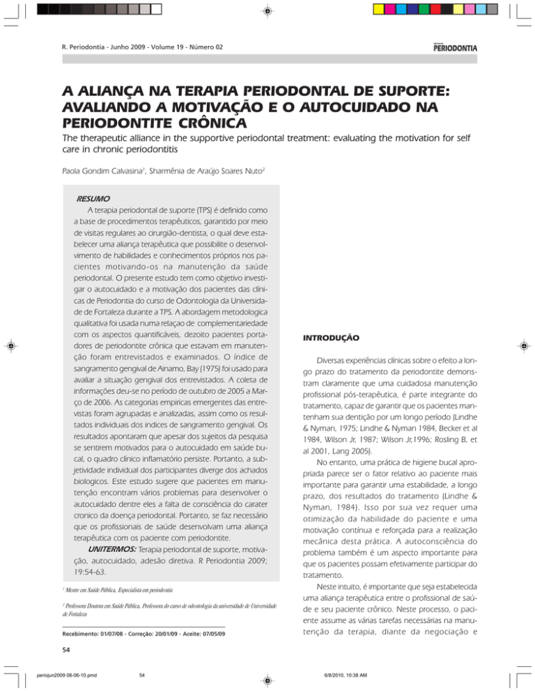 R. Periodontia - Junho 2009 - Volume 19 - Número 02 A ALIANÇA NA TERAPIA PERIODONTAL DE SUPORTE: AVALIANDO A MOTIVAÇÃO E O AUTOCUIDADO NA PERIODONTITE CRÔNICA The therapeutic alliance in the supportive periodontal treatment: evaluating the motivation for self care in chronic periodontitis Paola Gondim Calvasina1, Sharmênia de Araújo Soares Nuto2 RESUMO A terapia periodontal de suporte (TPS) é definido como a base de procedimentos terapêuticos, garantido por meio de visitas regulares ao cirurgião-dentista, o qual deve estabelecer uma aliança terapêutica que possibilite o desenvolvimento de habilidades e conhecimentos próprios nos pacientes motivando-os na manutenção da saúde periodontal. O presente estudo tem como objetivo investigar o autocuidado e a motivação dos pacientes das clínicas de Periodontia do curso de Odontologia da Universidade de Fortaleza durante a TPS. A abordagem metodologica qualitativa foi usada numa relaçao de complementariedade com os aspectos quantificáveis, dezoito pacientes portadores de periodontite crônica que estavam em manutenção foram entrevistados e examinados. O índice de sangramento gengival de Ainamo, Bay (1975) foi usado para avaliar a situação gengival dos entrevistados. A coleta de informações deu-se no período de outubro de 2005 a Março de 2006. As categorias empiricas emergentes das entrevistas foram agrupadas e analizadas, assim como os resultados individuais dos indices de sangramento gengival. Os resultados apontaram que apesar dos sujeitos da pesquisa se sentirem motivados para o autocuidado em saúde bucal, o quadro clínico inflamatório persiste. Portanto, a subjetividade individual dos participantes diverge dos achados biologicos. Este estudo sugere que pacientes em manutenção encontram vários problemas para desenvolver o autocuidado dentre eles a falta de consciência do carater cronico da doença periodontal. Portanto, se faz necessário que os profissionais de saúde desenvolvam uma aliança terapêutica com os paciente com periodontite. UNITERMOS: Terapia periodontal de suporte, motivação, autocuidado, adesão diretiva. R Periodontia 2009; 19:54-63. 1 Mestre em Saúde Pública, Especialista em periodontia 2 Professora Doutora em Saúde Pública, Professora do curso de odontologia da universidade de Universidade de Fortaleza Recebimento: 01/07/08 - Correção: 20/01/09 - Aceite: 07/05/09 INTRODUÇÃO Diversas experiências clínicas sobre o efeito a longo prazo do tratamento da periodontite demonstram claramente que uma cuidadosa manutenção profissional pós-terapêutica, é parte integrante do tratamento, capaz de garantir que os pacientes mantenham sua dentição por um longo período (Lindhe & Nyman, 1975; Lindhe & Nyman 1984, Becker et al 1984, Wilson Jr, 1987; Wilson Jr,1996; Rosling B, et al 2001, Lang 2005). No entanto, uma prática de higiene bucal apropriada parece ser o fator relativo ao paciente mais importante para garantir uma estabilidade, a longo prazo, dos resultados do tratamento (Lindhe & Nyman, 1984). Isso por sua vez requer uma otimização da habilidade do paciente e uma motivação contínua e reforçada para a realização mecânica desta prática. A autoconsciência do problema também é um aspecto importante para que os pacientes possam efetivamente participar do tratamento. Neste intuito, é importante que seja estabelecida uma aliança terapêutica entre o profissional de saúde e seu paciente crônico. Neste processo, o paciente assume as várias tarefas necessárias na manutenção da terapia, diante da negociação e 54 periojun2009 08-06-10.pmd 54 6/8/2010, 10:38 AM R. Periodontia - 19(2):54-63 mobilização de sua motivação, permitindo sua participação ativa na busca do cuidar de si (Barofsky, 1978; Petry & Pretto, 2003; Bissel et al.; 2004). A essência do autocuidado é o desenvolvimento da capacidade do cliente tornar-se agente do seu viver diário, tendo como objetivo final a independência no desempenho das atividades. Quando ocorre um déficit no autocuidado, decorrente de uma falta de aptidão, informação ou motivação inerente a fatores intrínsecos ou extrínsecos ao paciente, fazse necessário o desenvolvimento de sistemas de apoio educativo ou terapêutico. Neste momento, é imprescindível o engajamento do profissional de saúde, a fim de selecionar, planejar e executar em conjunto com o paciente ações para o restabelecimento de sua qualidade de vida (Hoga, 1993). Vários estudos sobre a motivação para o autocuidado revelaram que, em geral, durante a terapia periodontal de suporte, os pacientes sentem dificuldades em manter uma performance adequada e atitudes positivas ante a higiene oral, desistindo das consultas de manutenção logo no início (Johansson et al, 1984; Ojima et al, 2001), não implicando por isso um desinteresse na manutenção da saúde oral (Ojima et al, 2005). Por outro lado, naqueles pacientes que comparecem às consultas de manutenção, os procedimentos de higiene oral são bem executados e os sinais clínicos de inflamação drasticamente reduzidos (Glavind, 1983), confirmando assim que os pacientes durante a terapêutica clínica sentem-se mais motivados para o autocuidado reforçando ser necessário estabelecer uma relação comunicativa entre profissional e paciente, para despertar a motivação e autocuidado nos pacientes (Nuto et al, 2006; Nuto et al 2007). Este estudo tem como objetivo investigar o autocuidado e a motivação dos pacientes das clínicas de Periodontia do curso de Odontologia da Universidade de Fortaleza durante a TPS, sob a ótica da subjetividade humana. METODOLOGIA Neste estudo foi utilizada a abordagem metodológica qualitativa, numa relação de inseparabilidade e interdependência dos aspectos quantificáveis e o dimensionamento dos significados, interagindo dinamicamente na busca da complementaridade na construção da realidade (Minayo, 2000). O presente trabalho foi realizado no período de ou