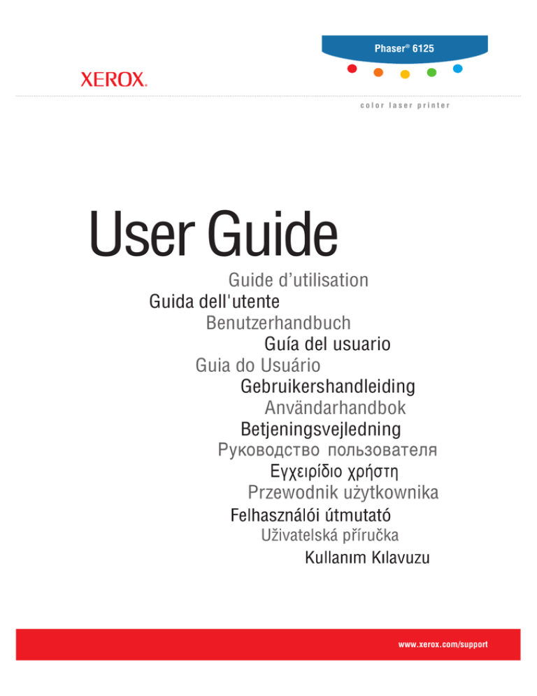 Phaser® 6125 color laser printer User Guide Guide d’utilisation Guida dell'utente Benutzerhandbuch Guía del usuario Guia do Usuário Gebruikershandleiding Användarhandbok Betjeningsvejledning ǼȖȤİȚȡȓįȚȠȤȡȒıIJȘ www.xerox.com/support Direitos reservados de não publicação, de acordo com as leis de direitos autorais dos Estados Unidos. O conteúdo desta publicação não pode ser reproduzido de forma alguma sem a permissão da Xerox Corporation. A proteção de direitos autorais reivindicada inclui qualquer forma e conteúdo de materiais e informações passíveis de direitos autorais, permitidos atualmente por leis estatutárias ou judiciais, ou doravante concedidos, incluindo, sem limitar-se a eles, materiais gerados a partir de programas de software que sejam exibidos na tela, tais como estilos, máscaras, ícones, exibições de telas, aparências etc. XEROX®, CentreWare®, Phaser® e Walk-Up® são marcas da Xerox Corporation nos Estados Unidos e/ou em outros países. Microsoft®, Vista™, Windows® e Windows Server™ são marcas comerciais da Microsoft Corporation nos Estados Unidos e/ou em outros países. Como parceira da ENERGY STAR®, a Xerox Corporation determinou que este produto atende às diretrizes da ENERGY STAR em termos de eficiência no consumo de energia. O nome e o logotipo ENERGY STAR são marcas registradas nos EUA. Conteúdo Conteúdo 1 Informações da impressora Segurança do usuário. . . . . . . . . . . . . . . . . . . . . . . . . . . . . . . . . . . . . . . . . . . . . . . . . . . . . . . Segurança elétrica . . . . . . . . . . . . . . . . . . . . . . . . . . . . . . . . . . . . . . . . . . . . . . . . . . . . Segurança do laser . . . . . . . . . . . . . . . . . . . . . . . . . . . . . . . . . . . . . . . . . . . . . . . . . . . Segurança de manutenção . . . . . . . . . . . . . . . . . . . . . . . . . . . . . . . . . . . . . . . . . . . . . . Segurança operacional . . . . . . . . . . . . . . . . . . . . . . . . . . . . . . . . . . . . . . . . . . . . . . . . Movendo a impressora . . . . . . . . . . . . . . . . . . . . . . . . . . . . . . . . . . . . . . . . . . . . . . . . Símbolos de segurança gravados no produto . . . . . . . . . . . . . . . . . . . . . . . . . . . . . . . 1-2 1-2 1-3 1-4 1-4 1-6 1-7 Especificações da impressora . . . . . . . . . . . . . . . . . . . . . . . . . . . . . . . . . . . . . . . . . . . . . . . . 1-8 Informações regulamentares . . . . . . . . . . . . . . . . . . . . . . . . . . . . . . . . . . . . . . . . . . . . . . . . . 1-9 Estados Unidos (Regulamentos da FCC) . . . . . . . . . . . . . . . . . . . . . . . . . . . . . . . . . . 1-9 Canada (Regulamentos) . . . . . . . . . . . . . . . . . . . . . . . . . . . . . . . . . . . . . . . . . . . . . . . 1-9 União Européia . . . . . . . . . . . . . . . . . . . . . . . . . . . . . . . . . . . . . . . . . . . . . . . . . . . . . 1-10 Folha de dados de segurança do material . . . . . . . . . . . . . . . . . . . . . . . . . . . . . . . . . . . . . . 1-11 Reciclagem e descarte do produto . . . . . . . . . . . . . . . . . . . . . . . . . . . . . . . . . . . . . . . . . . . . União Européia . . . . . . . . . . . . . . . . . . . . . . . . . . . . . . . . . . . . . . . . . . . . . . . . . . . . . América do Norte . . . . . . . . . . . . . . . . . . . . . . . . . . . . . . . . . . . . . . . . . . . . . . . . . . . Outros países . . . . . . . . . . . . . . . . . . . . . . . . . . . . . . . . . . . . . . . . . . . . . . . . . . . . . . . 2 1-12 1-12 1-13 1-13 Recursos da impressora Componentes principais e seus recursos . . . . . . . . . . . . . . . . . . . . . . . . . . . . . . . . . . . . . . . . Vista dianteira . . . . . . . . . . . . . . . . . . . . . . . . . . . . . . . . . . . . . . . . . . . . . . . . . . . . . . . Vista traseira . . . . . . . . . . . . . . . . . . . . . . . . . . . . . . . . . . . . . . . . . . . . . . . . . . . . . . . . Vista interna . . . . . . . . . . . . . . . . . . . . . . . . . . . . . . . . . . . . . . . . . . . . . . . . . . . . . . . . Configuração da impressora . . . . . . . . . . . . . . . . . . . . . . . . . . . . . . . . . . . . . . . . . . . . 2-2 2-2 2-3 2-3 2-4 Painel de controle . . . . . . . . . . . . . . . . . . . . . . . . . . . . . . . . . . . . . . . . . . . . . . . . . . . . . . . . . Layout do painel de controle. . . . . . . . . . . . . . . . . . . . . . . . . . . . . . . . . . . . . . . . . . . . Exibir. . . . . . . . . . . . . . . . . . . . . . . . . . . . . . . . . . . . . . . . . . . . . . . . . . . . . . . . . . . . . . Pág informativas . . . . . . . . . . . . . . . . . . . . . . . . . . . . . . . . . . . . . . . . . . . . . . . . . . . . . 2-5 2-5 2-5 2-6 Modo de economia de energia. . . . . . . . . . . . . . . . . . . . . . . . . . . . . . . . . . . . . . . . . . . . . . . . 2-7 Saída do modo de economia de energia . . . . . . . . . . . . . . . . . . . . . . . . . . . . . . . . . . . 2-7 Verificação do status de dados de impressão . . . . . . . . . . . . . . . . . . . . . . . . . . . . . . . . . . . . 2-8 Verificação do CentreWare Internet Services. . . . . . . . . . . . . . . . . . . . . . . . . . . . . . . 2-8 Impressora a laser em cores Phaser® 6125 i Conteúdo Exibição de Configuração e Configurações da bandeja do papel . . . . . . . . . . . . . . . . . . . . . 2-9 Mais informações . . . . . . . . . . . . . . . . . . . . . . . . . . . . . . . . . . . . . . . . . . . . . . . . . . . . . . . . 2-10 Recursos . . . . . . . . . . . . . . . . . . . . . . . . . . . . . . . . . . . . . . . . . . . . . . . . . . . . . . . . . . 2-10 3 Informações básicas sobre rede Visão geral da instalação e configuração da rede . . . . . . . . . . . . . . . . . . . . . . . . . . . . . . . . . 3-2 Escolha de um método de conexão . . . . . . . . . . . . . . . . . . . . . . . . . . . . . . . . . . . . . . . . . . . . 3-3 Conexão via Ethernet (recomendada) . . . . . . . . . . . . . . . . . . . . . .