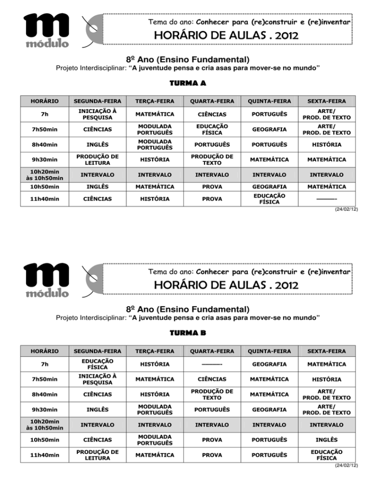 8o Ano (Ensino Fundamental) Projeto Interdisciplinar: “A juventude pensa e cria asas para mover-se no mundo” TURMA A HORÁRIO SEGUNDA-FEIRA TERÇA-FEIRA QUARTA-FEIRA QUINTA-FEIRA SEXTA-FEIRA 7h INICIAÇÃO À PESQUISA MATEMÁTICA CIÊNCIAS PORTUGUÊS ARTE/ PROD. DE TEXTO 7h50min CIÊNCIAS MODULADA PORTUGUÊS EDUCAÇÃO FÍSICA GEOGRAFIA ARTE/ PROD. DE TEXTO 8h40min INGLÊS MODULADA PORTUGUÊS PORTUGUÊS PORTUGUÊS HISTÓRIA 9h30min PRODUÇÃO DE LEITURA HISTÓRIA PRODUÇÃO DE TEXTO MATEMÁTICA MATEMÁTICA 10h20min às 10h50min INTERVALO INTERVALO INTERVALO INTERVALO INTERVALO 10h50min INGLÊS MATEMÁTICA PROVA GEOGRAFIA MATEMÁTICA 11h40min CIÊNCIAS HISTÓRIA PROVA EDUCAÇÃO FÍSICA –––––(24/02/12) 8o Ano (Ensino Fundamental) Projeto Interdisciplinar: “A juventude pensa e cria asas para mover-se no mundo” TURMA B HORÁRIO SEGUNDA-FEIRA TERÇA-FEIRA QUARTA-FEIRA QUINTA-FEIRA SEXTA-FEIRA 7h EDUCAÇÃO FÍSICA HISTÓRIA –––––- GEOGRAFIA MATEMÁTICA 7h50min INICIAÇÃO À PESQUISA MATEMÁTICA CIÊNCIAS MATEMÁTICA HISTÓRIA 8h40min CIÊNCIAS HISTÓRIA PRODUÇÃO DE TEXTO MATEMÁTICA ARTE/ PROD. DE TEXTO 9h30min INGLÊS MODULADA PORTUGUÊS PORTUGUÊS GEOGRAFIA ARTE/ PROD. DE TEXTO 10h20min às 10h50min INTERVALO INTERVALO INTERVALO INTERVALO INTERVALO 10h50min CIÊNCIAS MODULADA PORTUGUÊS PROVA PORTUGUÊS INGLÊS 11h40min PRODUÇÃO DE LEITURA MATEMÁTICA PROVA PORTUGUÊS EDUCAÇÃO FÍSICA (24/02/12) 8o Ano (Ensino Fundamental) Projeto Interdisciplinar: “A juventude pensa e cria asas para mover-se no mundo” TURMA C HORÁRIO SEGUNDA-FEIRA TERÇA-FEIRA QUARTA-FEIRA QUINTA-FEIRA SEXTA-FEIRA 7h CIÊNCIAS PORTUGUÊS –––––- MATEMÁTICA HISTÓRIA 7h50min INGLÊS HISTÓRIA PRODUÇÃO DE TEXTO INICIAÇÃO À PESQUISA MATEMÁTICA 8h40min PRODUÇÃO DE LEITURA MATEMÁTICA CIÊNCIAS GEOGRAFIA MATEMÁTICA 9h30min CIÊNCIAS MATEMÁTICA EDUCAÇÃO FÍSICA MODULADA MATEMÁTICA INGLÊS 10h20min às 10h50min INTERVALO INTERVALO INTERVALO INTERVALO INTERVALO 10h50min PORTUGUÊS HISTÓRIA PROVA MODULADA MATEMÁTICA ARTE/ PROD. DE TEXTO 11h40min EDUCAÇÃO FÍSICA PORTUGUÊS PROVA GEOGRAFIA ARTE/ PROD. DE TEXTO (24/02/12)