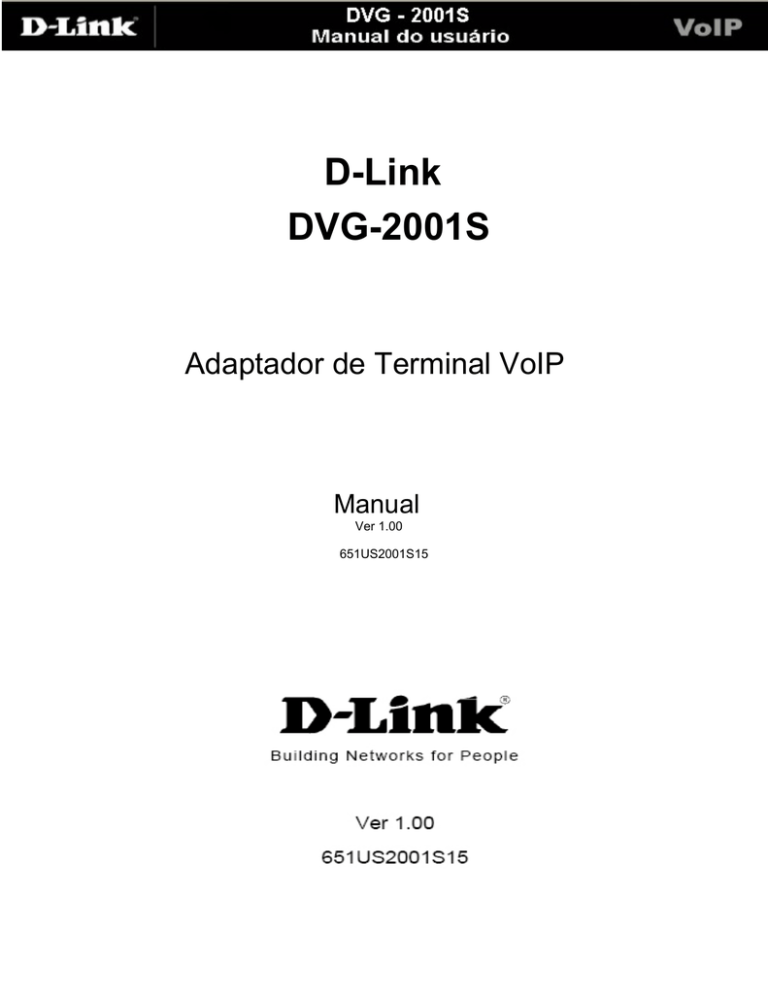 D-Link DVG-2001S Adaptador de Terminal VoIP Manual Ver 1.00 651US2001S15 Índice Conteúdo do Pacote.............................................................................................. 1 Introdução............................................................................................................... 2 Conexões................................................................................................................ 3 LEDs frontais.......................................................................................................... 4 Recursos................................................................................................................. 5 Usando o Assistente de Configuração (Wizard)................................................. 6 Home > WAN > Dynamic IP Address.............................................................. 7 Home > WAN > Static IP Address................................................................... 8 Home > WAN > PPPoE....................................................................................9 Advanced > VOIP > Server Configuration......................................................12 Advanced > VOIP > Provisioning...................................................................15 Advanced > VOIP > STUN Configuration.......................................................16 Advanced > VOIP > User Agent.....................................................................17 Advanced > VOIP > Peer to Peer...................................................................19 Advanced > VOIP > Telephony......................................................................20 Advanced > Misc.............................................................................................21 Tools > Admin.................................................................................................22 Tools > System...............................................................................................23 Tools > Firmware............................................................................................24 Tools > Config................................................................................................25 Tools > Save & Reboot..................................................................................25 Status > Device Info.......................................................................................26 Status > Stats.................................................................................................26 Status > Cable Tester.....................................................................................28 Help................................................................................................................29 Especificações Técnicas.....................................................................................30 Perguntas Frequentes.........................................................................................32 D-Link DVG-2001S Adaptador de Terminal VoIP Adaptador de energia - DC 12V, 1.2A Manual do usuário e Garantia no CD Guia de Instalação Rápida Cabo Ethernet (a porta Ethernet do DVG-2001S é Auto-MDIX) Se qualquer um dos itens acima estiver faltando, por favor entre em contato com o revendedor. Observação: utilizando uma fonte de alimentação com uma tensão diferente do que a inclusa no DVG-2001S, irá causar danos e anulará a garantia desse produto. 1 Introdução O D-Link DVG-2001S Adaptador de Terminal VoIP conecta redes tradicionais de telefone a redes IP com dispositivos de telefone convencionais, como telefones analógicos ou fax. Ele pode reduzir as tarifas de chamadas de telefone de longa distância e proporciona qualidade máxima de comunicação através da rede IP. Esse equipamento fornece uma porta FXS (Foreign Exchange Subscriber) e uma porta Ethernet. 2 Conexões 3 LED's frontais 4 Recursos ● ● ● ● ● ● ● ● ● ● ● Uma porta Foreign Exchange Subscriber (FXS, RJ-11) Uma porta NWay 10/100BASE-TX Fast Ethernet para conexão de LAN Voice Activity Detection (VAD)/Comfort Noise Generation (CNG) Supressão de silêncio para reduzir o consumo de banda Jitter Buffer adaptável para uma boa recepção de voz Capacidade de recuperação de pacotes perdidos para melhorar a qualidade de voz Suporte a QoS (Quality of Service) para garantir a qualidade de voz Função PPPoEpara apoio à conexão dial-up para banda larga Endereço IP usando DHCP ou configuração estática Função de Identificador de chamadas Configuração e gestão remota através da Internet utilizando navegadores 5 Usando o Assistente de Configuração Sempre que você desejar configurar sua rede ou seu DVG-2001S, você pode acessar o menu de configuração abrindo o navegador de Internet e digitando o endereço IP do DVG-2001S. O endereço IP padrão do equipamento está sendo mostrado na figura ao lado, siga os passos abaixo: ● ● ● ● ● Abra o navegador de Internet Digite o endereço IP do ATA (http://10.1.1.1) Digite admin no campo User name Digite admin no campo Password Clique em OK A tela de Home > Wizard irá aparecer. Por favor, consulte o Guia de Instalação Rápida para obter mais informações sobre o Setup Wizard (Assistente de Confguração). Estes botões aparecem na maioria das telas de configuração. Por favor clique no botão apropriado na parte inferior da tela após ter feito alguma configuração. Observação: se você tiver alterado o IP atribuido ao DVG-2001S, certifique-se de digitar o endereço IP correto. 6 Home > WAN > Dinamic IP address Dynamic Escolha Dynamic IP address para obter endereço IP automaticamente de seu provedor de Internet de banda larga. Esta opção deve ser selecionada se seu provedor de Internet não tiver fornecido um endereço IP. Esta opção é normalmente utilizada para serviços que utilizam Cable Modem. Host Name Esta função é opcional,mas pode ser exigido por 