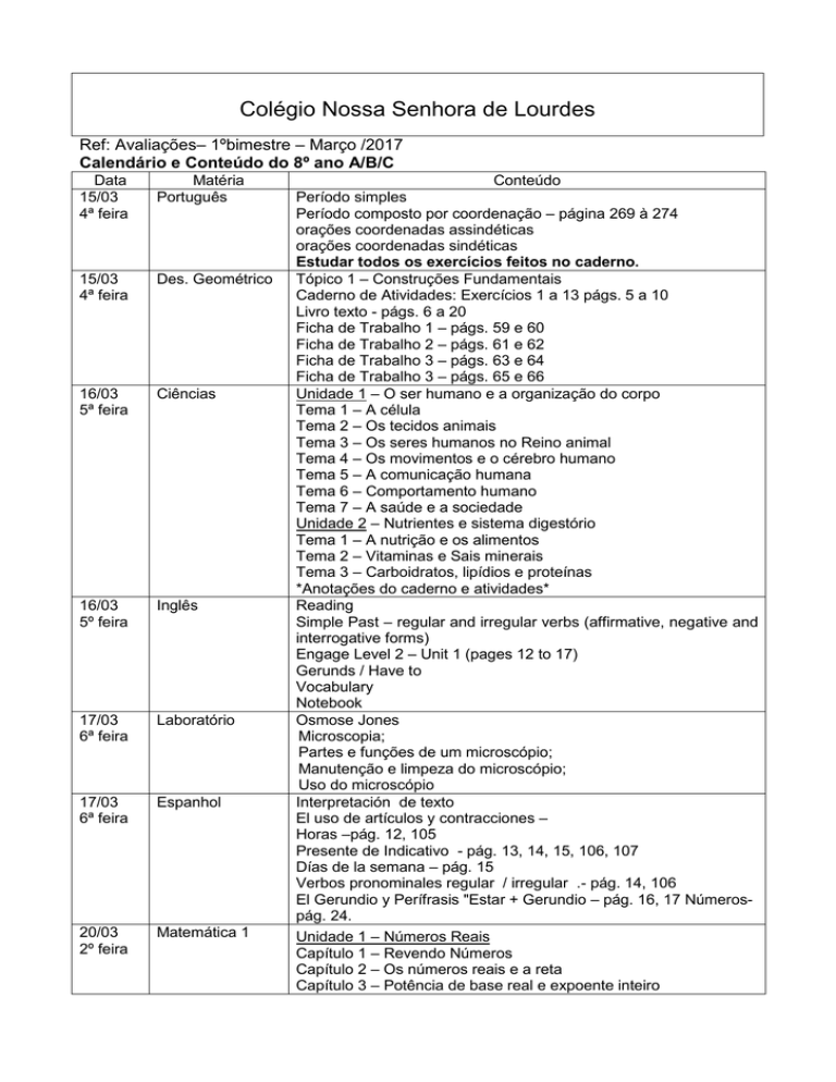 Colégio Nossa Senhora de Lourdes Ref: Avaliações– 1ºbimestre – Março /2017 Calendário e Conteúdo do 8º ano A/B/C Data 15/03 4ª feira Matéria Português 15/03 4ª feira Des. Geométrico 16/03 5ª feira Ciências 16/03 5º feira Inglês 17/03 6ª feira Laboratório 17/03 6ª feira Espanhol 20/03 2º feira Matemática 1 Conteúdo Período simples Período composto por coordenação – página 269 à 274 orações coordenadas assindéticas orações coordenadas sindéticas Estudar todos os exercícios feitos no caderno. Tópico 1 – Construções Fundamentais Caderno de Atividades: Exercícios 1 a 13 págs. 5 a 10 Livro texto - págs. 6 a 20 Ficha de Trabalho 1 – págs. 59 e 60 Ficha de Trabalho 2 – págs. 61 e 62 Ficha de Trabalho 3 – págs. 63 e 64 Ficha de Trabalho 3 – págs. 65 e 66 Unidade 1 – O ser humano e a organização do corpo Tema 1 – A célula Tema 2 – Os tecidos animais Tema 3 – Os seres humanos no Reino animal Tema 4 – Os movimentos e o cérebro humano Tema 5 – A comunicação humana Tema 6 – Comportamento humano Tema 7 – A saúde e a sociedade Unidade 2 – Nutrientes e sistema digestório Tema 1 – A nutrição e os alimentos Tema 2 – Vitaminas e Sais minerais Tema 3 – Carboidratos, lipídios e proteínas *Anotações do caderno e atividades* Reading Simple Past – regular and irregular verbs (affirmative, negative and interrogative forms) Engage Level 2 – Unit 1 (pages 12 to 17) Gerunds / Have to Vocabulary Notebook Osmose Jones Microscopia; Partes e funções de um microscópio; Manutenção e limpeza do microscópio; Uso do microscópio Interpretación de texto El uso de artículos y contracciones – Horas –pág. 12, 105 Presente de Indicativo - pág. 13, 14, 15, 106, 107 Días de la semana – pág. 15 Verbos pronominales regular / irregular .- pág. 14, 106 El Gerundio y Perífrasis "Estar + Gerundio – pág. 16, 17 Númerospág. 24. Unidade 1 – Números Reais Capítulo 1 – Revendo Números Capítulo 2 – Os números reais e a reta Capítulo 3 – Potência de base real e expoente inteiro 21/03 3º feira Matemática 2 22/03 4º feira História 23/03 5º feira Geografia Estudar pelo livro e pelo caderno Unidade 3 – Segmentos, ângulos e triângulos Capítulo 5 – Segmentos Capítulo 6 – Ângulos Capítulo 7 – Retas coplanares, Ângulos opostos pelo vértice (o.p.v.) Capítulo 8 – Triângulos (pág.98 até 103) Estudar pelo livro e pelo caderno Unid.1 – A expansão da América portuguesa Tema 1 – A pecuária e a expansão para o interior Tema 2 – As missões jesuíticas Tema 3 – A conquista do sertão Tema 4 – A crise no império e as rebeliões na colônia Unid. 2 – A mineração no Brasil colonial Tema 1 – A exploração do ouro e do diamante Tema 2 – Os caminhos para as minas Estudar da p. 18 até 51. Estudar o caderno também. Expedição 1: Espaço mundial: diversidade e regionalização. Expedição 2: Mundo global: origens e desafios. Caderno de mapas (Geografia em mapas) páginas 4 a 15. Estudar as anotações feitas no caderno. Atenção No período de 15/03 a 23/03 serão realizadas as provas bimestrais marcadas pela coordenação, nesses dias o horário de saída para os alunos do 6º ao 9º ano, período da manhã, será às 12h (podendo estender-se até 12:45h, caso haja necessidade) e, para os alunos da tarde, às 17:35h podendo estender-se até 18:20h. Lembramos que os alunos dessas turmas, no período de prova, deverão trazer o material das três primeiras aulas, quando tiverem apenas uma prova e o material da 3º aula no dia que tiverem duas provas. Material de Desenho Geométrico a ser utilizado na prova . a) 1 Régua 30 cm (transparente) b) Par de Esquadros 30°60°90°(escaleno) e 45°45°90° (isósceles) c) 1 Transferidor d) 1 Compasso ( de boa qualidade) e) 2 lápis f) 1 borracha branca g) Grafite para compasso h) 1 lixa (apontar a grafite do compasso) Durante as provas não será permitido o empréstimo de material. Assinatura do Responsável