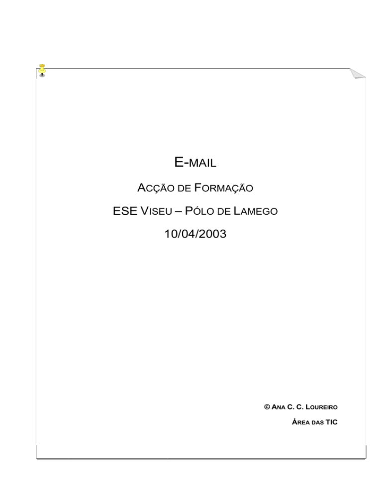 E-MAIL ACÇÃO DE FORMAÇÃO ESE VISEU – PÓLO DE LAMEGO 10/04/2003 © ANA C. C. LOUREIRO ÁREA DAS TIC Acção de Formação Correio electrónico O E-MAIL “O Email (Electronic Mail) ou Correio Electrónico é um sistema de troca de mensagens entre dois ou mais utilizadores. O Email é o serviço mais utilizado na Internet. Este serviço permite-nos enviar e receber mensagens de uma forma rápida, económica e cómoda, sendo apenas necessário possuír um endereço de Email e conhecer o endereço de Email do destinatário. Pode-se obter um endereço de Email através de um fornecedor de acesso à Internet (ISP – Internet Service Provider) como é o caso do NetSapo, do Clix, do IOL, entre outros. O sistema de troca de mensagens é rápido, uma vez que o envio / recepção da mensagem não tem condicionantes geográficas, sendo processado numa questão de segundos ou minutos. A mensagem será recebida quando se estabelecer ligação à Internet, isto porque apesar do computador não estar ligado à Internet a mensagem fica armazenada num servidor de Email que será contactado quando o cliente assim o desejar. Podemos fazer analogia com a caixa de correio tradicional em que só sabemos se temos correspondência se abrirmos a nossa caixa postal. Este serviço de entrega de mensagens é permanente, isto é, funciona 24 horas por dia e 365 dias por ano. Pode-se fazer analogia entre o processamento da correspondência tradicional (snail mail) com a electrónica (electronic mail). Vejamos: para enviarmos uma carta temos que saber o endereço do destinatário, eventualmente colocar o assunto da mensagem, seguida da elaboração do corpo da mensagem; da mesma forma no Email temos que saber o endereço electrónico do destinatário (neste não é necessário colocar o remetente, porque este é colocado automaticamente), devemos sempre colocar o assunto, bem como elaborar o corpo da mensagem. As grandes vantagens da utilização do Email são: não tem que se deslocar geograficamente; não precisa de selo; e é efectuado de uma forma célere.” © Ana C. C. Loureiro TIC / ESEV -2- Acção de Formação Correio electrónico Como enviar uma mensagem Como já foi referido para enviar uma mensagem a um dado utilizador necessitará de conhecer o seu endereço de Email. Pode-se dizer que o endereço de Email é composto por três partes: o nome do utilizador, o símbolo @ (arroba ou at – que significa ‘em’; para obter este símbolo pressione as teclas Alt Gr e 2 simultaneamente), o nome do servidor de Email, e o domínio. Vejamos um exemplo prático: [email protected] - aloureiro em esev.ipv.pt. Note que um endereço de Email nunca pode conter acentos, espaços ou cedilhas. Neste exemplo, vamos utilizar as facilidades do , acessível pelo endereço http://mail.esev.ipv.pt/exchange/. Quando acedemos ao Exchange, devemos introduzir os nossos dados (user name e password) na janela do login. © Ana C. C. Loureiro TIC / ESEV -3- Acção de Formação Correio electrónico Para enviar uma mensagem comece por clicar no botão Novo opção Mensagem ,ea verificará que surge uma nova janela. Nesta janela bastará escrever no campo Para: o endereço de Email do destinatário (no caso de vários destinatários estes deverão estar separados por ponto e vírgula). Se pretender que a mensagem, além de recebida pelos destinatários principais, também seja recebida por outras pessoas poderá colocar os respectivos endereços de Email no campo Cc: (com conhecimento). Para inserir o assunto da mensagem deverá preencher o campo Assunto:. De seguida, colocando o cursor do rato em qualquer ponto do campo de mensagens, escrevemos a mensagem. Por fim clicamos no botão Enviar © Ana C. C. Loureiro TIC / ESEV -4- . Acção de Formação Correio electrónico Exercício 1 Compor e Enviar uma mensagem. Envie a sua opinião sobre o sítio Web ESEV - www.esev.ipv.pt para tal: Entre no http://mail.esev.ipv.pt/exchange/ ; Clique no botão Novo; Preencha o campo Para: com o endereço [email protected]; Preencha o campo Assunto:; Escreva a mensagem; Clique no botão Enviar Como anexar um ficheiro à mensagem Através do correio electrónico podemos enviar todo o tipo de ficheiros (documentos, áudio, vídeo, programas, etc.). Não deverá enviar ficheiros grandes, pelo que deverá utilizar um programa para compactar os ficheiros, por exemplo o Winzip. NOTA: para ver o tamanho do ficheiro clique com a tecla do lado direito do rato em cima do respectivo ficheiro, seleccionando a opção Propriedades. Após compor uma mensagem, tendo em conta os procedimentos descritos anteriormente, clique no botão Anexos . Surgirá uma nova caixa, onde deverá seleccionar o ficheiro a anexar clicando no botão Browse, e depois no botão Anexar. Por fim feche a janela. © Ana C. C. Loureiro TIC / ESEV -5- Acção de Formação Correio electrónico Note que, na janela da nova mensagem, aparece um novo campo ao lado do campo Anexos, onde podemos ver o ficheiro que foi escolhido . Por fim clique no botão Enviar. Esta é a forma mais simples de inserir ou anexar um ficheiro. Para verificar se recebeu uma mensagem com um ficheiro em anexo repare se ao lado de cada mensagem aparece um clip ( ), se for esse o caso tem um ficheiro anexado à mensagem recebida. NOTA: não abra ficheiros de origem duvidosa e não se esqueça de actualizar, todas as semanas, o Antivírus, pois a maior parte dos vírus transmitem-se via Email, mais propriamente através dos anexos!!! © Ana C. C. Loureiro TIC / ESEV -6- Acção de Formação Correio electrónico Estes ficheiros podem ser gravados no disco do nosso computador. Podemos fazê-lo de duas formas: 1. Seleccionamos a mensagem que contém o ficheiro em anexo. Aparecer-nos-á na, janela de mensagens, o ficheiro que vem anexado à mensagem que nos foi enviada; Clicamos, com o botão direito do rato sobre o ficheiro e escolhemos a opção Guardar anexos… (Save target as…); O Surgirá uma nova caixa de diál