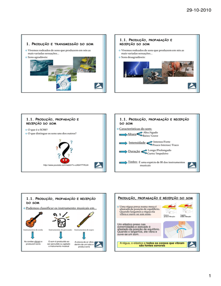29-10-2010 1.1. PRODUÇÃO, PROPAGAÇÃO E 1. PRODUÇÃO E TRANSMISSÃO DO SOM Vivemos rodeados de sons que produzem em nós as mais variadas sensações… Sons agradáveis: RECEPÇÃO DO SOM Vivemos rodeados de sons que produzem em nós as mais variadas sensações… Sons desagradáveis: 1.1. PRODUÇÃO, PROPAGAÇÃO E 1.1. PRODUÇÃO, PROPAGAÇÃO E RECEPÇÃO RECEPÇÃO DO SOM DO SOM O que é o SOM? O que distingue os sons uns dos outros? Características Altura do som: Alto/Agudo Baixo/ Grave Intensidade Duração Longo/Prolongado Curto/ Impulsivo Timbre : É uma espécie de BI dos instrumentos musicais http://www.youtube.com/watch?v=cA64YTYKzl4 1.1. PRODUÇÃO, PROPAGAÇÃO E RECEPÇÃO Intenso/Forte Pouco Intenso/ Fraco PRODUÇÃO, PROPAGAÇÃO E RECEPÇÃO DO SOM DO SOM Podemos classificar os instrumento musicais em… Instrumentos de corda As cordas vibram e produzem sons Instrumentos de percussão O som é produzido ao ser percutido ou agitado o instrumento musical Instrumentos de sopro A coluna de ar vibra dentro de um tubo e produz sons Uma régua presa numa mesa é afastada da posição de equilíbrio. Quando largamos a régua ela vibra e ouve-se um som. Um elástico preso nas extremidades e esticado é afastado da posição de equilíbrio. Quando o largamos, ele vibra e ouve-se um som. A régua, o elástico e todos os corpos que vibram são fontes sonoras 1 29-10-2010 1.1. PRODUÇÃO, PROPAGAÇÃO E RECEPÇÃO 1.1. PRODUÇÃO, PROPAGAÇÃO E RECEPÇÃO DO SOM DO SOM As nossas cordas vocais também são fontes sonoras. Como é que os sons chegam até nós? Os sons propagam-se através dos meios materiais que nos rodeiam. Estes meios podem ser: http://www.youtube.com/watch?v=Wx Xge6UO2bI&feature=related Quando falamos ou cantamos as cordas vocais vibram e provocam a vibração do ar que passa através delas. Gasosos Líquidos Sólidos NO VAZIO O SOM NÃO SE PROPAGA A propagação do som no espaço deve-se ao facto de umas partículas transmitirem o seu movimento às suas partículas vizinhas (e assim sucessivamente) A que a oscilação inicialmente produzida nas nossas cordas vocais ou instrumento musical propaga-se através do espaço aberto, até chegar aos nossos ouvidos. PROPAGAÇÃO DO SOM O som propaga-se no ar através de um movimento ordenado das partículas que o constituem. Quando fazemos vibrar as nossas cordas vocais, ou quando tocamos uma nota musical num instrumento, fazemos com que as partículas do ar que nos rodeiam entrem numa oscilação que dá origem ao som que ouvimos. O ouvido humano é constituído por três zonas distintas: http://telecom.inescn.pt/research/au dio/cienciaviva/natureza_som.html http://www.youtube.com/watch?v=t3INev5FsRU 1.1. PRODUÇÃO, PROPAGAÇÃO E RECEPÇÃO 1.1. PRODUÇÃO, PROPAGAÇÃO E RECEPÇÃO DO SOM DO SOM É formado pela orelha (1), o canal auditivo (2) e uma membrana designada de tímpano (3). Consiste numa caixa onde existe uma cadeia de pequenos ossos (4, 5 e 6), chamados martelo (4), bigorna (5) e estribo (6). Estes ossos recebem as vibrações do tímpano e comunicam-nas ao ouvido interno. 2 29-10-2010 1.1. PRODUÇÃO, PROPAGAÇÃO E RECEPÇÃO 1.1. PRODUÇÃO, PROPAGAÇÃO E RECEPÇÃO DO SOM DO SOM orelha (1) canal auditivo (2) tímpano (3) Formado pelo caracol (7) que é o órgão que converte as ondas sonoras em impulsos nervosos que pelo nervo auditivo transportam a informação ao cérebro. martelo (4) bigorna (5) estribo (6) caracol (7) No final, é o nosso cérebro que descodifica os sons. 1.1. PRODUÇÃO, PROPAGAÇÃO E RECEPÇÃO 1.1. PRODUÇÃO, PROPAGAÇÃO E RECEPÇÃO DO SOM DO SOM O som é captado pelo pavilhão auricular ou orelha. o A forma deste pavilhão “concentra” o som que é canalizado através do canal auditivo até à membrana do tímpano, fazendo-a vibrar, empurrando o martelo, a bigorna e o estribo, o que provoca uma amplificação das vibrações. Estas são transmitidas ao ouvido interno (caracol) onde as células nervosas são excitadas, transformando as vibrações em sinais eléctricos, que são transmitidos pelo nervo auditivo ao cérebro que descodifica estes sinais transformando-os em sensações auditivas. ouvido externo capta as vibrações do ar; o ouvido médio amplifica as vibrações; o ouvido interno transforma as vibrações em mensagens nervosas que são transmitidas ao cérebro. 1.1. PRODUÇÃO, PROPAGAÇÃO E 1.1. PRODUÇÃO, PROPAGAÇÃO E RECEPÇÃO DO SOM RECEPÇÃO DO SOM Para que consigamos ouvir um som é necessário que exista: Síntese • Qualquer corpo que vibra produz um som: é uma fonte sonora. • O som propaga-se por ondas, desde a fonte até aos nossos ouvido através de um meio material. Fonte sonora – onde se produz o som; Meio de propagação – onde o som se propaga Fonte receptora de som – onde o som é ouvido. • Os nossos ouvidos são receptores do som. 3 29-10-2010 1.1. PRODUÇÃO, PROPAGAÇÃO E RECEPÇÃO DO SOM Verifica se sabes 1. Diz, por palavras tuas, o que é: 1. 2. Uma fonte sonora; Um receptor do som. 2. Classifica cada uma das afirmações verdadeira (V) ou falsa (F) seguintes como A – O som é produzido pela vibração dos corpos. B – O som propaga-se apenas no ar. C – O som propaga-se no vazio. D – O som propaga-se na água. E – Os nossos ouvidos são fontes sonoras. 3. Explica a importância da membrana do tímpano. 4 29-10-2010 5 29-10-2010 ESPECTRO SONORO ESPECTRO SONORO (CONT.) Infra-sons - sons de frequência de 0 a 20 Hz (não audíveis) constituem a zona dos . Estes sons provocam náuseas e perturbações intestinais. Sons audíveis, para os seres humanos sons de frequência compreendida entre os 20 Hz e os 20000 Hz. Ultra-sons - sons com frequências muito elevadas, superiores a 20 000 Hz, que o ouvido humano não consegue ouvir . NÍVEL SONORO 6