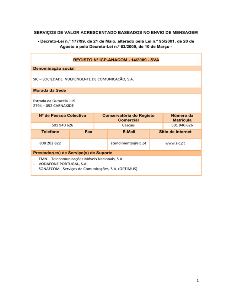 Agosto e pelo Decreto-Lei n.º 63/2009, de 10 de Março REGISTO Nº ICP-ANACOM - 14/2009 - SVA