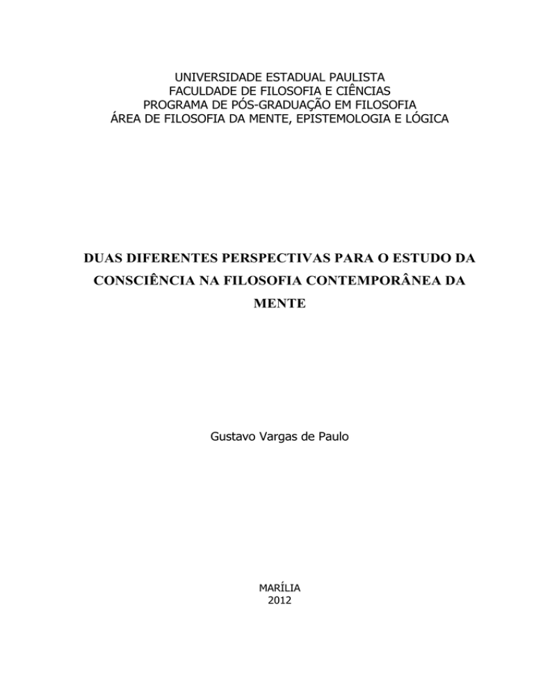 UNIVERSIDADE ESTADUAL PAULISTA FACULDADE DE FILOSOFIA E CIÊNCIAS PROGRAMA DE PÓS-GRADUAÇÃO EM FILOSOFIA ÁREA DE FILOSOFIA DA MENTE, EPISTEMOLOGIA E LÓGICA DUAS DIFERENTES PERSPECTIVAS PARA O ESTUDO DA CONSCIÊNCIA NA FILOSOFIA CONTEMPORÂNEA DA MENTE Gustavo Vargas de Paulo MARÍLIA 2012 UNIVERSIDADE ESTADUAL PAULISTA FACULDADE DE FILOSOFIA E CIÊNCIAS PROGRAMA DE PÓS-GRADUAÇÃO EM FILOSOFIA ÁREA DE FILOSOFIA DA MENTE, EPISTEMOLOGIA E LÓGICA DUAS DIFERENTES PERSPECTIVAS PARA O ESTUDO DA CONSCIÊNCIA NA FILOSOFIA CONTEMPORÂNEA DA MENTE Gustavo Vargas de Paulo Dissertação apresentada ao programa de Pós-graduação em Filosofia da Universidade Estadual Paulista, como parte dos requisitos para obtenção do título de Mestre em Filosofia. Orientadora: Prof.ª Dr.ª Mariana Claudia Broens MARÍLIA 2012 Paulo, Gustavo Vargas de. P331d Duas perspectivas para o estudo da consciência na filosofia / Gustavo Vargas de Paulo. - Marília, 2012 122 f. ; 30 cm. Dissertação (mestrado) – Universidade Estadual Paulista, Faculdade de Filosofia e Ciências 2011 Bibliografia: f. 119-122 Orientador: Mariana Claudia Broens 1.John R. , 1932- 2. Dennett, Daniel Clement. 3. Filosofia da mente. 4. Consciência. 4. Subjetividade. I. Autor. II. Título. CDD 128.2 DUAS DIFERENTES PERSPECTIVAS PARA O ESTUDO DA CONSCIÊNCIA NA FILOSOFIA CONTEMPORÂNEA DA MENTE Gustavo Vargas de Paulo Dissertação apresentada ao programa de Pós-graduação em Filosofia da Universidade Estadual Paulista, como parte dos requisitos para obtenção do título de Mestre em Filosofia. BANCA EXAMINADORA: Presidente Prof.ª Dr.ª Mariana Claudia Broens __________________________________________ 1º. Examinador Prof.Dr. João de Fernandes Teixeira __________________________________________ 2º. Examinador Prof. Dr. Alfredo Pereira Junior __________________________________________ Agradecimentos Dedico este trabalho à minha família sem cujo apoio não teria condições de realizá-lo. Agradeço aos meus tios Ricardo e Hustana pelo apoio e consideração gratuitos. Agradeço ao Prof.º Florêncio de Souza Paz por ter ainda na graduação despertado meu interesse pela área de estudos em que este trabalho se situa. Agradeço à Prof.ª Maria Eunice Gonzalez pela grande receptividade, pela atenção e pelo afinco na condução das pesquisas em que tive a oportunidade de participar. Agradeço à minha orientadora Prof.ª Mariana Claudia Broens pela grande receptividade, pela atenção, pela paciência e pelo cuidado e compromisso na condução de nossas pesquisas. Agradeço aos Profs.º João de Fernandes Teixeira e Alfredo Pereira Junior pelas participações nas bancas examinadoras deste trabalho e pelas valiosas contribuições. Agradeço à FAPESP pelo apoio financeiro disponibilizado para a realização desta pesquisa. Agradeço enfim a todos os professores, amigos e colegas cujas conversas fizeram da filosofia um exercício prazeroso e instigante ajudando a compor trechos de idéias ou mesmo fazendo o meu caminho menos penoso e difícil. Quando as portas se fecham, a mente se abre Quando as velhas idéias cedem, as novas renascem Quando as velas se apagam, as luzes se acendem Quando a voz da natureza não se cala, as pessoas a entendem Vivo em minha própria casa Jamais imitei algo de alguém E sempre ri de todo mestre Que nunca riu de si também Nietzsche RESUMO O objetivo desta dissertação é propor um estudo comparativo envolvendo duas diferentes perspectivas teóricas para o estudo da consciência situadas no contexto da Filosofia Contemporânea da Mente e das Ciências Cognitivas. Analisaremos criticamente seus pressupostos, suas divergências e o alcance de suas propostas considerando os filósofos da mente John R. Searle e Daniel C. Dennett como paradigmas representantes de cada uma das duas perspectivas. A filosofia da mente de John Searle caracteriza-se por levar em consideração os aspectos subjetivos dos estados conscientes em uma perspectiva que nunca permite dispensar ou desconsiderar os dados de primeira pessoa no estudo da consciência. Estes dados geralmente dizem respeito às experiências conscientes e às peculiares impressões e sensações internas tais como os qualia. Por outro lado, Daniel Dennett adota a perspectiva de terceira pessoa no estudo da consciência, buscando critérios científicos para o desenvolvimento deste estudo sustentado por dados publicamente observáveis e intersubjetivamente definíveis. Estes dados levam em conta as evidências comportamentais, informacionais ou neurofisiológicas que remetem a aspectos mentais, tentando assim estabelecer uma relação explicativa destes com o que se entende por consciência. No atual campo de pesquisas da Filosofia da Mente junto às Ciências Cognitivas não há consenso sobre o método mais adequado para o estudo da consciência sendo, ao contrário disso, composto por várias divergências. Por este motivo, consideramos relevante uma confrontação entre as principais perspectivas utilizadas no estudo do assunto. Buscaremos realizar esta tarefa analisando as contribuições das teorias estudadas para a elucidação da relação subjetividade/objetividade dos estados conscientes. Palavras-chave: Filosofia da Mente; John Searle; Daniel Dennett; Consciência; Subjetividade. ABSTRACT This research is a comparative study of two different theoretical perspectives on the study of the consciousness, in the context of the contemporary philosophy of mind and the cognitive sciences. We analyze their presuppositions, their differences, and the reach of the two proposals, considering the philosophers of mind John R. Searle and Daniel C. Dennett as paradigmatic representatives of each of the two perspectives. The philosophy of mind of John Searle is characterized by the taking into consideration of the subjective aspects of conscious states, in a perspective that never allows the discarding or ignoring of first person data. These data generally have