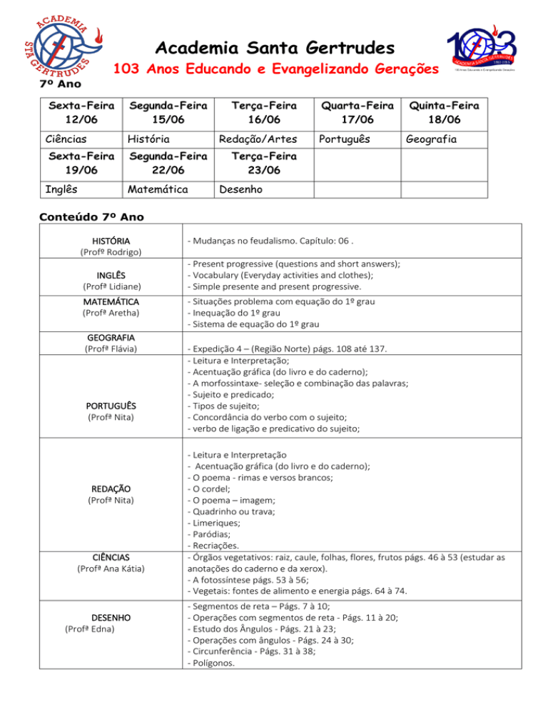 Academia Santa Gertrudes 103 Anos Educando e Evangelizando Gerações 7º Ano Sexta-Feira 12/06 Segunda-Feira 15/06 Ciências História Sexta-Feira 19/06 Segunda-Feira 22/06 Inglês Matemática Terça-Feira 16/06 Redação/Artes Quarta-Feira 17/06 Português Quinta-Feira 18/06 Geografia Terça-Feira 23/06 Desenho Conteúdo 7º Ano HISTÓRIA (Profº Rodrigo) INGLÊS (Profª Lidiane) MATEMÁTICA (Profª Aretha) GEOGRAFIA (Profª Flávia) PORTUGUÊS (Profª Nita) REDAÇÃO (Profª Nita) CIÊNCIAS (Profª Ana Kátia) DESENHO (Profª Edna) - Mudanças no feudalismo. Capítulo: 06 . - Present progressive (questions and short answers); - Vocabulary (Everyday activities and clothes); - Simple presente and present progressive. - Situações problema com equação do 1º grau - Inequação do 1º grau - Sistema de equação do 1º grau - Expedição 4 – (Região Norte) págs. 108 até 137. - Leitura e Interpretação; - Acentuação gráfica (do livro e do caderno); - A morfossintaxe- seleção e combinação das palavras; - Sujeito e predicado; - Tipos de sujeito; - Concordância do verbo com o sujeito; - verbo de ligação e predicativo do sujeito; - Leitura e Interpretação - Acentuação gráfica (do livro e do caderno); - O poema - rimas e versos brancos; - O cordel; - O poema – imagem; - Quadrinho ou trava; - Limeriques; - Paródias; - Recriações. - Órgãos vegetativos: raiz, caule, folhas, flores, frutos págs. 46 à 53 (estudar as anotações do caderno e da xerox). - A fotossíntese págs. 53 à 56; - Vegetais: fontes de alimento e energia págs. 64 à 74. - Segmentos de reta – Págs. 7 à 10; - Operações com segmentos de reta - Págs. 11 à 20; - Estudo dos Ângulos - Págs. 21 à 23; - Operações com ângulos - Págs. 24 à 30; - Circunferência - Págs. 31 à 38; - Polígonos.