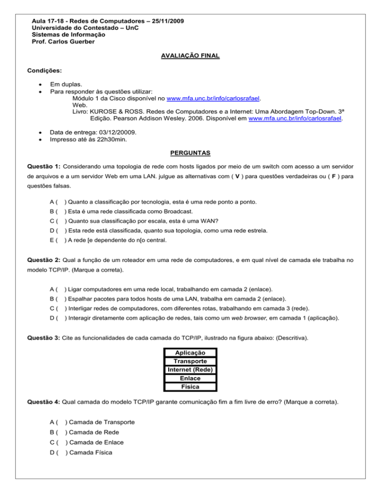 Aula 17-18 - Redes de Computadores – 25/11/2009 Universidade do Contestado – UnC Sistemas de Informação Prof. Carlos Guerber AVALIAÇÃO FINAL Condições: Em duplas. Para responder às questões utilizar: Módulo 1 da Cisco disponível no www.mfa.unc.br/info/carlosrafael. Web. Livro: KUROSE & ROSS. Redes de Computadores e a Internet: Uma Abordagem Top-Down. 3ª Edição. Pearson Addison Wesley. 2006. Disponível em www.mfa.unc.br/info/carlosrafael. Data de entrega: 03/12/20009. Impresso até às 22h30min. PERGUNTAS Questão 1: Considerando uma topologia de rede com hosts ligados por meio de um switch com acesso a um servidor de arquivos e a um servidor Web em uma LAN. julgue as alternativas com ( V ) para questões verdadeiras ou ( F ) para questões falsas. A( ) Quanto a classificação por tecnologia, esta é uma rede ponto a ponto. B( ) Esta é uma rede classificada como Broadcast. C( ) Quanto sua classificação por escala, esta é uma WAN? D( ) Esta rede está classificada, quanto sua topologia, como uma rede estrela. E( ) A rede [e dependente do n[o central. Questão 2: Qual a função de um roteador em uma rede de computadores, e em qual nível de camada ele trabalha no modelo TCP/IP. (Marque a correta). A( ) Ligar computadores em uma rede local, trabalhando em camada 2 (enlace). B( ) Espalhar pacotes para todos hosts de uma LAN, trabalha em camada 2 (enlace). C( ) Interligar redes de computadores, com diferentes rotas, trabalhando em camada 3 (rede). D( ) Interagir diretamente com aplicação de redes, tais como um web browser, em camada 1 (aplicação). Questão 3: Cite as funcionalidades de cada camada do TCP/IP, ilustrado na figura abaixo: (Descritiva). Aplicação Transporte Internet (Rede) Enlace Física Questão 4: Qual camada do modelo TCP/IP garante comunicação fim a fim livre de erro? (Marque a correta). A( ) Camada de Transporte B( ) Camada de Rede C( ) Camada de Enlace D( ) Camada Física Questão 5: Qual das opções abaixo melhor justifica a necessidade de utilização de switches nível 2? (Escolha duas opções). A( ) Reduzir as colisões B( ) Incrementar as colisões C( ) Decrementar o número de domínios de colisões D( ) Aumentar o número de domínio de colisão E( ) Aumentar o número de domínio de broadcast Questão 6: Usando como base o endereço 192.168.0.1/24, o que este /24 indica? (Marque a alternativa errada) A( ) Número de bits que representam a máscara de sub-rede B( ) É a própria máscara de rede C( ) O último octeto da máscara é 00000000 D( ) O último octeto da máscara é 11111111 Questão 7: Quantos bits são necessários para determinar a classe C IPv4. (Marque a correta) A( )0 B( )1 C( )2 D( )3 E( ) Nenhum bit. Questão 8: Cite 3 (três) meios físicos utilizados para instalar ethernet. (Discursiva) Questão 9: Complete a segunda camada de acordo com a primeira. A - Camada de Aplicação ( ) Roteador B - Camada Transporte ( ) Placa de Rede C - Camada de Rede ( ) TCP D - Camada de Enlace ( ) HTTP E – Camada Física ( ) UTP Questão 10: Qual dessas formas garante que nenhum host vai transmitir mais rápido que um outro pode receber. (Marque a correta) A( ) Half Duplex B( ) Full Duplex C( ) Simplex D( ) Nenhum das formas garante isso Questão 11: Qual dos elementos abaixo é usado pela camada de enlace para encontrar hosts na rede. (Marque a correta) A( ) Endereço lógico B( ) Número de Portas C( ) Endereço de Hardware D( ) Endereço de Roteador Questão 12: Em quais das situações abaixo é necessário o uso de cabo crossover. (Escolha duas alternativas) A( ) Ligação de um servidor a um hub B( ) Ligação de uma estação de trabalho a um roteador C( ) Ligação de uma porta de um switch a um servidor D( ) Ligação entre duas estações de trabalho Questão 13: Um endereço MAC é formado por quantos bits. (Marque a correta) A( ) 46 B( ) 16 C( ) 48 D( )6 Questão 14: Qual padrão estabelecido pelo IEEE 802 define o método de acesso ao meio CSMA/CD. (Marque a correta) A( ) 802.3 B( ) 802.5 C( ) 802.2 D( ) 802.1 Questão 15: Qual a velocidade de transmissão de dados de um cabo UTP Cat. 5E. (Marque a correta) A( ) 100 Mbps B( ) 100 MBps C( ) 10 Mbps D( ) 1000 Mbps Questão 16: De acordo com o padrão TIA/EIA 568 A o par 4 é formado por que par de pinos. A( )7e8 B( )5e6 C( )3e4 D( )1e2 Questão 17: O cabo de categoria 6 também é chamado de: (Marque a correta) A( ) 1000BaseT B( ) 100BaseT C( ) 100BaseTX D( ) nenhuma das respostas Questão 18: Que protocolo trabalha na camada de transporte, porém não oferece confiabilidade (Marque a correta). A( ) ARP B( ) TCP C( ) UTP D( ) UDP Questão 19: Qual dos serviços abaixo não trabalha na camada de aplicação. (Marque a correta) A( ) SNMP B( ) TFTP C( ) TCP D( ) FTP Questão 20: O processo de resolução de endereço de IP para MAC é chamado de: (Marque a correta) A( ) ARP B( ) DHCP C( ) RARP D( ) DNS Questão 21: Que parte do cabeçalho IP tem como finalidade identificar que o datagrama pode ser fragmentado. (Marque a correta) A( ) Fragment offset B( ) Protocol C( ) Total Length D( ) Flags Summary Questão 22: Usando o endereço de rede 192.168.10.0 e a máscara 255.255.255.224, responda os itens abaixo: A - Quantas sub-redes é possível ter? ____________________ B – Quantos hosts por sub-rede é possível alocar? _____________________ C – Descreva abaixo o range de 2 sub-redes, dizendo quais endereços são de rede e quais são de broadcast. ID REDE _________________, RANGE _________________, BROADCAST ________________ ID REDE _________________, RANGE _________________, BROADCAST ________________ Questão 23: Considere a seguinte informação: Um host cujo IP é 170.85.8.11 tenta se comunicar com outro cujo IP é 170.85.15.11, ambos usam máscara de sub-rede 255.255.248.0. Responda: os dois poderão se comunicar diretamente ou o pacote precisa ser enviado para o Default Gateway pelo fato de o host de destino ser remoto. (Discursiva) Questão 24: Dos intervalos abaix