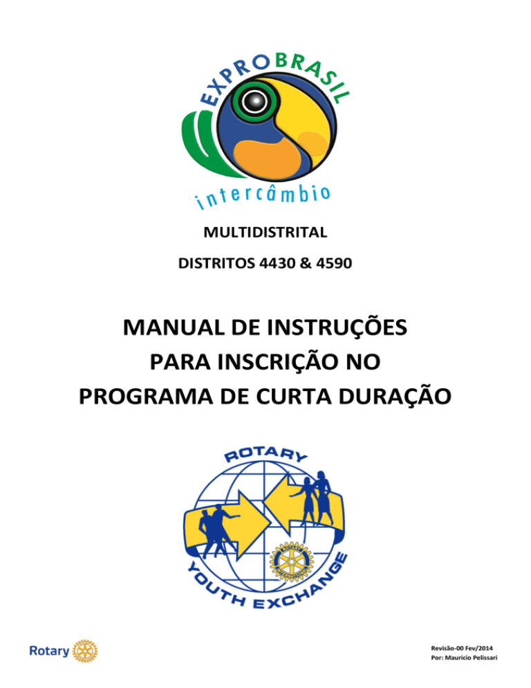 MULTIDISTRITAL DISTRITOS 4430 & 4590 MANUAL DE INSTRUÇÕES PARA INSCRIÇÃO NO PROGRAMA DE CURTA DURAÇÃO Revisão-00 Fev/2014 Por: Mauricio Pelissari ÍNDICE Página I- Introdução.................................................................................................................................. 02 II- Processo Interno do Clube........................................................................................................ 03 III- Procedimentos Iniciais............................................................................................................... 03 IV- Inserção de Dados no Sistema rotary-yep.net.......................................................................... 04 V- Conferência de Dados no Sistema rotary-yep.net..................................................................... 32 VI- Application Form........................................................................................................................ 33 VII- Conferência de Documentos..................................................................................................... 50 VIII- Digitalização de Documentos.................................................................................................... 50 IX- Envio de Documentos para a EXPRO BRASIL®...................................................................... 51 X- Inserção de Documentos no Sistema rotary-yep.net................................................................. 52 EXPRO BRASIL® DISTRITOS 4430 e 4590 EXPRO BRASIL® INTERCÂMBIO INTERNACIONAL DE JOVENS Av. Higienópolis, 996, 5º andar Sala 509 São Paulo – SP CEP 01.238-910 TEL.: 11 3825-2921 , 11 3829-2947 e 11 9 4815 3333 www.rotaryintercambio.com.br - [email protected] EXPRO BRASIL ® –PROGRAMA DE CURTA DURAÇÃO- INSCRIÇÃO – REV00 FEV2014 Página 1 de 60 I – INTRODUÇÃO Caros Candidatos, Pais, Oficiais do Programa de Intercâmbio de Jovens (PIJ) dos clubes e demais companheiros envolvidos com o PIJ: A Expo Brasil® desenvolveu este manual com o objetivo de facilitar o processo de inscrição no processo classificatório para o programa de curta duração. Neste Manual, descrevemos detalhadamente todos os passos para a elaboração de todos os documentos necessários. Em caso de duvidas, procure o Oficial de Intercâmbio de seu Rotary Club ou o Coordenador de Área. Boa Sorte! Equipe Expro Brasil®. EXPRO BRASIL ® –PROGRAMA DE CURTA DURAÇÃO- INSCRIÇÃO – REV00 FEV2014 Página 2 de 60 II – PROCESSO INTERNO DO CLUBE 1) O Candidato deve procurar um Rotary Club, pertencente ao distrito 4430 ou 4590 que seja o mais próximo de sua residência. 2) Após passar pelos processos internos de seleção do clube o Candidato pode iniciar o processo sua inscrição na EXPRO BRASIL® III – PROCEDIMENTOS INICIAIS 1) O Candidato deve acessar o website www.exprobrasil.com.br e baixar os seguintes documentos: - Formulário de Inscrição do Programa de Curta Duração - Contrato do Programa de Curta Duração 2) Com a orientação do Oficial de Intercâmbio, o Candidato deve preencher os seguintes documentos: - Formulário de Inscrição do Programa de Curta Duração - Contrato do Programa de Curta Duração 3) O Candidato deve providenciar todas as assinaturas, com caneta azul, dos seguintes documentos: - Formulário de Inscrição do Programa de Curta Duração - Contrato do Programa de Curta Duração 4) O Candidato deve digitalizar os documentos abaixo após assinados, em formato pdf, em tamanho A4, e em um único arquivo, tomando cuidado para que não fique torto e nem de ponta cabeça. - Formulário de Inscrição do Programa de Curta Duração - Contrato do Programa de Curta Duração 5) O Candidato deve entregar o arquivo dos documentos digitalizados para o Oficial de Intercâmbio 6) O Oficial de Intercâmbio deve enviar o arquivo dos documentos digitalizados, via e-mail para [email protected], com cópias para Candidato, Chairman e Coordenador de Área. 7) Após conferência da documentação, a EXPRO BRASIL® ira enviar o boleto para o pagamento da inscrição, em até 5 dias úteis, para a pessoa indicada no formulário de inscrição. Via e-mail, com cópias para Candidato, Chairman, Coordenador de Área e Oficial de Intercâmbio. 8) Após o recebimento do pagamento do boleto, a EXPRO BRASIL® comunica via e-mail o Oficial de Intercâmbio para que faça o cadastro do Candidato no sistema rotary-yep.net, com cópias para Chairman e Coordenador de Área. 9) O Oficial de Intercâmbio, cadastra o Candidato no sistema rotary-yep.net, e envia o Link de acesso ao sistema para o e-mail do Candidato (E-mail que consta na ficha de inscrição). EXPRO BRASIL ® –PROGRAMA DE CURTA DURAÇÃO- INSCRIÇÃO – REV00 FEV2014 Página 3 de 60 IV – INSERÇÃO DE DADOS NO SISTEMA ROTARY-YEP.NET APPLICATION FORM - DADOS DO CANDIDATO O Candidato recebe um e-mail com um link para preencher seus dados iniciais do application form. O Acesso deve ser feito, somente utilizando O Browser Internet Explorer 8 ou versões anteriores. O sistema não funciona para Google Crome, Firefox ou Safari. 01 01 – Selecione: O Link As informações abaixo se referem ao Candidato 02 – Selecione: Next>> 02 EXPRO BRASIL ® –PROGRAMA DE CURTA DURAÇÃO- INSCRIÇÃO – REV00 FEV2014 Página 4 de 60 03 – No campo: Street:, Informe: O endereço do Candidato (rua , número e bairro) . Em Português. 04 – No campo: Zip Code:, Informe: O CEP do endereço do Candidato 03 05 – No campo: City:, Informe: A Cidade do Endereço do Candidato 04 06 – No campo: State:, Informe: O Estado do Endereço do Candidato 07 – No campo: Private Phone:, Informe: O Número do telefone residencial do Candidato 05 06 07 08 – No campo: Mobile 1:, Informe: O Número do telefone celular do Candidato 09 – No campo: Birthday:, Informe: A data de nascimento do Candidato 10 – No campo: Birthplace:, Informe: A Cidade de nascimento do Candidato 11 – No ca