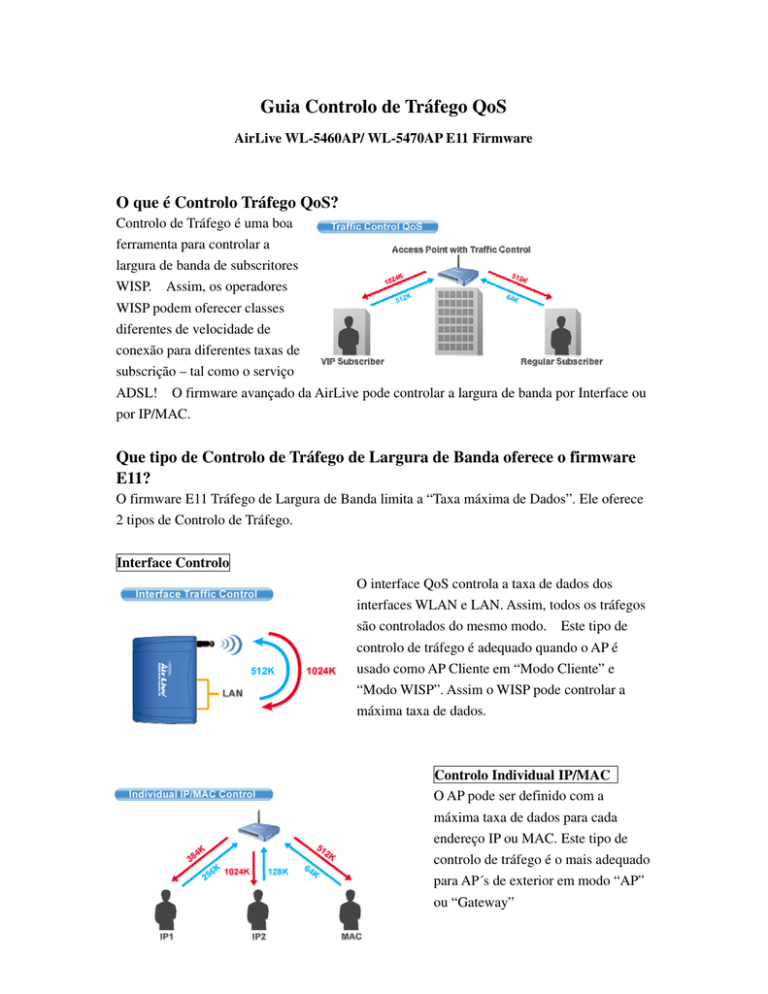 Guia Controlo de Tráfego QoS AirLive WL-5460AP/ WL-5470AP E11 Firmware O que é Controlo Tráfego QoS? Controlo de Tráfego é uma boa ferramenta para controlar a largura de banda de subscritores WISP. Assim, os operadores WISP podem oferecer classes diferentes de velocidade de conexão para diferentes taxas de subscrição – tal como o serviço ADSL! O firmware avançado da AirLive pode controlar a largura de banda por Interface ou por IP/MAC. Que tipo de Controlo de Tráfego de Largura de Banda oferece o firmware E11? O firmware E11 Tráfego de Largura de Banda limita a “Taxa máxima de Dados”. Ele oferece 2 tipos de Controlo de Tráfego. Interface Controlo O interface QoS controla a taxa de dados dos interfaces WLAN e LAN. Assim, todos os tráfegos são controlados do mesmo modo. Este tipo de controlo de tráfego é adequado quando o AP é usado como AP Cliente em “Modo Cliente” e “Modo WISP”. Assim o WISP pode controlar a máxima taxa de dados. Controlo Individual IP/MAC O AP pode ser definido com a máxima taxa de dados para cada endereço IP ou MAC. Este tipo de controlo de tráfego é o mais adequado para AP´s de exterior em modo “AP” ou “Gateway” O que significa a Taxa de Saída? A “Taxa de Saída” é a velocidade de dados saídos de uma interface. Existem 3 tipos de Taxa de Saída suportados pelo AP 1. LAN Output Rate: É a velocidade de tráfego saído da porta LAN. Em modo gateway, a Taxa Saída LAN inclui ambas a LAN com fios e WLAN interface. 2. WLAN Output Rate: É a velocidade de tráfego saído da LAN Wireless 3. WAN Output Rate: É a velocidade do tráfego saído da porta WAN. Em modo WISP, a WAN Output Rate inclui também o interface WLAN. O Web UI do AP diz-lhe que tipos de taxa de saída suporta, difere de cada modo wireless. No exemplo seguinte: O AP está no Modo Gateway O WAN Output Rate é 128K O LAN/WLAN Output Rate é 1024K Nesta configuração, os utilizadores de notebook obtém uma largura de banda upstream de 128K e uma largura de banda downstream de 1024K. Configurar o Controlo de Tráfego QoS Da página Mode Setting, escolha por favor o “Traffic Control(QoS)” mostrado na parte inferior da lista. Ao clicar no botão “setup”, aparecerá uma nova janela com as definições do Controlo de Tráfego. Estão divididos em secções “A”, “B”, “C”, “D” para mais esclarecimentos. A B C D Esta secção é a sessão do “Interface Controlo”. Tem que desactivar o “interface Traffic Control” se pretender usar o “IP/MAC Traffic Control” Esta secção é para definir a “Politica” de “Individual IP/MAC Traffic Control”. Uma vez definida a politica, ela pode ser escolhida como modelo em IP/MAC Traffic Control Settings Esta secção é para configurar a largura de banda por endereço IP. Pode controlar mais do que um endereço IP. Esta secção é para configurar a largura de banda por endereço MAC. Pode controlar mais de que um endereço MAC. address. A. Definições Controlo Interface: Nas definições Controlo Interface, o AP só controla o limite total da largura de banda de uma interface.. Por exemplo, Se pretender limitar a taxa de saída de dados da LAN para 512K e a taxa de saída de dados da WLAN para 1024K. Deve executar os seguintes passos: 1. Active o “Interface Traffic Control 2. Digite “512” em “LAN Output Rate” 3. Digite “1024” em “WLAN Output Rate” 4. Clique em “Save” 5. Reboot o AP. B. Definir Politica (Policy) A política é um conjunto de regras de largura de banda que podem ser usadas como um modelo. Por exemplo, se pretender fornecer 2 tipos de velocidade de largura de banda para os utilizadores: VIP Subscritor: LAN Taxa Saída: 512 Kbps WLAN Taxa Saída: 1024 Kbps Regular Subscritor: LAN Taxa Saída: 64 Kbps WLAN Taxa Saída: 512 Kbps Pode configurar a regra de largura de banda com politicas “VIP” e “Regular”. Siga por favor os passos em baixo para criar uma nova politica “VIP” 1. 2. Digite “VIP” para o “PolicyName” Digite “512” para o “LAN Out Rate” 3. Digite “1024” para o “WLAN Out Rate” 4. Digite “VIP Subscriber” para o “Comment” 5. 6. Clique no botão “Save” Aparecerá agora a politica “VIP” em “Current Policy Table” Uma vez terminada, o administrador estará apto a escolher a politica “VIP” para o seu IP/MAC Traffic Control. C. Controlo de Largura de Banda por endereço IP Pode definir a máxima largura de banda de um PC ou um subscritor usando IP Controlo. Siga por favor o procedimento em baixo para definir o IP Traffic Control 1. Certifique-se por favor se o “Interface Traffic Control” está desactivado 2. Antes de começar, verifique por favor a seguinte área para ver que IPs de clientes são suportados. Isso difere de entre de cada modo. Veja por favor esta parte para descobrir endereços IP suportados. Isso difere de entre de cada modo. 3. 4. 5. 6. 7. Active IP Control Se já definiu uma Politica, escolha por favor o nome da Politica. O “Out Rates” será automaticamente copiado do modelo Politica (Policy). Não pode mudar o Out Rates se tiver escolhido uma Politica. Se pretender definir nova Taxa de Dados (Data Rate), não escolha por favor nenhumas Politicas. Assim poderá entrar os valores em “LAN”, “WLAN”, ou “WAN” Out Rates. Prima “Save” para guardar as definições Reboot o seu AP. * Se pretender controlar o fluxo de tráfego entre IPs dentro da mesma interface, certifique-se por favor que ambos IPs estão configurados para o IP Traffic Control. D. Controlo Largura de Banda por endereço MAC Pode definir a máxima largura de banda de um PC ou um subscritor usando MAC Controlo. Siga por favor o procedimento em baixo para definir MAC Traffic Control 1. Certifique-se por favor se o “Interface Traffic Control” está desactivado 2. 3. Antes de começar, verifique por favor a seguinte área para ver que IPs de clientes são suportados. Isso difere de entre de cada mo