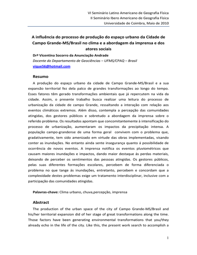 VI Seminário Latino Americano de Geografia Física II Seminário Ibero Americano de Geografia Física Universidade de Coimbra, Maio de 2010 A influência do processo de produção do espaço urbano da Cidade de Campo Grande-MS/Brasil no clima e a abordagem da imprensa e dos atores sociais Drª Vicentina Socorro da Anunciação Andrade Docente do Departamento de Geociências – UFMS/CPAQ – Brasil [email protected] Resumo A produção do espaço urbano da cidade de Campo Grande-MS/Brasil e a sua expansão territorial fez dela palco de grandes transformações ao longo do tempo. Esses fatores têm gerado transformações ambientais que já repercutem na vida da cidade. Assim, o presente trabalho busca realizar uma leitura do processo de urbanização da cidade de campo Grande, ressaltando a interação com relação aos eventos climáticos extremos. Além disso, contempla a percepção das comunidades atingidas, dos gestores públicos e sobretudo a abordagem da imprensa sobre o referido problema. Os resultados apontam que concomitantemente à intensificação do processo de urbanização, aumentaram os impactos da precipitação intensa. A população campo-grandense de uma forma geral convivem com o problema que, gradativamente, tem sido amenizado em virtude das obras implementadas, visando conter as inundações. No entanto ainda sente insegurança quanto á possibilidade de ocorrência de novos eventos. A imprensa notifica os eventos pluviométricos que causam maiores inundações e impactos, dando maior destaque ás perdas materiais, deixando de perceber os sentimentos das pessoas atingidas. Os gestores públicos, pelas suas diferentes formações escolares, percebem de forma diferenciada o problema no que tange ás inundações, entretanto, percebem e concordam que a complexidade destes problemas exige um tratamento interdisciplinar, inclusive com a participação das comunidades atingidas. Palavras-chave: Clima urbano, chuva,percepção, imprensa Abstract The production of the urban space of the city of Campo Grande-MS/Brasil and his/her territorial expansion did of her stage of great transformations along the time. Those factors have been generating environmental transformations that you/they already echo in the life of the city. Like this, the present work search to accomplish a 1 Tema 3- Geodinâmicas: entre os processos naturais e socio-ambientais reading of the process of urbanization of the city of Big field, emphasizing the interaction regarding the extreme climatic events. Besides, it contemplates the reached communities' perception, of the public managers and above all the approach of the press on him referred problem. The results point that at the same time to the intensification of the urbanization process, increased the impacts of the intense precipitation. The population campograndense in general they live together with the problem that, gradually, it has been softened because of the implemented works, seeking to contain the floods. However it still feels insecurity as a possibility of occurrence of new events. The press notifies the events about strong rain you/they cause larger floods and impacts, giving larger prominence ace material losses, stopping noticing the reached people's feelings. The public managers, for their different school formations, notice in a differentiated way the problem in what plays ace floods, however, they notice and they agree that the complexity of these problems demands an interdisciplinary treatment, besides with the reached communities' participation. Keywords: urban climate- rain- perception- press INTRODUÇÃO A cidade é uma construção humana bastante antiga cuja concepção genérica pode ser expressa pela aglomeração de pessoas (mais equipamentos e edificações) e seu dinamismo (atividade) num determinado local. A estruturação, morfologia e funcionalidade das cidades como se observa hoje, tem todavia sua origem num momento bem preciso da história da humanidade, da necessidade de se organizar um dado espaço, visando atender a necessidade do grupo no lugar e assim se constituiu ao longo do tempo assumindo formas e conteúdos diversos, desse modo, reflete os diferentes ambientes culturais e as variadas estruturas econômicas que envolvem a sua produção. Como afirma Lombardo “a cidade é a maior expressão social do espaço produzido e sua realidade mais complexa e transformada”. Lombardo (1985:20) O desenvolvimento dos estudos ambientais urbanos, tornaram mais acentuados, no século XX, pois mesmo não correspondendo às necessidades de bem estar das pessoas, o espaço urbano continua sendo um atrativo populacional em potencial, pois é o tipo de organização espacial que mais facilita a difusão das inovações, as trocas de bens, serviços e informações. Para Monteiro “a urbanização é um fenômeno irreversível e a cidade será cada vez mais o habitat do homem” Monteiro (1976:60). Assim, considera necessário partir 2 VI Seminário Latino Americano de Geografia Física II Seminário Ibero Americano de Geografia Física Universidade de Coimbra, Maio de 2010 para uma conduta de investigação baseada não na dicotomia, mas na relação coparticipativa homem/natureza. As cidades por se constituírem em um espaço produtivo, os inúmeros agentes sociais, vêem nesta apenas um centro de produção de capitais, e vendem a imagem das qualidades do espaço construído em substituição ao espaço e/ou ambientes naturais. Dessa forma, é justamente nos espaços urbanizados que o homem percebe as principais mudanças no clima, decorrentes da interferência provocada pela estrutura urbana nas trocas de energia entre a superfície e a atmosfera.Referindo-se especificamente a cidade de Campo Grande (figura 1), sua ocupação urbana iniciou-se no século XIX através da instalação de fazendas formadas por mineiros atraídos pela zona de pasto nativo e sedimentou-se na confluência dos Córregos Prosa e Segredo. Atualmen