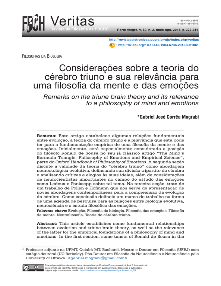 Veritas Revista de Filosofia da PUCRS ISSN 0042-3955 e-ISSN 1984-6746 Porto Alegre, v. 60, n. 2, maio-ago. 2015, p. 222-241 http://revistaseletronicas.pucrs.br/ojs/index.php/veritas : http://dx.doi.org/10.15448/1984-6746.2015.2.21861 Filosofias da Biologia Considerações sobre a teoria do cérebro triuno e sua relevância para uma filosofia da mente e das emoções Remarks on the triune brain theory and its relevance to a philosophy of mind and emotions *Gabriel José Corrêa Mograbi Resumo: Este artigo estabelece algumas relações fundamentais entre evolução, a teoria do cérebro triuno e a relevância que esta pode ter para a fundamentação empírica de uma filosofia da mente e das emoções. Inicialmente, será especialmente considerada a posição do filósofo Ronald de Sousa no seu já clássico artigo “The Mind’s Bermuda Triangle: Philosophy of Emotions and Empirical Science”, parte do Oxford Handbook of Philosophy of Emotions. A segunda seção discute a validade da teoria do “cérebro triuno” como abordagem neuroetológica evolutiva, delineando sua divisão tripartite do cérebro e analisando críticas e elogios às suas ideias, além de considerações de neurocientistas importantes no campo do estudo das emoções como Ledoux e Panksepp sobre tal tema. Na terceira seção, trato de um trabalho de Pollen e Hofmann que nos serve de apresentação de novas abordagens contemporâneas para a compreensão da evolução do cérebro. Como conclusão delineio um marco de trabalho na forma de uma agenda de pesquisa para as relações entre biologia evolutiva, neurociência e o estudo filosófico das emoções. Palavras-chave: Evolução. Filosofia da biologia. Filosofia das emoções. Filosofia da mente. Neurofilosofia. Teoria do cérebro triuno. Abstract: This article establishes some fundamental relationships between evolution and triune brain theory, as well as the relevance of the latter for the empirical foundations of a philosophy of mind and emotions. In the first section, some tenets of Ronald de Sousa in the *Professor adjunto na UFMT, Cuiabá-MT. Bacharel, Mestre e Doutor em Filosofia (UFRJ) com estágio doutoral (UC Berkeley). Pós-Doutor em Filosofia da Neurociência e Neurociência pela University of Ottawa. <[email protected]>. Este artigo está licenciado sob forma de uma licença Creative Commons Atribuição 4.0 Internacional, que permite uso irrestrito, distribuição e reprodução em qualquer meio, desde que a publicação original seja corretamente citada. http://creativecommons.org/licenses/by/4.0/deed.pt_BR G. J. C. Mograbi – Considerações sobre a teoria do cérebro triuno ... already classic article “The Mind’s Bermuda Triangle: Philosophy of Emotions and Empirical Science”, part of Oxford Handbook of Philosophy of Emotions, will especially be considered. The second section discusses the validity of the theory of the “triune brain” as a neuroethological evolutionary approach, outlining its tripartite division and analyzing criticism and praise of its ideas. The section also considers remarks from important neuroscientists in the field of emotions, such as Ledoux and Panksepp. In the third section, I take into account a paper by Pollen and Hofmann which puts forward new contemporary approaches to the understanding of brain evolution. As a conclusion, I delineate a framework for the relationship between neuroscience and the philosophical study of emotions presented as a research agenda. Keywords: Evolution. Philosophy of biology. Philosophy of emotions. Philosophy of mind. Neurophilosophy. Triune brain theory. 1 Introdução O tema a ser explorado aqui não é dos mais óbvios. Bem ao contrário, é de extrema complexidade. Desta maneira, vale adiantar que o conjunto de ideias, que aqui coordenamos para abordar o tema, não é uma bula definitiva, mas um mapa geral, meramente esquemático. Pretendo evitar, ao máximo, tecnicismos gratuitos e jargões e me direcionar a uma audiência que possa incluir todos pares acadêmicos interessados. Minha intenção é esclarecer alguns aspectos norteadores da relação entre evolução, cérebro e mente no que concerne à autorregulação da ação pela mente. Mais precisamente, minha intenção é evidenciar de que maneira o processo evolutivo que engendrou a espécie humana foi capaz de nos dotar com um cérebro altamente desenvolvido e especializado em termos de sua estrutura e capaz de exercer um conjunto de funções igualmente complexo ao qual chamamos mente. Assim, poderemos pensar de que maneira o processo evolutivo foi capaz de criar seres vivos com capacidades cognitivas e emocionais complexas e variadas através da mutação, seleção natural e relacionamento com o meio-ambiente, inclusive no nível cultural. Além das explicações darwinistas mais tradicionais, faremos uso de hipóteses neodarwinistas e pós-darwinistas com diferentes graus de discordância com as hipóteses originais de Darwin, mas claramente estabelecidas dentro do quadro da síntese evolutiva no seu sentido mais atual e, assim, alargado. Isto equivale a dizer que as ideias que aqui se estabelecem podem ser consideradas darwinistas no sentido contemporâneo, considerando extrapolações, correções e melhorias no sistema de pensamento do autor. Para tratarmos de como nossa mente apresenta as capacidades que hoje a configuram, Veritas | Porto Alegre, v. 60, n. 2, maio-ago. 2015, p. 222-241 223 G. J. C. Mograbi – Considerações sobre a teoria do cérebro triuno ... precisaremos pensar também questões relativas à coevolução de cérebro, mente e cultura. Voltando à questão do nosso tema nesse capítulo, vale dizer que o escopo de meu interesse é o subfilo Vertebrata, especialmente os mamíferos e mais especificamente o Homo sapiens sapiens. Não se trata de um chauvinismo dos mamíferos ou dos seres humanos, mas, devemos entender que humanos desenvolveram linguagem e cultura a tal nível que algumas de suas 
