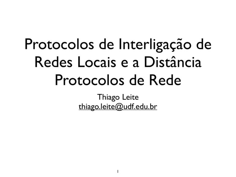 Protocolos de Interligação de Redes Locais e a Distância Protocolos de Rede Thiago Leite [email protected] 1 Falha de Conexão 2 Protocolos de Rede • Funções da camada de rede • transmissão fim-a-fim • precisa conhecer a topologia de rede • determina a escolha de caminhos 3 Rede de computadores sob o ponto de vista da camada de rede 4 Protocolos de Rede • Serviços oferecidos pela camada de rede utilizando TCP/IP • Endereçamento uniforme (válido em LANs e WANs) • Comunicação sem conexões 5 Protocolos de Rede • Serviços não orientados a conexão • Pacotes são chamados datagramas • Rede de datagramas • Cada pacote é transporte independentemente sem ordenação ou fluxo 6 Protocolos de Rede • Serviços não orientados a conexão • Roteadores possuem tabelas • apenas conferem o destino e indicam a interface de saída • condições do enlaces podem influenciar as decisões • as interfaces são as diretamente conectadas 7 Protocolos de Rede • Roteamento para datagramas • Uma decisão a cada pacote • Condições do enlaces 8 Vídeo Internet Exchange Point • Internet revelada: um filme sobre Pontos de Troca de Tráfego (IXP - Internet Exchange Point) 9 IXP - Internet Exchange Point 10 Protocolos de Rede • Interconexão de Redes na Camada de Rede • Diferentes tipos de redes • Como conectar redes diferentes • Roteamento entre redes • Fragmentação de pacotes 11 Pacotes transmitidos em diferentes redes 12 Protocolos de Rede • Transmissão por diferentes redes • Fragmentação dos pacotes por vezes é necessária • MTU (Maximum Transmission Unit) • Pode ser realizada a descoberta do MTU no momento da transmissão 13 Descoberta do MTU 14 Protocolos de Rede • A camada de rede na Internet • Conjunto de sub-redes ou sistemas autônomos (AS - Autonomous Systems) • Rede dividida em níveis • rede de nível 1 é o maior dos backbones da Internet • conectados aos backbones estão os ISPs 15 Camada de Rede na Internet 16 Uso de Endereços IP 17 Cabos Submarinos 18 Protocolos de Rede • A Internet é mantida graças ao IP (Internet Protocol) • parte fixa de 20 bytes no cabeçalho • parte opcional variável 19 Análise do Protocolo IP 20 Cabeçalho IPv4 21 Protocolos de Rede • Campos IPv4 • Versão - 4 bits • Primeiro campo do cabeçalho • Possui valor 4 (0100) no IPv4 22 Protocolos de Rede • Campos IPv4 • Internet Header Length (IHL) - 4 bits • Número de palavras de 32 bits do cabeçalho • Define o tamanho variável do IP • Valor mínimo 5 (5x32 = 160 bits = 20 bytes) • Valor máximo 15 (15x32 = 480 bits = 60 bytes) 23 Protocolos de Rede • Campos IPv4 • Serviços diferenciados (DiffServ) - 8 bits • Originalmente conhecido como Type of Service • Priorização de tráfego para novas tecnologias • VoIP por exemplo 24 Protocolos de Rede • Campos IPv4 • Tamanho total - 16 bits • Tamanho do datagrama, incluindo cabeçalhos e dados, em bytes • Tamanho mínimo é 20 bytes (20 bytes de header + 0 de dados) • Tamanho máximo é 65535 bytes (tamanho máximo em 16 bits) 25 Protocolos de Rede • Campos IPv4 • Identificação - 16 bits • Identificação de fragmentos de um datagrama original • Experimentos sugerem utilizar o campo para rastreamento da origem dos pacotes • auxílio na detecção da origem de endereços spoofing 26 Protocolos de Rede • Campos IPv4 • DF (Don’t Fragment) e MF (More Fragments) - 3 bits • Controlar a identidade dos fragmentos • bit 0 - deve ser zero (1º de Abril - Evil bit) • bit 1 - Don't Fragment (DF) • bit 2 - More Fragments (MF) 27 Protocolos de Rede • Campos IPv4 • Deslocamento de fragmento - 13 bits • Deslocamento de bytes desde o primeiro no datagrama original • Possui valor zero quando é o primeiro datagrama ou se esse não é fragmentável • Contado sempre em múltiplos de 8 • ex: 1480 bytes de deslocamento, o valor no campo será 185 (1480/8=185) 28 Protocolos de Rede • Campos IPv4 • Tempo de vida (TTL - Time To Live) - 8 bits • Previne que pacotes perdidos persistam na Internet • Limita o tempo de vida de um datagrama • Antigamente contava segundos de vida restantes • Atualmente conta número de hops restantes • Cada roteador no caminho decrementa o TTL • Se um roteador decrementa a zero, o datagrama é descartado 29 Protocolos de Rede • Campos IPv4 • Protocolo - 8 bits • Protocolo que o IP carrega na porção de dados (camadas acima) • TCP e UDP são possíveis exemplos 30 Protocolos de Rede • Valores possíveis do campo “protocolo” do cabeçalho IP • 1 (0x01) protocolo ICMP • 4 (0x04) IP sobre IP • 6 (0x06) protocolo TCP • 17 (0x11) protocolo UDP • 41 (0x29) protocolo IPv6 31 Protocolos de Rede • Campos IPv4 • Checksum do cabeçalho - 16 bits • Verificação de erros no cabeçalho • Verificado a cada hop identificado falha na integridade o pacote será • Se descartado • Erros devem ser identificados em cada protocolo • UDP e TCP possuem seus próprios campos de Checksum a modificação do TTL a cada hop, um novo • Devido Checksum deve ser computado toda vez 32 Protocolos de Rede • Campos IPv4 • Endereço de origem - 32 bits • Endereço de destino - 32 bits 33 Protocolos de Rede • Endereço IP • 32 bits separados em quatro octetos • Endereços variam de 0.0.0.0 até 255.255.255.255 • Uma porção dos bits identifica a rede e outra porção dos bits identifica o host na rede 7 0 8 15 16 23 24 31 1 0 0 1 0 0 1 0 1 0 1 0 0 1 0 0 0 0 0 0 0 0 1 0 0 1 0 0 0 1 1 0 146 164 2 34 70 Máscara IPv4 35 Protocolos de Rede • Endereço IP é composto de cinco classes de endereços • determinam a finalidade do endereço • antigamente determinavam a qual era a porção de endereço de rede e endereço de host • endereços que não “respeitam” a classe para definir a classe são chamados de CIDR (Class Less InterDomain Routing) 36 7 0 8 15 16 23 24 A 0 B 1 0
