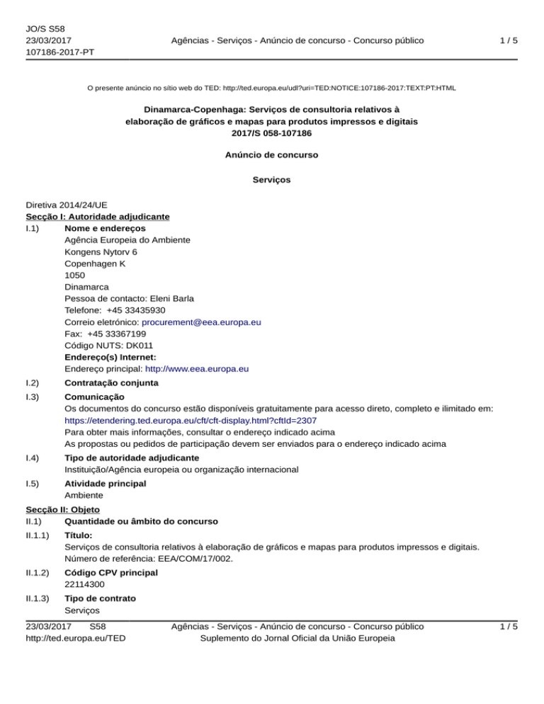 JO/S S58 23/03/2017 107186-2017-PT Agências - Serviços - Anúncio de concurso - Concurso público 1/5 O presente anúncio no sítio web do TED: http://ted.europa.eu/udl?uri=TED:NOTICE:107186-2017:TEXT:PT:HTML Dinamarca-Copenhaga: Serviços de consultoria relativos à elaboração de gráficos e mapas para produtos impressos e digitais 2017/S 058-107186 Anúncio de concurso Serviços Diretiva 2014/24/UE Secção I: Autoridade adjudicante I.1) Nome e endereços Agência Europeia do Ambiente Kongens Nytorv 6 Copenhagen K 1050 Dinamarca Pessoa de contacto: Eleni Barla Telefone: +45 33435930 Correio eletrónico: [email protected] Fax: +45 33367199 Código NUTS: DK011 Endereço(s) Internet: Endereço principal: http://www.eea.europa.eu I.2) Contratação conjunta I.3) Comunicação Os documentos do concurso estão disponíveis gratuitamente para acesso direto, completo e ilimitado em: https://etendering.ted.europa.eu/cft/cft-display.html?cftId=2307 Para obter mais informações, consultar o endereço indicado acima As propostas ou pedidos de participação devem ser enviados para o endereço indicado acima I.4) Tipo de autoridade adjudicante Instituição/Agência europeia ou organização internacional I.5) Atividade principal Ambiente Secção II: Objeto II.1) Quantidade ou âmbito do concurso II.1.1) Título: Serviços de consultoria relativos à elaboração de gráficos e mapas para produtos impressos e digitais. Número de referência: EEA/COM/17/002. II.1.2) Código CPV principal 22114300 II.1.3) Tipo de contrato Serviços 23/03/2017 S58 http://ted.europa.eu/TED Agências - Serviços - Anúncio de concurso - Concurso público Suplemento do Jornal Oficial da União Europeia 1/5 JO/S S58 23/03/2017 107186-2017-PT Agências - Serviços - Anúncio de concurso - Concurso público 2/5 II.1.4) Descrição resumida: O objetivo do presente concurso consiste em estabelecer um contrato-quadro de serviços com 1 prestador de serviços ou um grupo de prestadores de serviços (consórcio) que prestarão à AEA serviços de consultoria relacionados com a elaboração de gráficos e mapas para produtos impressos e digitais. II.1.5) Valor total estimado Valor sem IVA: 800 000.00 EUR II.1.6) Informação sobre os lotes Contrato dividido em lotes: não II.2) Descrição II.2.1) Título: II.2.2) Código(s) CPV adicional(is) II.2.3) Local de execução Código NUTS: DK011 Local principal de execução: Os serviços serão realizados nas instalações do contratante (extramuros) ou na AEA em Copenhaga (intramuros) consoante os requisitos da nota de encomenda. II.2.4) Descrição do concurso: A AEA utiliza os mapas e gráficos de forma bem-sucedida para comunicar mensagens ambientais específicas com base na análise de dados. Os mapas e gráficos em questão podem ser dinâmicos, para utilização em produtos digitais e em linha ou estáticos para utilização em produtos impressos, ou pontualmente em produtos digitais e em linha. O contratante será responsável por trabalhar com dados ambientais sobre uma variedade de temas para elaborar gráficos e mapas estáticos ou interativos para utilização em produtos em linha e digitais de fácil compreensão e que transmitem uma mensagem clara para o utilizador. II.2.5) Critérios de adjudicação O preço não é o único critério de adjudicação e todos os critérios se encontram enunciados apenas na documentação do concurso II.2.6) Valor estimado Valor sem IVA: 800 000.00 EUR II.2.7) Duração do contrato, acordo-quadro ou sistema de aquisição dinâmico Duração em meses: 48 O contrato é passível de recondução: não II.2.10) Informação sobre as variantes São aceites variantes: não II.2.11) Informação sobre as opções Opções: não II.2.12) Informação relativa a catálogos eletrónicos II.2.13) Informação sobre os fundos da União Europeia O contrato está relacionado com um projeto e/ou programa financiado por fundos da União Europeia: não II.2.14) Informação adicional Secção III: Informação de carácter jurídico, económico, financeiro e técnico III.1) Condições de participação 23/03/2017 S58 http://ted.europa.eu/TED Agências - Serviços - Anúncio de concurso - Concurso público Suplemento do Jornal Oficial da União Europeia 2/5 JO/S S58 23/03/2017 107186-2017-PT Agências - Serviços - Anúncio de concurso - Concurso público 3/5 III.1.1) Habilitação para o exercício da atividade profissional, incluindo requisitos em matéria de inscrição em registos profissionais ou comerciais Lista e breve descrição das condições: Conforme especificado nos pontos 10.1 e 10.2.1 do caderno de encargos (anexo I). III.1.2) Capacidade económica e financeira Critérios de seleção conforme descritos na documentação do concurso III.1.3) Capacidade técnica e profissional Critérios de seleção conforme descritos na documentação do concurso III.1.5) Informação sobre contratos reservados III.2) Condições relacionadas com o contrato III.2.1) Informação sobre uma profissão específica III.2.2) Condições de execução do contrato: III.2.3) Informação sobre o pessoal responsável pela execução do contrato Secção IV: Procedimento IV.1) Descrição IV.1.1) Tipo de procedimento Concurso aberto IV.1.3) Informação acerca do acordo-quadro ou sistema de aquisição dinâmico O concurso implica a celebração de um acordo-quadro Acordo-quadro com um único operador IV.1.4) Informação sobre a redução do número de soluções ou propostas durante a negociação ou o diálogo IV.1.6) Informação acerca do leilão eletrónico IV.1.8) Informação relativa ao Acordo sobre Contratos Públicos (ACP) O contrato é abrangido pelo Acordo sobre Contratos Públicos: não IV.2) Informação administrativa IV.2.1) Publicação anterior referente ao presente concurso IV.2.2) Prazo para a receção das propostas ou pedidos de participação Data: 26/04/2017 Hora local: 16:00 IV.2.3) Data prevista de envio dos convites à apresent