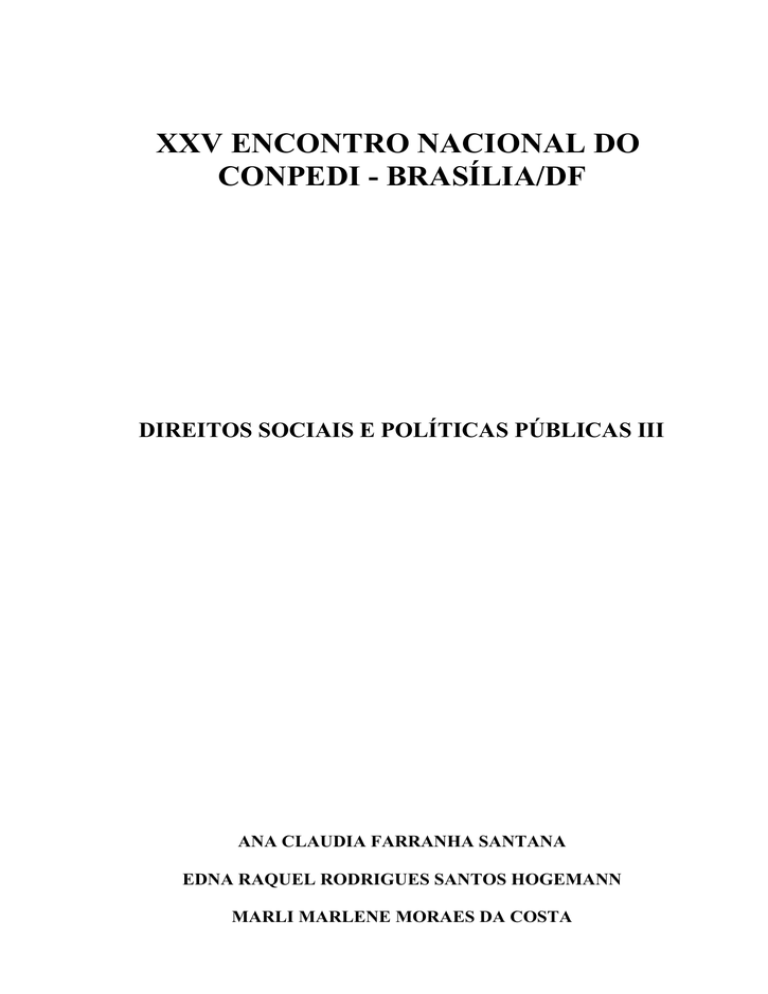 XXV ENCONTRO NACIONAL DO CONPEDI - BRASÍLIA/DF DIREITOS SOCIAIS E POLÍTICAS PÚBLICAS III ANA CLAUDIA FARRANHA SANTANA EDNA RAQUEL RODRIGUES SANTOS HOGEMANN MARLI MARLENE MORAES DA COSTA Copyright © 2016 Conselho Nacional de Pesquisa e Pós-Graduação em Direito Todos os direitos reservados e protegidos. Nenhuma parte destes anais poderá ser reproduzida ou transmitida sejam quais forem os meios empregados sem prévia autorização dos editores. Diretoria – CONPEDI Presidente - Prof. Dr. Raymundo Juliano Feitosa – UNICAP Vice-presidente Sul - Prof. Dr. Ingo Wolfgang Sarlet – PUC - RS Vice-presidente Sudeste - Prof. Dr. João Marcelo de Lima Assafim – UCAM Vice-presidente Nordeste - Profa. Dra. Maria dos Remédios Fontes Silva – UFRN Vice-presidente Norte/Centro - Profa. Dra. Julia Maurmann Ximenes – IDP Secretário Executivo - Prof. Dr. Orides Mezzaroba – UFSC Secretário Adjunto - Prof. Dr. Felipe Chiarello de Souza Pinto – Mackenzie Representante Discente – Doutoranda Vivian de Almeida Gregori Torres – USP Conselho Fiscal: Prof. Msc. Caio Augusto Souza Lara – ESDH Prof. Dr. José Querino Tavares Neto – UFG/PUC PR Profa. Dra. Samyra Haydêe Dal Farra Naspolini Sanches – UNINOVE Prof. Dr. Lucas Gonçalves da Silva – UFS (suplente) Prof. Dr. Fernando Antonio de Carvalho Dantas – UFG (suplente) Secretarias: Relações Institucionais – Ministro José Barroso Filho – IDP Prof. Dr. Liton Lanes Pilau Sobrinho – UPF Educação Jurídica – Prof. Dr. Horácio Wanderlei Rodrigues – IMED/ABEDi Eventos – Prof. Dr. Antônio Carlos Diniz Murta – FUMEC Prof. Dr. Jose Luiz Quadros de Magalhaes – UFMG Profa. Dra. Monica Herman Salem Caggiano – USP Prof. Dr. Valter Moura do Carmo – UNIMAR Profa. Dra. Viviane Coêlho de Séllos Knoerr – UNICURITIBA Comunicação – Prof. Dr. Matheus Felipe de Castro – UNOESC D598 Direitos sociais e políticas públicas III [Recurso eletrônico on-line] organização CONPEDI/UnB/UCB/IDP/UDF; Coordenadores: Ana Claudia Farranha Santana, Edna Raquel Rodrigues Santos Hogemann, Marli Marlene Moraes Da Costa – Florianópolis: CONPEDI, 2016. Inclui bibliografia ISBN: 978-85-5505-185-2 Modo de acesso: www.conpedi.org.br em publicações Tema: DIREITO E DESIGUALDADES: Diagnósticos e Perspectivas para um Brasil Justo. 1. Direito – Estudo e ensino (Pós-graduação) – Brasil – Encontros. 2. Direitos Sociais. 3. Políticas Públicas. I. Encontro Nacional do CONPEDI (25. : 2016 : Brasília, DF). CDU: 34 ________________________________________________________________________________________________ Florianópolis – Santa Catarina – SC www.conpedi.org.br XXV ENCONTRO NACIONAL DO CONPEDI - BRASÍLIA/DF DIREITOS SOCIAIS E POLÍTICAS PÚBLICAS III Apresentação O XXV Encontro Nacional do CONPEDI – BRASILIA-DF, realizado em parceria com a Universidade de Brasília, apresentou como temática central “ Direito e desigualdades: um diagnóstico e perspectivas para um Brasil justo”. Esse tema suscitou intensos debates desde a abertura do evento e desdobramentos ao decorrer da apresentação dos trabalhos e da realização das plenárias. Particularmente, a questão da desigualdade social mereceu destaque no Grupo de Trabalho “Direitos Sociais e Políticas Públicas III”, na medida em que inequivocamente são os direitos sociais aqueles que mais se acercam do princípio da dignidade da pessoa humana e da plenitude da cidadania, na medida em que propendem a redução das desigualdades entre as pessoas, que podem proporcionar os indivíduos as mais completas e dignas condições de vida. Sob a coordenação das Profa. Pós-Dra. Edna Raquel Hogemann(UNESA/UNIRIO), Profa. Dra. Ana Claudia Farranha Santana (UNB) e Profa. Dra. Marli Marlene Moraes da Costa (USCS), o GT “Direitos Sociais e Políticas Públicas III” promoveu sua contribuição, com exposições orais e debates que se caracterizaram tanto pela atualidade quanto pela profundidade das temáticas abordadas pelos expositores. Eis uma breve síntese dos trabalhos apresentados: Sob o título "Programa jovem aprendiz: inclusão ou inserção social através do trabalho", a autora Michelli Giacomossi investiga as atividades desempenhadas e a relação do exercício profissional com a formação oferecida pelo programa; a receptividade do empregador quanto a imposição legal da contratação; identificar se ocorre capacitação profissional, efetividade do programa e adequação à legislação. Amanda Tavares Borges e Priscila Mara Garcia apresentaram o trabalho "Políticas ativas e passivas de mercado de trabalho: desafios para o crescimento e o emprego em que analisam o funcionamento do Sistema Público de Emprego Brasileiro, de 2004 a 2014 e de 2014 para 2015". "Professor readaptado: perspectivas de proteção" é o titulo do trabalho apresentado por Mariana Carolina Lemes e Daniel Roxo de Paula Chiesse que propõe-se a responder de que forma um professor se torna readaptado, apresentando-se como hipótese a necessidade de políticas públicas para salvaguarda dos direitos do professorado. Claudia Socoowski de Anello e Silva discorreu sobre "Trabalho, gênero e políticas públicas: um estudo da experiência feminina no polo naval de Rio Grande" buscando analisar de que forma se deu a ocupação de postos de trabalho gerados no Polo Naval de Rio Grande-RS pelas mulheres. "O lugar ocupado pela educação brasileira na exclusão/inclusão das identidades trans" é o título da apresentação de Luciana Barbosa Musse e Roberto Freitas Filho. O artigo enfrenta o problema da promoção, via educação, do reconhecimento das identidades trans como sujeitos de direito que fogem às normas de gênero, através de políticas públicas que garantem seu pleno desenvolvimento. Ana Carolina Greco Paes discorreu sobre a "Educação democrática e políticas públicas de promoção ao direito à liberdade de crença no currículo escolar do ensino religioso no estado de M