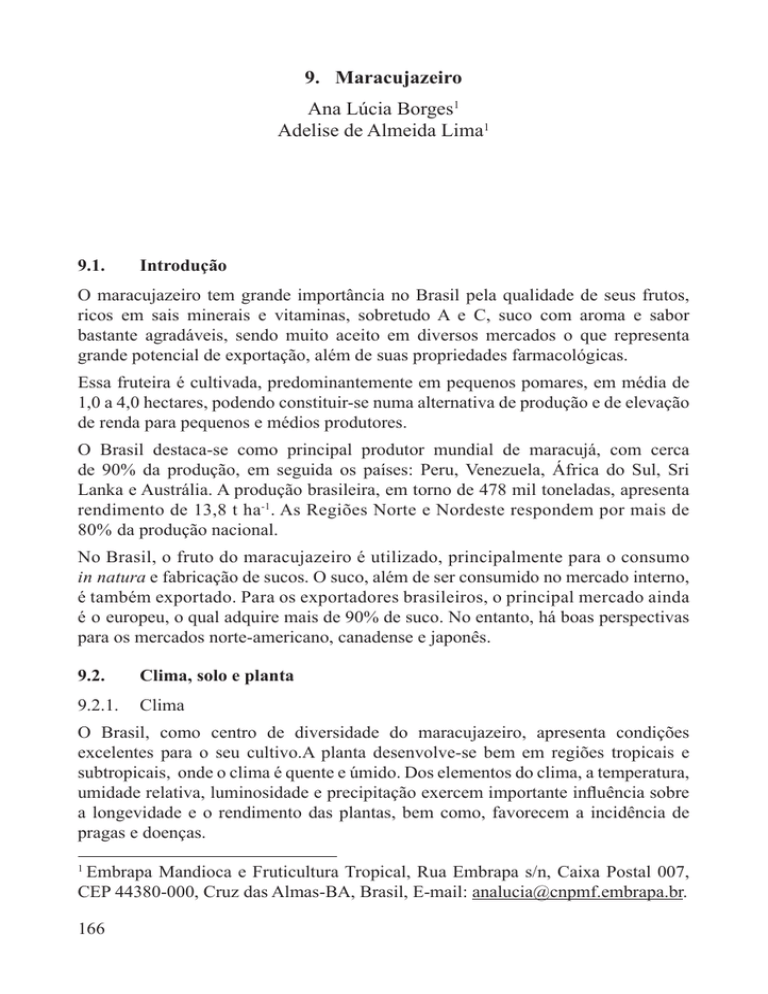 9. Maracujazeiro Ana Lúcia Borges1 Adelise de Almeida Lima1 9.1. Introdução O maracujazeiro tem grande importância no Brasil pela qualidade de seus frutos, ricos em sais minerais e vitaminas, sobretudo A e C, suco com aroma e sabor bastante agradáveis, sendo muito aceito em diversos mercados o que representa grande potencial de exportação, além de suas propriedades farmacológicas. Essa fruteira é cultivada, predominantemente em pequenos pomares, em média de 1,0 a 4,0 hectares, podendo constituir-se numa alternativa de produção e de elevação de renda para pequenos e médios produtores. O Brasil destaca-se como principal produtor mundial de maracujá, com cerca de 90% da produção, em seguida os países: Peru, Venezuela, África do Sul, Sri Lanka e Austrália. A produção brasileira, em torno de 478 mil toneladas, apresenta rendimento de 13,8 t ha-1. As Regiões Norte e Nordeste respondem por mais de 80% da produção nacional. No Brasil, o fruto do maracujazeiro é utilizado, principalmente para o consumo in natura e fabricação de sucos. O suco, além de ser consumido no mercado interno, é também exportado. Para os exportadores brasileiros, o principal mercado ainda é o europeu, o qual adquire mais de 90% de suco. No entanto, há boas perspectivas para os mercados norte-americano, canadense e japonês. 9.2. Clima, solo e planta 9.2.1. Clima O Brasil, como centro de diversidade do maracujazeiro, apresenta condições excelentes para o seu cultivo.A planta desenvolve-se bem em regiões tropicais e subtropicais, onde o clima é quente e úmido. Dos elementos do clima, a temperatura, umidade relativa, luminosidade e precipitação exercem importante influência sobre a longevidade e o rendimento das plantas, bem como, favorecem a incidência de pragas e doenças. Embrapa Mandioca e Fruticultura Tropical, Rua Embrapa s/n, Caixa Postal 007, CEP 44380-000, Cruz das Almas-BA, Brasil, E-mail: [email protected]. 1 166 Os processos biológicos tais como: florescimento, fecundação, frutificação, maturação e qualidade dos frutos, são dependentes da temperatura. A faixa de temperatura entre 21 e 25oC é considerada como a mais favorável ao crescimento da planta, sendo a melhor entre 23 e 25oC. Contudo, o maracujazeiro, está sendo cultivado, com sucesso, em temperaturas entre 18 e 35oC (São José, 1993). As baixas temperaturas retardam o crescimento da planta e reduzem a absorção de nutrientes e a produção. Além disso, o vingamento dos frutos é afetado pelas temperaturas muito elevadas ou por temperaturas muito baixas (Manica, 1981). Utsunomiya (1992) observou que, em temperaturas intermediárias de 23oC a 28oC, o crescimento do fruto do maracujazeiro é de 60,3 dias, porém, em temperaturas abaixo de 23ºC e acima de 33ºC, esse período é de 75 dias. Durante o verão, em que a temperatura é mais elevada, o período de germinação das sementes é menor, do que nos meses mais frios (São José et al., 1991). As regiões com altitudes entre 100 m a 1.000 m são as mais indicadas para o cultivo do maracujazeiro. Cultivos em locais de menor altitude têm o tempo de exploração menor do que naqueles de maior altitude. Na África do Sul, em regiões com altitudes entre 1.200 a 1.400 m, as plantações podem ser exploradas por oito anos, considerando os ciclos serem mais longos, implicando em maior longevidade (Teixeira, 1995). A umidade relativa tem influência muito grande no desenvolvimento vegetativo e no estado fitossanitário do maracujazeiro. A umidade relativa do ar em torno de 60% é a mais favorável ao cultivo do maracujazeiro. A temperatura elevada, associada a ventos constantes e baixa umidade relativa, causa dessecação dos tecidos pela transpiração excessiva e impede o desenvolvimento do maracujazeiro. Acima de 60%, quando associada às chuvas, favorece o aparecimento de doenças da parte aérea do maracujazeiro, como verrugose, antracnose e bacteriose (Lima e Borges, 2002). A suscetibilidade do maracujazeiro a ventos fortes constitui fator importante para essa cultura, por causa dos danos diretos que eles ocasionam às plantas, como também à necessidade de adaptações nos sistemas de condução. Ventos fortes são responsáveis pelo tombamento de plantas e ventos frios provocam queda de flores e frutos novos, bem como paralisam o crescimento da planta. A utilização de quebra-ventos é indispensável ao maracujazeiro em regiões sujeitas a ventos fortes. Segundo Ruggiero et al. (1996) podem ser utilizados como quebra-ventos: bambu, grevílea, pinus, hibiscus, eucalipto e espécies de capim. A luz é, também um fator importante no crescimento do maracujazeiro, em conseqüência dos seus efeitos sobre a fotossíntese. Normalmente, o aumento de horas de luz provoca uma atividade fotossintética maior, com acréscimo no vigor da planta, com consequente aumento no tamanho e na qualidade do fruto. 167 A luminosidade inadequada afeta a formação de flores e frutos. Regiões em que o comprimento do dia é acima de 11 horas de luz apresentam as melhores condições para o florescimento. Nos meses de inverno, quando os dias são mais curtos, as plantas florescem pouco por causa da menor duração do dia. As Regiões Semi-Áridas brasileiras, com fotoperíodo acima de 11 horas de luz dia-1, associado às altas temperaturas e elevada luminosidade durante todo o ano, permitem florescimento e produção contínuos em todos os meses do ano, desde que haja suprimento adequado de água. Gamarra Rojas e Medina (1995) observaram grande influência da intensidade de luz no fenômeno fenológico de abertura de flores do maracujazeiro amarelo. As flores normalmente abriam às 12h, imediatamente após a máxima incidência da radiação fotossinteticamente ativa (RFA), e fechavam às 15h; porém, quando havia menor luminosidade, antecipavam o fechamento às 14h30. O maracujazeiro mantém um ritmo de crescimento contínuo; necessitando, desse modo, de adequado suprim