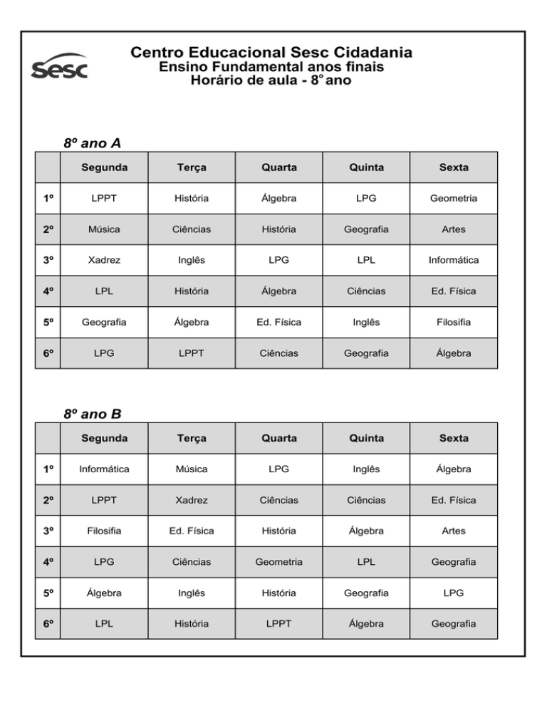 8º ano A Segunda Terça Quarta Quinta Sexta 1º LPPT História Álgebra LPG Geometria 2º Música Ciências História Geografia Artes 3º Xadrez Inglês LPG LPL Informática 4º LPL História Álgebra Ciências Ed. Física 5º Geografia Álgebra Ed. Física Inglês Filosifia 6º LPG LPPT Ciências Geografia Álgebra Segunda Terça Quarta Quinta Sexta 1º Informática Música LPG Inglês Álgebra 2º LPPT Xadrez Ciências Ciências Ed. Física 3º Filosifia Ed. Física História Álgebra Artes 4º LPG Ciências Geometria LPL Geografia 5º Álgebra Inglês História Geografia LPG 6º LPL História LPPT Álgebra Geografia 8º ano B 8º ano C Segunda Terça Quarta Quinta Sexta 1º Filosifia Inglês História Álgebra Ed. Física 2º Álgebra Música LPG LPG Geografia 3º LPG Álgebra Ciências Ciências LPPT 4º História LPPT Informática Inglês Artes 5º LPL Xadrez LPL Álgebra Geografia 6º Geografia Ciências História Ed. Física Geometria Segunda Terça Quarta Quinta Sexta 1º Música Xadrez LPL Geografia Artes 2º LPG LPG Álgebra LPL LPPT 3º Geografia História LPPT Geografia Ed. Física 4º Álgebra Inglês História Álgebra Informática 5º História Ciências Ciências Ciências Geometria 6º Álgebra Filosifia Ed. Física Inglês LPG 8º ano D 8º ano E Segunda Terça Quarta Quinta Sexta 1º LPL LPPT LPG Xadrez Geografia 2º Filosifia História Informática Álgebra Geometria 3º LPG Ciências LPL Inglês Geografia 4º Música Álgebra Ciências Geografia LPPT 5º LPG História Artes Ed. Física Álgebra 6º História Inglês Álgebra Ciências Ed. Física