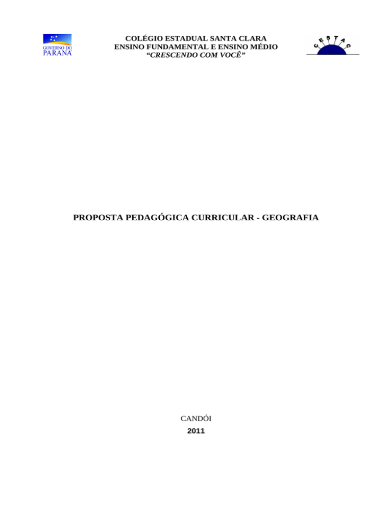 COLÉGIO ESTADUAL SANTA CLARA ENSINO FUNDAMENTAL E ENSINO MÉDIO “CRESCENDO COM VOCÊ” PROPOSTA PEDAGÓGICA CURRICULAR - GEOGRAFIA CANDÓI 2011 COLÉGIO ESTADUAL SANTA CLARA ENSINO FUNDAMENTAL E ENSINO MÉDIO “CRESCENDO COM VOCÊ” GEOGRAFIA APRESENTAÇÃO DA DISCIPLINA A geografia tem assumido um papel importante em uma época em que as informações são transmitidas pela mídia com muita rapidez e em grande volume. É impossível acompanhar e entender as mudanças e os fatos ou fenômenos que ocorrem no mundo, sem conhecimentos geográficos. O impacto ambiental provocado pelo processo de industrialização, as relações de poder entre as nações e as territorialidades expressas pelos movimentos sociais, são algumas das questões desafiadoras da atualidade. Para se posicionar diante dessas questões, é preciso que se exercite a capacidade de questionamento e argumentação e se disponha a reavaliar constantemente os próprios sonhos e valores. Acredita-se que essa atitude critica e dinâmica tornará mais interessante a relação com o conhecimento geográfico. É no espaço geográfico – conceito fundamental da ciência geográfica que se realizam as manifestações da natureza e as atividades humanas. Por isso compreender a organização e as transformações sofridas por esse espaço é essencial para a formação do cidadão consciente e critico dos problemas do mundo em que vive. Por consequência entende-se o aluno como agente atuante e modificador do espaço geográfico, dentro de uma proposta educacional que requer responsabilidade de todos. (Rigolin, 2006) O objetivo geral da Geografia é o de conhecer o espaço geográfico como uma construção histórica e seu uso nos diferentes tempos e espaços, assim compreendendo a natureza e a sociedade como conceitos fundamentais para a construção do espaço geográfico, mantendo a relação homemnatureza. Entender as construções humanas como documento importante que as sociedades, em diferentes momentos, imprimem sobre a base natural. Tomar consciência do uso racional dos recursos naturais em compatibilidade, com as necessidades aproveitando também as fontes alternativas de energia. Ampliar o conceito da Geografia para além da economia. COLÉGIO ESTADUAL SANTA CLARA ENSINO FUNDAMENTAL E ENSINO MÉDIO “CRESCENDO COM VOCÊ” Conteúdos Estruturantes e básicos 5ª série/6º ano CONTEÚDOS ESTRUTURANTES CONTEÚDOS BÁSICOS Dimensão sócio ambiental Formação e transformação das paisagens naturais e culturais. Dinâmica da natureza e sua alteração pelo emprego de tecnologias de exploração. Dimensão política do espaço geográfico A formação, localização e exploração dos recursos naturais. A distribuição espacial das atividades produtivas, a transformação da paisagem e a reorganização do espaço geográfico. Dimensão cultural e demográfica As relações entre o campo e cidade. A mobilidade populacional e as manifestações sócioespaciais da diversidade étnico cultural. A evolução demográfica a distribuição população e os indicadores estatísticos. Dimensão econômica da produção do/no espaço geográfico. espacial da Dinâmica da natureza e suas alterações pelo emprego da tecnologia de exploração. A formação e localização dos recursos naturais. As diversas regionalizações do espaço geográfico. Meio ambiente (Lei 9.795/1999) 6ª SÉRIE/ 7º ANO CONTEÚDOS ESTRUTURANTES CONTEÚDOS BÁSICOS Formação do território brasileiro. Dimensão sócio ambiental A formação, mobilidade das fronteiras e a reconfiguração do território brasileiro. A dinâmica da natureza e sua alteração pelo emprego de tecnologias de exploração e produção. Dimensão política do espaço geográfico As diversas regionalizações do espaço brasileiro. A mobilidade populacional e as manifestações sócio espaciais da diversidade étnico cultural. A evolução demográfica da população, sua distribuição espacial e indicadores estatísticos. COLÉGIO ESTADUAL SANTA CLARA ENSINO FUNDAMENTAL E ENSINO MÉDIO “CRESCENDO COM VOCÊ” Dimensão cultural e demográfica Movimentos migratórios. As diversas regionalizações do espaço brasileiro. A formação, mobilidade das fronteiras e a configuração do território brasileiro. Os movimentos sociais, no urbano e no rural e a apropriação do espaço. Dimensão econômica da produção do/no espaço geográfico. A formação e crescimento das cidades, sua dinâmica nos espaços urbanos e a urbanização. A distribuição espacial das atividades produtivas, e a (re)organização do espaço geográfico. A circulação de mão de obra, das mercadorias e das informações. História e Cultura Afro-brasileira e Africana (Lei: 10.369/2005) –. E Cultura Indigena. ( Lei: 11.645/2008) História do Paraná (Lei 13.381/2001). 7ª SÉRIE/ 8º ANO CONTEÚDOS ESTRUTURANTES CONTEÚDOS BÁSICOS As diversas regionalizações do espaço geográfico. A formação, mobilidade das fronteiras e a reconfiguração dos territórios do continente americano. Dimensão sócio ambiental A nova ordem mundial, os territórios supranacionais e o papel do Estado. Dimensão política do espaço geográfico A evolução demográfica da população, sua distribuição espacial, e os indicadores estatísticos. A mobilidade populacional e suas manifestações. A formação, localização e exploração dos recursos naturais. Dimensão cultural e demográfica As relações entre o rural e o urbano na sociedade capitalista. As relações no espaço rural e a modernização da agricultura. Dimensão econômica da produção do/no espaço geográfico. Evolução demográfica da população, sua distribuição espacial e os indicadores estatísticos. Os movimentos migratórios e suas motivações. A mobilidade populacional e as manifestações sócio COLÉGIO ESTADUAL SANTA CLARA ENSINO FUNDAMENTAL E ENSINO MÉDIO “CRESCENDO COM VOCÊ” espaciais da diversidade étnico cultural.