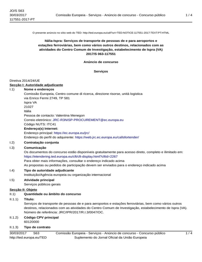JO/S S63 30/03/2017 117551-2017-PT Comissão Europeia - Serviços - Anúncio de concurso - Concurso público 1/4 O presente anúncio no sítio web do TED: http://ted.europa.eu/udl?uri=TED:NOTICE:117551-2017:TEXT:PT:HTML Itália-Ispra: Serviços de transporte de pessoas de e para aeroportos e estações ferroviárias, bem como vários outros destinos, relacionados com as atividades do Centro Comum de Investigação, estabelecimento de Ispra (VA) 2017/S 063-117551 Anúncio de concurso Serviços Diretiva 2014/24/UE Secção I: Autoridade adjudicante I.1) Nome e endereços Comissão Europeia, Centro comune di ricerca, direzione risorse, unità logistica via Enrico Fermi 2749, TP 581 Ispra VA 21027 Itália Pessoa de contacto: Valentina Menegon Correio eletrónico: [email protected] Código NUTS: ITC41 Endereço(s) Internet: Endereço principal: https://ec.europa.eu/jrc/ Endereço do perfil do adquirente: https://web.jrc.ec.europa.eu/callsfortender/ I.2) Contratação conjunta I.3) Comunicação Os documentos do concurso estão disponíveis gratuitamente para acesso direto, completo e ilimitado em: https://etendering.ted.europa.eu/cft/cft-display.html?cftId=2267 Para obter mais informações, consultar o endereço indicado acima As propostas ou pedidos de participação devem ser enviados para o endereço indicado acima I.4) Tipo de autoridade adjudicante Instituição/Agência europeia ou organização internacional I.5) Atividade principal Serviços públicos gerais Secção II: Objeto II.1) Quantidade ou âmbito do concurso II.1.1) Título: Serviços de transporte de pessoas de e para aeroportos e estações ferroviárias, bem como vários outros destinos, relacionados com as atividades do Centro Comum de Investigação, estabelecimento de Ispra (VA). Número de referência: JRC/IPR/2017/R.I.3/0047/OC. II.1.2) Código CPV principal 60120000 II.1.3) Tipo de contrato 30/03/2017 S63 http://ted.europa.eu/TED Comissão Europeia - Serviços - Anúncio de concurso - Concurso público Suplemento do Jornal Oficial da União Europeia 1/4 JO/S S63 30/03/2017 117551-2017-PT Comissão Europeia - Serviços - Anúncio de concurso - Concurso público 2/4 Serviços II.1.4) Descrição resumida: Transporte de pessoas, com ou sem bagagem, e/ou documentação confidencial pertencente à Comissão Europeia (com pesos e dimensões limitados) de e para aeroportos e estações ferroviárias, bem como vários outros destinos, relacionados com as atividades do Centro Comum de Investigação, estabelecimento de Ispra. Os veículos a fornecer e os serviços encontram-se descritos de forma mais pormenorizada na documentação do concurso que pode ser descarregada a partir do sítio de «e-tendering» indicado no ponto I.3 do presente anúncio. II.1.5) Valor total estimado Valor sem IVA: 4 200 000.00 EUR II.1.6) Informação sobre os lotes Contrato dividido em lotes: não II.2) Descrição II.2.1) Título: II.2.2) Código(s) CPV adicional(is) 60120000 II.2.3) Local de execução Código NUTS: ITC41 II.2.4) Descrição do concurso: Serviços de transporte de pessoas de e para aeroportos e estações ferroviárias, bem como vários outros destinos, relacionados com as atividades do Centro Comum de Investigação, estabelecimento de Ispra. II.2.5) Critérios de adjudicação Critérios a seguir enunciados Preço II.2.6) Valor estimado Valor sem IVA: 4 200 000.00 EUR II.2.7) Duração do contrato, acordo-quadro ou sistema de aquisição dinâmico Duração em meses: 48 O contrato é passível de recondução: sim Descrição das renovações: Consultar o projeto de contrato publicado no endereço Web indicado no ponto I.3 do presente anúncio de concurso. II.2.10) Informação sobre as variantes São aceites variantes: não II.2.11) Informação sobre as opções Opções: não II.2.12) Informação relativa a catálogos eletrónicos II.2.13) Informação sobre os fundos da União Europeia O contrato está relacionado com um projeto e/ou programa financiado por fundos da União Europeia: sim Identificação do projeto: dotações administrativas da UE. II.2.14) Informação adicional Consultar o endereço Web indicado no ponto I.3 do presente anúncio de concurso. 30/03/2017 S63 http://ted.europa.eu/TED Comissão Europeia - Serviços - Anúncio de concurso - Concurso público Suplemento do Jornal Oficial da União Europeia 2/4 JO/S S63 30/03/2017 117551-2017-PT Comissão Europeia - Serviços - Anúncio de concurso - Concurso público 3/4 Secção III: Informação de carácter jurídico, económico, financeiro e técnico III.1) Condições de participação III.1.1) Habilitação para o exercício da atividade profissional, incluindo requisitos em matéria de inscrição em registos profissionais ou comerciais Lista e breve descrição das condições: Consultar o endereço Web indicado no ponto I.3 do presente anúncio de concurso. III.1.2) Capacidade económica e financeira Critérios de seleção conforme descritos na documentação do concurso III.1.3) Capacidade técnica e profissional Critérios de seleção conforme descritos na documentação do concurso III.1.5) Informação sobre contratos reservados III.2) Condições relacionadas com o contrato III.2.1) Informação sobre uma profissão específica III.2.2) Condições de execução do contrato: Consultar o endereço Web indicado no ponto I.3 do presente anúncio de concurso. III.2.3) Informação sobre o pessoal responsável pela execução do contrato Secção IV: Procedimento IV.1) Descrição IV.1.1) Tipo de procedimento Concurso aberto IV.1.3) Informação acerca do acordo-quadro ou sistema de aquisição dinâmico O concurso implica a celebração de um acordo-quadro Acordo-quadro com um único operador IV.1.4) Informação sobre a redução do número de soluções ou propostas durante a negociação ou o diálogo IV.1.6) Informação acerca do leilão eletrónico IV.1.8) Informação relativa ao Acordo sobre Contratos Públicos (ACP) O contrato é abrang