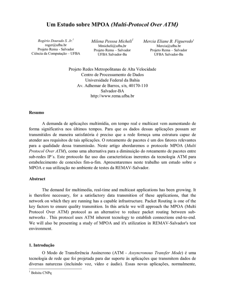 Um Estudo sobre MPOA (Multi-Protocol Over ATM) Rogério Dourado S. Jr.1 [email protected] Projeto Rema - Salvador Ciência da Computação – UFBA Milena Pessoa Micheli1 Mercia Eliane B. Figueredo1 Mmicheli@ufba,br Projeto Rema – Salvador UFBA Salvador-Ba [email protected] Projeto Rema – Salvador UFBA Salvador-Ba Projeto Redes Metropolitanas de Alta Velocidade Centro de Processamento de Dados Universidade Federal da Bahia Av. Adhemar de Barros, s/n, 40170-110 Salvador-BA http://www.rema.ufba.br Resumo A demanda de aplicações multimídia, em tempo real e multicast vem aumentando de forma significativa nos últimos tempos. Para que os dados dessas aplicações possam ser transmitidos de maneira satisfatória é preciso que a rede forneça uma estrutura capaz de atender aos requisitos de tais aplicações. O roteamento de pacotes é um dos fatores relevantes para a qualidade dessa transmissão. Neste artigo abordaremos o protocolo MPOA (Multi Protocol Over ATM), como uma alternativa para a diminuição do roteamento de pacotes entre sub-redes IP´s. Este protocolo faz uso das características inerentes da tecnologia ATM para estabelecimento de conexões fim-a-fim. Apresentaremos neste trabalho um estudo sobre o MPOA e sua utilização no ambiente de testes da REMAV-Salvador. Abstract The demand for multimedia, real-time and multicast applications has been growing. It is therefore necessary, for a satisfactory data transmition of these applications, that the network on which they are running has a capable infrastructure. Packet Routing is one of the key factors to ensure quality transmition. In this article we will approach the MPOA (Multi Protocol Over ATM) protocol as an alternative to reduce packet routing between subnetworks . This protocol uses ATM inherent tecnology to establish connections end-to-end. We will also be presenting a study of MPOA and it's utilization in REMAV-Salvador's test environment. 1. Introdução O Modo de Transferência Assíncrono (ATM - Assyncronous Transfer Mode) é uma tecnologia de rede que foi projetada para dar suporte às aplicações que transmitem dados de diversas naturezas (incluindo voz, vídeo e áudio). Essas novas aplicações, normalmente, 1 Bolsita CNPq necessitam de rapidez e segurança na transmissão das suas informações. Dessa forma, redes ATM se propõem a transmitir dados em altas velocidades (através da comutação rápida de pequenos pacotes), por conexões com garantias de qualidade de serviço (QoS-Quality-ofService). A grande maioria das aplicações atuais recebem e/ou enviam dados através de redes IP (Internet Protocol). O custo da alteração dessas aplicações para a transmissão numa nova tecnologia de rede (como o ATM) é alto, e aplicações nativas ATM ainda não são comuns. Gerou-se, então, a necessidade da adaptação das aplicações à nova rede usando soluções que envolvem IP sobre ATM. Duas soluções para “IP sobre ATM” foram definidas: Classical IP (também conhecida como IPOA)[1] e LANE (Lan Emulation)[2]. Com essas soluções, é possível manter o protocolo IP nos dispositivos fins das redes ATM. O LANE (LAN Emulation), regulamentado pelo ATM Forum, fornece recursos que emulam os serviços de LAN’s Ethernet e Token Ring sobre redes ATM. Nesse caso, protocolos da camada de rede podem operar sobre uma rede ATM essencialmente da mesma forma que eles operam sobre Ethernet e Token Ring. Roteador A ELAN 1 B ELAN 2 C Conexão entre LEC A e LEC B (clientes em ELANs diferentes). Conexão entre LEC B e LEC C (clientes numa mesma ELAN). Figura 1: Conexão entre clientes de 2 ELANs distintas. LANE permite que uma única rede ATM suporte múltiplas LANs emuladas (ELAN´s - Emulated LAN´s). Enquanto LANE provê maneiras eficientes de interligar a camada de enlace (Bridge) dentro de uma mesma sub-rede através de uma rede ATM, o tráfego entre sub-redes ainda precisa ser distribuído por roteadores, como mostra a figura 1. A ELAN 1 B ELAN 2 C Conexão entre LEC A e LEC B (clientes em ELANs diferentes). Conexão entre LEC B e LEC C (clientes numa mesma ELAN). Figura 2: Conexão entre clientes de 2 ELANs distintas Usando MPOA. A vantagem do protocolo MPOA é a transferência eficiente entre sub-redes IP num ambiente de LANE, ou seja, ele permite que comunicação entre as camadas de rede seja feita sobre VCC´s (Virtual Channel Circuit) ATM, sem a necessidade de roteadores no caminho dos dados (conforme figura 2), mesmo num cenário de diversos protocolos. MPOA é capaz de usar tanto informações de roteamento como bridging, para localizar a melhor saída da rede ATM. MPOA permite a separação física entre fowarding e o cálculo de roteamento da camada de rede, esta técnica é chamada de roteamento virtual. Esta separação fornece muitos benefícios: 1. Permite uma comunicação eficiente entre sub-redes. 2. Facilita o gerenciamento, na medida que o número de dispositivos da rede que precisam ser configurados para se estabelecer o roteamento da camada de rede diminui. 3. Aumenta a escalabilidade reduzindo o número de máquinas que participam do roteamento. 4. Reduz a complexidade dos dispositivos da rede, eliminando a necessidade do cálculo de roteamento. O uso do MPOA define os conceitos de Cliente MPOA (MPC) e Servidor MPOA (MPS), além dos protocolos necessários para eles se comunicarem. O MPC faz requisições de VCC’s (também chamado de atalho nesse artigo) ATM e recebe respostas do MPS. Os servidores MPOA fazem uso dos roteadores que rodam protocolos usuais de roteamento , tais como o OSPF (Open Shortest Path First), fornecendo uma integração com as redes existentes. Se o roteador não conhece o endereço ATM apropriado, ele propaga a solicitação a outros roteadores. Os endereços retornados pelo servidor de rotas serão sempre os endereços de um dispositivo da rede ATM. O MPOA requer UNI 3.0[7], UNI 3.1[8] ou UNI 4.0[9], LANE 2.0[2] e NHRP(Next Hop Resolution Protocol)[3]. 2 - Caracter