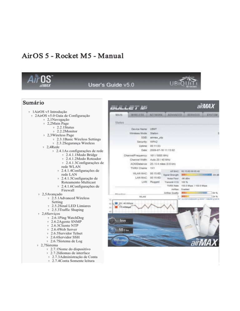 Air OS 5 - Rocket M5 - Manual Sumár io ? ? 1AirOS v5 Introdução 2AirOS v5.0 Guia de Configuração ? 2,1Navegação ? 2,2Main Page ? 2.2.1Status ? 2.2.2Monitor ? 2,3Wireless Page ? 2.3.1Basic Wireless Settings ? 2.3.2Segurança Wireless ? 2,4Rede ? 2.4.1As configurações de rede ? 2.4.1.1Modo Bridge ? 2.4.1.2Modo Roteador ? 2.4.1.3Configurações de rede WLAN ? 2.4.1.4Configurações de rede LAN ? 2.4.1.5Configuração de Roteamento Multicast ? 2.4.1.6Configurações de Firewall ? 2,5Avançado ? 2.5.1Advanced Wireless Setting ? 2.5.2Sinal LED Limiares ? 2.5.3Traffic Shaping ? 2,6Serviços ? 2.6.1Ping WatchDog ? 2.6.2Agente SNMP ? 2.6.3Cliente NTP ? 2.6.4Web Server ? 2.6.5Servidor Telnet ? 2.6.6Servidor SSH ? 2.6.7Sistema de Log ? 2,7Sistema ? 2.7.1Nome do dispositivo ? 2.7.2Idiomas de interface ? 2.7.3Administração de Conta ? 2.7.4Conta Somente leitura 2.7.5Gerenciamento de Configurações ? 2.7.6Dispositivo de manutenção ? 2.7.6.1upload de firmware 2,8Tools ? 2.8.1Alinhar Antena ? 2.8.2Site Survey ? 2.8.3Ping ? 2.8.4Traceroute ? 2.8.5DHCP Client ? ? Air OS v5 - Introdução AirOS v5.0 é a mais recente evolução na interface Ubiquiti AirOS. Trata-se de sistemas operacionais avançados com poderosos recursos sem fio e funções de roteamento, construída sobre uma interface simples e intuitiva. AirOS v5.0 maximiza o desempenho sem fio de produtos Ubiquiti Série M, que são baseados em IEEE 802.11n. Air OS v5.0 - Guia de Configur ação Este guia apresenta a descrição detalhada da versão do sistema operacional AirOS 5,0, que é integrada a todos os produtos fornecidos pela Série M Ubiquiti Networks, Inc. AirOS v5.0 suporta as novas versões de produtos da série M. NOTA Embora sirva a todos os produtos da série M, as informações abaixo foram adaptadas especificamente ao Rocket M5: - Este produto somente poderá ser instalado por um profissional especializado - Opera na faixa de freqüência de 5470 MHz a 5725 MHz - Não possui mecanismos TPC - Na faixa de freqüência de 5470 a 5725Mhz, a potência do equipamento deverá estar configurada para o limite máximo de 6,78 dBm e o ganho máximo da antena deverá ser de 20,22 dBi Todos os dispositivos AirOS-based suportam os seguintes modos de operação infra-estrutura: ? ? ? ? Estação (Wireless Client); Station WDS (Wireless Client Repetidor); Ponto de Acesso; Ponto de Acesso WDS (Repeater). Todos os dispositivos baseados AirOS suportam os modos de rede: ? ? Layer2 bridge transparente; Roteador. M5 Series (5 GHz) O Guia de instalação rápida descreve os passos de configuração para a estação de assinante (cliente sem fio -bridge) caso de uso (AirOS v3.4 based). Todas as definições de configuração acessíveis através da interface de gerenciamento web são descritos neste documento (elementos de dispositivos específicos são descritos individualmente). Nota: os exemplos e imagens contidas neste documento representam a interface gráfica de usuário do Bullet M5, que é compatível com todos os dispositivos baseados AirOS v5.0. M2 series (2.4GHz) Navegação Cada uma das telas de gerenciamento (listadas abaixo) contém parâmetros que afetam um aspecto específico do dispositivo: Configuration Management Menu [Main] exibe o status atual do dispositivo e as estatísticas. [Wireless] contém os controles para uma configuração de rede sem fio, embora abranja as definições básicas do rádio, que definem o modo de operação, potência de saída, associando as informações e opções de segurança de dados. [Networ k] cobre a configuração do modo de funcionamento da rede, as configuraçõesIP, rotinas de filtragem de pacotes e serviços de rede (ou seja, o servidor DHCP [Advanced] para controle mais preciso da interface sem fio. Parâmetros de recursos específicos AirMax 802.11n podem ser definidos nesta tela. Inclui também a tela avançado sinal externo de LED e configurações de traffic shaping. Administração e ferramentas de monitoramento [Ser vices] cobre a configuração dos serviços do sistema de gerenciamento como SNMP,NTP, registo do sistema, Watchdog Ping e SSH / servidor Telnet. [System] contém controles de rotinas de manutenção do sistema, ao gerenciamento de conta de administrador, personalização do dispositivo, upgrade de firmware e backup.O idioma da interface de gerenciamento pode ser alterado nesta tela também. Há ferramentas de controle [Tools] disponíveis em cada tela também: Ferramenta de alinhamento de antena; ? Ferramenta de site survey (também disponível no modo AP); Ping; Traceroute; Utilitário de teste de velocidade (ainda não disponível); ? ? ? ? Tela Pr incipal A tela pr incipal exibe um resumo as informações sobre status do link, valores atuais de configuração básica (dependendo do modo de funcionamento), configurações de rede e de informação e estatísticas de tráfego de todas as interfaces. Status AirOS v5.0 Main Page Device Name: exibe o nome personalizável (ID) do dispositivo baseado em AirOS v5.0. Nome do dispositivo (Host Name) será representado nas telas de registro do sistema operacional do roteador e em ferramentas de descoberta. Status atual do AirOS v5 powered Access Point Wireless Mode: exibe o modo de funcionamento da interface de rádio. dispositivos AirOS5-based suportam soluções de infra-estrutura de rede sem fio.Modos de operaçãoAP (ou Access Point WDS) e Estação (ou Station WDS) e podem ser ajustados em função das necessidades da topologia da rede. SSID: é o nome do serviço 802,11 (estabelecido pelo AP ao qual as estações estão Nome do dispositivo e Wireless Mode conectadas): Enquanto operando em modo Station, exibe o SSID do ponto de acesso onde o dispositivo AirOS v5.0 está associado. Enquanto operando em modo Access Point, exibe o SSID do dispositivo AirOS v5.0. Secur ity: Cenário de segurança atual. "None” é exibida se a segurança sem fio está desativada. WPA ou WPA2 são exibidos se o método de segurança sem f