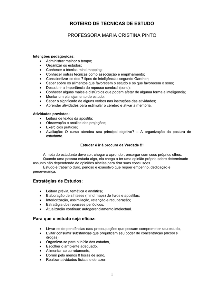 ROTEIRO DE TÉCNICAS DE ESTUDO PROFESSORA MARIA CRISTINA PINTO Intenções pedagógicas: Administrar melhor o tempo; Organizar os estudos; Conhecer a técnica mind mapping; Conhecer outras técnicas como associação e empilhamento; Conscientizar-se dos 7 tipos de inteligências segundo Gardner; Saber sobre os alimentos que favorecem o estudo e os que favorecem o sono; Descobrir a importância do repouso cerebral (sono); Conhecer alguns males e distúrbios que podem afetar de alguma forma a inteligência; Montar um planejamento de estudo; Saber o significado de alguns verbos nas instruções das atividades; Aprender atividades para estimular o cérebro e ativar a memória. Atividades previstas: Leitura de textos da apostila; Observação e análise das projeções; Exercícios práticos; Avaliação: O curso atendeu seu principal objetivo? – A organização da postura de estudante. Estudar é ir à procura da Verdade !!! A meta do estudante deve ser: chegar a aprender, enxergar com seus próprios olhos. Quando uma pessoa estuda algo, ela chega a ter uma opinião própria sobre determinado assunto não dependendo de opiniões alheias para tirar suas conclusões. Estudo é trabalho duro, penoso e exaustivo que requer empenho, dedicação e perseverança. Estratégias de Estudos: Leitura prévia, temática e analítica; Elaboração de sínteses (mind maps) de livros e apostilas; Interiorização, assimilação, retenção e recuperação; Estratégia dos repasses periódicos; Atualização contínua: autogerenciamento intelectual. Para que o estudo seja eficaz: Livrar-se de pendências e/ou preocupações que possam comprometer seu estudo, Evitar consumir substâncias que prejudicam seu poder de concentração (álcool e drogas), Organizar-se para o início dos estudos, Escolher o ambiente adequado, Alimentar-se corretamente, Dormir pelo menos 8 horas de sono, Realizar atividades físicas e de lazer. 1 Administre seu tempo e mude de vida por Camila Micheletti (texto adaptado para fim pedagógico) Antes de começarmos a falar sobre administração do tempo, é preciso entender o que vamos tentar administrar. "Afinal, o que é o tempo? Como funciona? Por que às vezes passa voando e às vezes demora a passar?", questiona o conferencista e especialista em comportamento humano Carlos Hilsdorf, no seu livro Atitudes Vencedoras (Ed. Senac). Ele mesmo responde à questão, afirmando que o tempo pode ser dividido em duas categorias: o tempo medido e o tempo vivido. Na realidade, o que nos importa é o tempo vivido. Por isso, quando acaba o mês e você sente que não conseguiu realizar nada que havia planejado, é porque alguma coisa está errada. Isso porque o tempo é a coisa mais democrática que existe: todos nós temos, todos os dias, as mesmas 24 horas disponíveis. "O problema não é o tempo, mas como você vivencia o tempo", alerta Hilsdorf. Para saber administrar o tempo, é fundamental conhecer-se a si mesmo. "Você precisa saber qual é o seu horário mais produtivo - manhã, tarde ou noite - e direcionar as atividades mais importantes para este horário", destaca Elza Tsuzaki, consultora do Senac neste tema e bacharel em Administração de RH e Serviço Social. Ela orienta que também é importante cuidar da alimentação, já que comer alimentos nutritivos e que tragam energia faz toda a diferença na qualidade de vida. E estar bem fisicamente é fundamental na rotina diária. Pessoas estressadas e cansadas têm maior dificuldade de administrar o tempo. Com essas informações em mente, faça uma lista das suas prioridades. De acordo com o consultor Sebastião de Almeida Junior, uma vez que não é possível ampliar a disponibilidade de tempo de alguém, há duas alternativas para gerenciá-lo. A primeira é dar prioridade para atividades mais importantes, somente realizando as outras se for possível. A segunda alternativa é encontrar meios de reduzir o tempo necessário para realizar determinadas tarefas sem prejudicar a qualidade. De qualquer forma, há necessidade da pessoa rever e alterar seus próprios hábitos de maneira criteriosa para efetivamente gerenciar seu tempo. Um dos grandes problemas que as pessoas percebem na administração do tempo é não saber a diferença entre urgência, importância e prioridade. "Urgência está ligado ao tempo, ao prazo de execução e de início da tarefa. Uma tarefa pode ser mais urgente ou menos urgente, dependendo dos prazos que ela tem. Importância é o quanto aquela tarefa irá agregar para se atingir os nossos objetivos, dependendo da tarefa. A prioridade da tarefa surge a partir da combinação de seu grau de urgência e importância. Aí temos um dos maiores paradigmas a serem quebrados: uma tarefa prioritária não é aquela que se deva fazer logo (isto está diretamente ligado à urgência), nem tampouco uma coisa importante (isto está diretamente ligado à importância)", destaca o consultor e professor Alberto Alvarães. Você precisa de um dia de 48 horas? Cuidado! É hora de rever seus hábitos e seus relacionamentos. Faça o melhor possível para superar esta fase atual da sua vida e eleja novos critérios para tomar decisões de tal forma que as suas atividades escolares caibam na sua agenda. Caso contrário, você não só prejudicará seus laços de família, mas como os de amizade (aspectos essenciais para o equilíbrio do indivíduo). Hora certa para bater papo e receber visitas "Não falta tempo, o que falta é a organização". A afirmação é da geógrafa Rita Helena Purin, de 32 anos. A profissional fez um curso sobre o assunto no Senac/SP e aprendeu a ser mais criteriosa na escolha das atividades e conversas fora de hora. "Sinto que tenho mais tempo disponível. Passei a ser consciente e usar meu tempo nas coisas que realmente importam, estabelecendo prioridades.” O que fazer com aquele colega que chega bem no momento que você está repleto de coisas por fazer ou mesmo aquela tia do interior que liga no m