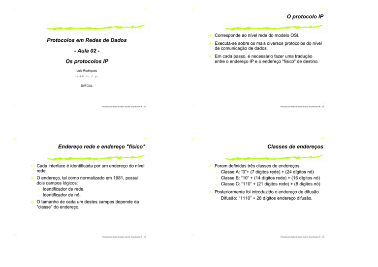 O protocolo IP Corresponde ao nível rede do modelo OSI. Protocolos em Redes de Dados - Aula 02 Os protocolos IP Executa-se sobre os mais diversos protocolos do nível de comunicação de dados. Em cada passo, é necessário fazer uma tradução entre o endereço IP e o endereço "físico" de destino. Luı́s Rodrigues [email protected] DI/FCUL Protocolos em Redes de Dados- Aula 02 -Os protocolos IP – p.1 Endereço rede e endereço "físico" Cada interface é identificada por um endereço do nível rede. O endereço, tal como normalizado em 1981, possui dois campos lógicos: Identificador de rede. Identificador de nó. O tamanho de cada um destes campos depende da "classe" do endereço. Protocolos em Redes de Dados- Aula 02 -Os protocolos IP – p.3 Protocolos em Redes de Dados- Aula 02 -Os protocolos IP – p.2 Classes de endereços Foram definidas três classes de endereços Classe A: “0”+ (7 dígitos rede) + (24 dígitos nó) Classe B: “10” + (14 dígitos rede) + (16 dígitos nó) Classe C: “110” + (21 dígitos rede) + (8 dígitos nó) Posteriormente foi introduzido o endereço de difusão. Difusão: “1110” + 28 dígitos endereço difusão. Protocolos em Redes de Dados- Aula 02 -Os protocolos IP – p.4 Formato do endereço IP Endereços reservados 0.X.Y.Z Nó X.Y.Z nesta rede C.C.C.255 Endereço para difusão na rede 32 Bits Range of host addresses Class A 0 B 10 C 110 D 1110 E Network 1.0.0.0 to 127.255.255.255 Host Network Host Network 11110 128.0.0.0 to 191.255.255.255 Host 127.X.Y.Z Loopback (endereço local à máquina) 224.0.0.2 Todos os encaminhadores na sub-rede 192.0.0.0 to 223.255.255.255 Multicast address 224.0.0.0 to 239.255.255.255 Reserved for future use 240.0.0.0 to 247.255.255.255 Protocolos em Redes de Dados- Aula 02 -Os protocolos IP – p.5 Protocolos em Redes de Dados- Aula 02 -Os protocolos IP – p.6 Endereços IP reservados 0 0 0 0 0 0 0 0 0 0 0 0 0 0 0 0 0 0 0 0 0 0 0 0 0 0 0 0 0 0 0 0 ... 0 0 0 0 127 ... 1111 (Anything) Dada a pouca flexibilidade do esquema anterior, em 1984 foi introduzida a noção de sub-rede. Divisão do campo correspondente ao endereço de rede. Máscara de dígitos identifica o comprimento do campo sub-rede. A host on this network Host 1 1 1 1 1 1 1 1 1 1 1 1 1 1 1 1 1 1 1 1 1 1 1 1 1 1 1 1 1 1 1 1 Network This host Sub-redes 1111 Broadcast on the local network Broadcast on a distant network Loopback Protocolos em Redes de Dados- Aula 02 -Os protocolos IP – p.7 Máscara Endereço Rede Sub-rede Nó 0xFFFF0000 10.27.32.100 10 27 32.100 OxFFFFFE00 136.27.33.100 136.27 16 1.100 0xFFFFFFC0 193.27.32.197 193.27.32 3 5 Protocolos em Redes de Dados- Aula 02 -Os protocolos IP – p.8 Sub-redes em IP Endereços sem "classes" Os endereços de classe B são em número reduzido. 32 Bits Subnet mask 10 Network Subnet Host As instituições obtêm endereços de classe C. Explosão do tamanho das tabelas de encaminhamento. Solução: endereços consecutivos identificados por um prefixo comum. Esvaziamento da noção de "classe" de endereço. 1 1 1 1 1 1 1 1 1 1 1 1 1 1 1 1 1 1 1 1 1 1 0 0 0 0 0 0 0 0 0 0 Protocolos em Redes de Dados- Aula 02 -Os protocolos IP – p.9 Encaminhamento sem classes Crescimento das tabelas de encaminhamento: De 350 entradas em 1988 para 42.000 em 1996. © 1996 Prentice Hall Agrupar entradas consecutivas com caminhos semelhantes. Agregação e encaminhamento: O endereço mais específico prevalece. Nunca seguir rotas menos específicas para um endereço sobre o qual se faz agregação. Caso contrário podem gerar-se ciclos. Protocolos em Redes de Dados- Aula 02 -Os protocolos IP – p.11 Protocolos em Redes de Dados- Aula 02 -Os protocolos IP – p.10 Limites à agregação Quando um fornecedor possui um cliente com endereços fora da agregação, deve disseminar rotas específicas. Não se pode agregar um conjunto de endereços não consecutivo: Caso contrário pode gerar-se um “buraco negro”. Protocolos em Redes de Dados- Aula 02 -Os protocolos IP – p.12 NAT Certas gamas de endereços foram reservadas para uso privado. Não podem ser propagadas rotas para estas redes. Permitem criar redes sem adquirir endereços válidos. NAT Funcionalidade básica: tradução um-para-um. Um endereço privado é traduzido num endereço público. No caminho de volta o encaminhador utiliza a tabela para saber qual o endereço privado. Necessita de encaminhadores que realizem tradução de endereços. Network Address Translation. Encaminhamento com conversão de endereços. Traduz endereços privados num conjunto de endereços válido. Protocolos em Redes de Dados- Aula 02 -Os protocolos IP – p.13 NAT: conversão de pacotes Ao trocar o endereço, o encaminhdor necessita de recalcular a soma de controlo. Se for um pacote TCP: É necessário modificar o cabeçalho TCP. O comando FTP usa o endereço IP: NAT necessita de analisar conteúdos. Protocolos em Redes de Dados- Aula 02 -Os protocolos IP – p.14 NAT: conversão de endereços A tradução pode ser dinâmica: Os endereços válidos vão sendo usados à medida que são necessários. Ou estática: Um endereço privado tem sempre a mesma tradução. O mesmo se aplica a outros protocolos: ICMP, etc. Protocolos em Redes de Dados- Aula 02 -Os protocolos IP – p.15 Protocolos em Redes de Dados- Aula 02 -Os protocolos IP – p.16 Endereços e interfaces PAT Tradução de vários endereços internos para externos utilizando o campo "porto" dos protocolos TCP e UDP. Máquinas distintas são traduzidas para portos distintos. Cada endereço IP está associado a uma interface. Um nó pode ter vários endereços: Em particular se tiver várias interfaces. As tabelas de encaminhamento não guardam endereços de nós. Apenas de redes. Protocolos em Redes de Dados- Aula 02 -Os protocolos IP – p.17 Protocolos em Redes de Dados- Aula 02 -Os protocolos IP – p.18 Cabeçalho IP O pacote IP Tamanho máximo do pacote: 65, 535 octetos. Cabeçalho normalizado de 20 octetos. O cabeç