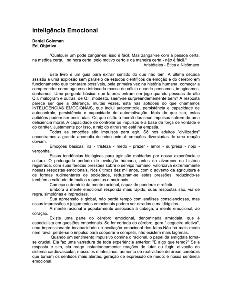 Inteligência Emocional Daniel Goleman Ed. Objetiva "Qualquer um pode zangar-se; isso é fácil. Mas zangar-se com a pessoa certa, na medida certa, na hora certa, pelo motivo certo e da maneira certa - não é fácil." Aristóteles - Ética a Nicômaco Este livro é um guia para extrair sentido do que não tem. A última década assistiu a uma explosão sem paralelo de estudos científicos da emoção e do cérebro em funcionamento que tornaram possíveis, pela primeira vez na história humana, começar a compreender como age essa intrincada massa de célula quando pensamos, imaginamos, sonhamos. Uma pergunta básica: que fatores entram em jogo quando pessoas de alto Q.I. malogram e outras, de Q.I. modesto, saem-se surpreendentemente bem? A resposta parece ser que a diferença, muitas vezes, está nas aptidões do que chamamos INTELIGÊNCIAS EMOCIONAIS, que inclui autocontrole, persistência e capacidade de autocontrole, persistência e capacidade de automotivação. Mais do que isto, estas aptidões podem ser ensinadas. Os que estão à mercê dos seus impulsos sofrem de uma deficiência moral. A capacidade de controlar os impulsos é à base da força de vontade e do caráter. Justamente por isso, a raiz do altruísmo está na empatia. Todas as emoções são impulsos para agir. Só nos adultos "civilizados" encontramos a grande anomalia do reino animal: emoções divorciadas de uma reação obviam. Emoções básicas: ira - tristeza - medo - prazer - amor - surpresa - nojo vergonha. Essas tendências biológicas para agir são moldadas por nossa experiência e cultura. O prolongado período de evolução humana, antes do alvorecer da história registrada, com suas ferozes pressões sobre o serviço humano, valorizava extremamente nossas respostas emocionais. Nos últimos dez mil anos, com o advento da agricultura e de formas rudimentares de sociedade, reduziram-se estas pressões, reduzindo-se também a validade de muitas respostas emocionais. Começa o domínio da mente racional, capaz de ponderar e refletir. Embora a mente emocional responda mais rápido, suas respostas são, via de regra, simplórias e imprecisas. Sua apreensão é global, não perde tempo com análises conscienciosas, mas essas impressões e julgamentos emocionais podem ser errados e maldirigidos. A mente racional é popularmente associada à cabeça; a mente emocional, ao coração. Existe uma parte do cérebro emocional, denominada amígdala, que é especialista em questões emocionais. Se for cortada do cérebro, gera " cegueira afetiva", uma impressionante incapacidade de avaliação emocional dos fatos.Não há mais medo nem raiva, perde-se o impulso para cooperar e competir, não existem mais lágrimas. Quando um sentimento impulsivo domina o racional, o papel da amígdala tornase crucial. Ela faz uma varredura de toda experiência anterior: "É algo que temo?" Se a resposta é sim, ela reage instantaneamente: reações de lutar ou fugir, ativação do sistema cardiovascular, músculos e intestinos, aumento de reatividade de áreas cerebrais que tornam os sentidos mais alertas, geração de expressão de medo; é nossa sentinela emocional. Antes de o nosso cérebro pensante ter consciência, a amígdala é avisada. Ela reage antes de podermos pensar! Como vemos, a emoção pode esmagar a racionalidade, embora com freqüência o sinal vá primeiro até o neocórtex, e dai para a amígdala. O trabalho de um pesquisador, Le Doux, mostrou que nosso cérebro emocional pode reagir sem que nosso cérebro racional tome conhecimento. Pode também abrigar lembranças e repertórios de respostas de que jamais teremos plena consciência. O “inconsciente cognitivo" tem opiniões próprias independentes de nossa mente racional. Uma outra parte do nosso cérebro emocional, denominada hipocampo, fornece uma memória precisa de contexto (a diferença de um urso que vemos no zoológico ou no nosso quintal) e retém esta informação. O hipocampo é crucial no reconhecimento de um rosto. A amígdala acrescenta se você gosta ou não dele. É uma memória emocional. Esta memória emocional pode desencadear reações desproporcionais e obsoletas a acontecimentos vagamente semelhantes, mas que têm o poder de acalmar a amígdala. Acontecimentos registrados na infância, antes do advento da fala, podem desencadear explosões emocionais intensas. Felizmente, em nosso neocórtex, existe um amortecedor das ondas repentinas da amígdala. Esta região modula as reações do nosso cérebro emocional. É uma resposta mais racional, um pouco mais demorada, mas mais precisa e ponderada. Quando os lobos pré-frontais, como denominamos esta região, não agem, o cérebro emocional domina e há uma reação irracional. Nosso cérebro racional (neocórtex) tem duas metades: hemisfério direito e esquerdo. Cada uma destas metades apresenta divisões (lobos), sendo que os lobos denominados pré - frontais, tanto do hemisfério direito (HD) como do esquerdo (HE), estão relacionados a emocionalidade. O lobo pré-frontal esquerdo é uma espécie de termostato nervoso, regulando emoções desagradáveis, parecendo fazer parte de um circuito normal que pode desligar, ou pelo menos amortecer, quase todos os impulsos negativos provenientes da emoção. Se a amígdala age como um disparador de emergência, o lobo pré-frontal esquerdo, a ela ligado, pode desligar este disparo. O lobo pré-frontal direito é um local de sentimentos negativos, como medo e agressão, provavelmente sendo inibido pelo lobo esquerdo. Vemos que estas ligações entre o sistema límbico e o neocórtex são o centro das batalhas ou da cooperação entre a "cabeça" e o “coração", o pensamento e o sentimento. O córtex pré - frontal é a região do cérebro responsável pela capacidade de atenção, que guarda na mente os fatos essências para concluir uma determinada tarefa ao resolver um problema - é a chamada memória funcional. Quando estamos emocionalmente perturbad