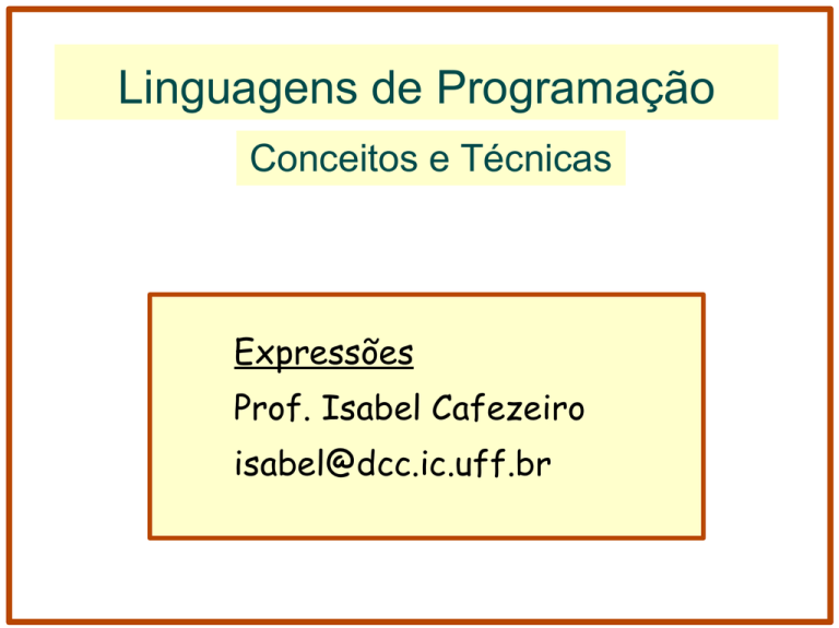Linguagens de Programação Conceitos e Técnicas Expressões Prof. Isabel Cafezeiro [email protected] Linguagens de Programação Expressões Expressão: Uma expressão é uma frase do programa que, ao ser avaliada, produz como resultado um valor. 1 “aa” 1+4 f(1,g(x)) Elementos da expressão: Operadores Operandos Resultado Linguagens de Programação Expressões Classificação Simples – sem operador Compostas Notação Prefixada: Infixada: Posfixada: Outros: !b a+b b++ x > y? x:y Linguagens de Programação Expressões Aridade dos operadores unários, binários, ternários, etc eneários: aridade variável Em Lisp: (+ 1) (+ 1 2) (+ 1 2 4) (+ 3 4 1 2) ... Em C e C++, o programador pode construir funções com número de parâmetros variável Linguagens de Programação Origem dos operadores Pré-existentes Definidos pelo Programador Valores & tipos de dados Em Java: boolean positivo (int n) { return n > 0; } Composição de operadores Em ML: val par = fn (n: int) => (n mod 2 = 0) val negação = fn (t:bool) => if t then false else true val impar = negação o par Linguagens de Programação Tipos de expressões: Literais, constantes e variáveis de Agregação (estática, dinâmica) Constroem valores compostos Aritméticas, Relacionais, Booleanas Binárias Operam nos bits Condicionais O valor computado depende de uma condição Chamadas de Função Referenciamento/Derreferenciamento Categóricas Operam sobre tipos Interativas Expressões Linguagens de Programação Tipos de expressões: Expressões Literais Resultam no valor explícito do texto do programa de Agregação (estática, dinâmica) Aritméticas, Relacionais, Booleanas Binárias Condicionais Chamadas de Função Referenciamento/Derreferenciamento Categóricas Interativas 2,72 99 0143 ‘c’ ... Linguagens de Programação Tipos de expressões: constantes gera o valor da constante de Agregação (estática, dinâmica) Aritméticas, Relacionais, Booleanas Binárias Condicionais Chamadas de Função Referenciamento/Derreferenciamento Categóricas Interativas Expressões Linguagens de Programação Tipos de expressões: variáveis gera o valor corrente da variável de Agregação (estática, dinâmica) Aritméticas, Relacionais, Booleanas Binárias Condicionais Chamadas de Função Referenciamento/Derreferenciamento Categóricas Interativas Expressões Linguagens de Programação Tipos de expressões: Expressões Literais, constantes, variáveis de Agregação (estática, dinâmica) Constroem valores compostos Aritméticas, Relacionais, Booleanas Binárias Condicionais Chamadas de Função Referenciamento/Derreferenciamento Categóricas Interativas operandos Em C: int c[ ] = {1, 2, 3}; operador Linguagens de Programação Tipos de expressões: Expressões Literais, constantes, variáveis de Agregação (estática, dinâmica) Constroem valores compostos Aritméticas, Relacionais, Booleanas Em C: void f(int i) { Binárias Condicionais } Chamadas de Função Referenciamento/Derreferenciamento Categóricas Interativas int a[] = {3 + 5, 2, 16/4}; int b[] = {3*i, 4*i, 5*i}; int c[] = {i + 2, 3 + 4, 2*i}; Linguagens de Programação Tipos de expressões: Expressões Literais, constantes, variáveis de Agregação (estática, dinâmica) Constroem valores compostos Aritméticas, Relacionais, Booleanas Em C: void f(int i) { Binárias Condicionais } Chamadas de Função Referenciamento/Derreferenciamento Categóricas Interativas int a[] = {3 + 5, 2, 16/4}; int b[] = {3*i, 4*i, 5*i}; int c[] = {i + 2, 3 + 4, 2*i}; Construtores ● Exemplo: Data d = new Data(); declaração de referência para a classe Data Data d = new; criação da instância associação da referência à instância Erro de compilação!!! Criação da instância sem a chamada do construtor invocação do construtor Data() C:\>javac demodata1.java demodata1.java:5: <identifier> expected Data hoje = new; ^ 1 error 13 Linguagens de Programação Tipos de expressões: Expressões Literais, constantes, variáveis de Agregação (estática, dinâmica) Em C: Aritméticas, Relacionais, Booleanas void main() { Binárias int j = 10; char c = 2; Condicionais printf(“%d\n”, ~c); /* imprime –3 */ printf(“%d\n”, j & c); /* imprime 2 */ Chamadas de Função printf(“%d\n”, j | c); /* imprime 10 */ printf(“%d\n”, j ^ c); /* imprime 8 */ Referenciamento/Derreferenciamento printf(“%d\n”, j << c);/* imprime 40 */ Categóricas printf(“%d\n”, j >> c);/* imprime 2 */ Interativas } Operam nos bits Linguagens de Programação Tipos de expressões: Expressões Literais, constantes, variáveis de Agregação (estática, dinâmica) Aritméticas, Relacionais, Booleanas Binárias Em JAVA: max = x > y ? x : y; Condicionais par = z % 2 == 0 ? true : false O valor computado depende de uma condição Chamadas de Função Referenciamento/Derreferenciamento Categóricas Interativas Linguagens de Programação Tipos de expressões: Expressões Literais, constantes, variáveis de Agregação (estática, dinâmica) Aritméticas, Relacionais, Booleanas Binárias Condicionais Função é uma abstração de expressão: o usuário informa os argumentos e recebe o resultado sem se importar na forma de implementação Chamadas de Função Busca( 3,vet ); Referenciamento/Derreferenciamento Categóricas operador operandos Interativas Linguagens de Programação Tipos de expressões: Expressões Literais, constantes, variáveis de Agregação (estática, dinâmica) F( x,...,w ); Aritméticas, Relacionais, Booleanas Binárias Condicionais Um identificador ou uma expressão que gere uma função Chamadas de Função Referenciamento/Derreferenciamento Categóricas Interativas Em HASKELL: (if ... then sin else cos) (x) Linguagens de Programação Tipos de expressões: Literais, constantes, variáveis Expressões F( x,...,w ); de Agregação (estática, dinâmica) Uma n-upla, ou n valores Em C: Aritméticas, Relacionais, Booleanas typedef struct s { int a,b,c; } params; Binárias Condicionai