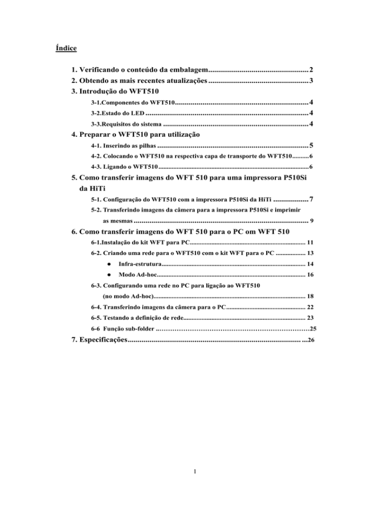 Índice 1. Verificando o conteúdo da embalagem...................................................2 2. Obtendo as mais recentes atualizações ...................................................3 3. Introdução do WFT510 3-1.Componentes do WFT510 ....................................................................4 3-2.Estado do LED ...................................................................................4 3-3.Requisitos do sistema ..........................................................................4 4. Preparar o WFT510 para utilização 4-1. Inserindo as pilhas .............................................................................5 4-2. Colocando o WFT510 na respectiva capa de transporte do WFT510..........6 4-3. Ligando o WFT510 ...........................................................................................6 5. Como transferir imagens do WFT 510 para uma impressora P510Si da HiTi 5-1. Configuração do WFT510 com a impressora P510Si da HiTi ..................7 5-2. Transferindo imagens da câmera para a impressora P510Si e imprimir as mesmas ......................................................................................... 9 6. Como transferir imagens do WFT 510 para o PC om WFT 510 6-1.Instalação do kit WFT para PC...................................................................... 11 6-2. Criando uma rede para o WFT510 com o kit WFT para o PC .................. 13 z Infra-estrutura....................................................................................... 14 z Modo Ad-hoc.......................................................................................... 16 6-3. Configurando uma rede no PC para ligação ao WFT510 (no modo Ad-hoc)............................................................................................ 18 6-4. Transferindo imagens da câmera para o PC................................................ 22 6-5. Testando a definição de rede.......................................................................... 23 6-6 Função sub-folder ..……………………………………………………………25 7. Especificações........................................................................................ ...26 1 1. Verificando o conteúdo da embalagem Foto transmissor sem fio Capa de transporte WFT510 WFT510 da HiTi Cabo USB CD de suporte com o kit WFT para o PC Manual do usuário Certificado de garantia Gancho Nota: 1. Se algum destes itens estiver em falta, contacte seu Distribuidor Oficial HiTi. 2. As pilhas não estão INCLUSAS. 2 2. Obtendo as mais recentes atualizações O web site da HiTi Digital Inc. fornece as mais recentes atualizações em termos do drivers, aplicações, manual do usuário, firmware para a impressora, que podem ser transferidos pelo usuário através do web site, visite www.hiti.com para mais informações. Em caso de dúvida(s) e pergunta(s) acerca do(s) produto(s) da HiTi, entre em contato com o seu Distribuidor HiTi autorizado para obter mais informações. 3 3. Introdução ao WFT510 3-1. Componentes do WFT510 Chave de alimentação Antena Botão de modo transferência/captura Status do LED Entrada USB para PC/impressora Entrada USB para a câmera 3-2. Status do LED Pronto=Verde Transmitir=Cor-de-laranja Erro = Vermelho Modo transferência/captura=Azul Estado Ligar Modo PictBridge Erro da conecção USB Transmissão de dados da câmera para o WFT510 Transmissão de dados do WFT510 para o host Erro de transmissão Pilhas fracas Substituir a bateria Pronto O (ligado) O (ligado) O (ligado) Erro X (desligado) X (desligado) O (ligado) Transmitir X (desligado) X (desligado) X (desligado) Comutar X (desligado) O (ligado) X (desligado) O (ligado) X (desligado) X (desligado) Q (pisca) O (ligado) X (desligado) Q (pisca) X (desligado) O (ligado) Q (pisca) X (desligado) O (ligado) X (desligado) O (ligado) X (desligado) X (desligado) X (desligado) X (desligado) X (desligado) X (desligado) Aviso: Quando a carga das pilhas fica abaixo de um determinado nível, o LED indicador de erro (vermelho) acende. Substitua as pilhas, pois caso contrário o LED de erro continuará aceso. 3-3. Requisitos do sistema _PC Intel Pentium ou compatível _ 100 MB ou mais de espaço livre no disco rígido _ Windows XP/Vista (32 bits) _ Unidade de CD-ROM ou de DVD-ROM _ 128 MB de memória RAM ou acima 4 4. Preparando o WFT510 para utilização - Colocar as pilhas z Empurre a tampa do compartimento das pilhas do WFT510 para a abrir z Introduza 4 pilhas recarregáveis (recomendado) ou pilhas AA alcalinas. AVISO: NÃO misture pilhas recarregáveis com pilhas alcalinas. Isto pode causar vazamento ou ruptura das pilhas e resultar em danos materiais. z Empurre a tampa do compartimento das pilhas do WFT510 para a fechar 5 Duração das pilhas: De forma a otimizar o desempenho do WFT510, a HiTi recomenda e a utilização de pilhas recarregáveis. Os valores seguintes foram obtidos a uma temperatura de 20 ℃ (68 ℉) e com umidade de 40%. O WFT510 da HiTi foi utilizado como um dispositivo de teste. A duração das pilhas varia conforme a câmera utilizada. Pilhas diferentes têm também durações diferentes. Tipo de pilha recarregável 2700 Amp 2500 Amp Utilização contínua 3.5horas 3 horas Standby 4.5 horas 4horas 4-2. Colocar o WFT510 na respectiva capa de transporte do WFT510 A capa de transporte do WFT510 permite 3 formas diferentes transportar Transporte pela alça Pendurado no gancho No cinto 4-3. Ligando o WFT510 z Deslize a chave de alimentação do WFT510 da posição [OFF] (DESLIGADO) para a posição [ON] (LIGADO), todos os LEDs acenderão ao mesmo tempo. Aguarde cerca de 25 segundos, apenas o LED (verde) fica aceso. O WFT510 está pronto para uso. 6 5. Como transferir imagens do WFT 510 para uma impressora P510Si da HiTi 5-1. Configuração do WFT510 com a impressora P510Si da HiTi Etapa 1 Ligue o P510Si Selecione [Settings] (Definições) e pressione o botão ( ) Etapa 2 Selecione [Adva