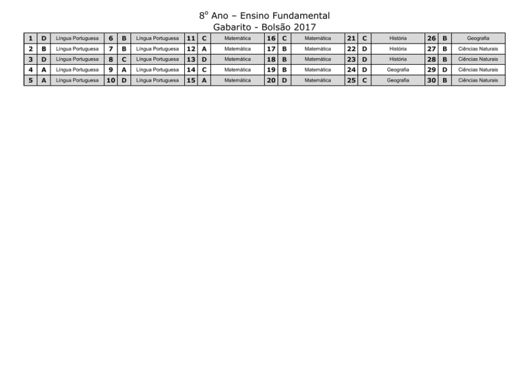 8o Ano – Ensino Fundamental Gabarito - Bolsão 2017 1 D Língua Portuguesa 6 B Língua Portuguesa 11 C Matemática 16 C Matemática 21 C História 26 B Geografia 2 B Língua Portuguesa 7 B Língua Portuguesa 12 A Matemática 17 B Matemática 22 D História 27 B Ciências Naturais 3 D Língua Portuguesa 8 C Língua Portuguesa 13 D Matemática 18 B Matemática 23 D História 28 B Ciências Naturais 4 A Língua Portuguesa 9 A Língua Portuguesa 14 C Matemática 19 B Matemática 24 D Geografia 29 D Ciências Naturais 5 A Língua Portuguesa 10 D Língua Portuguesa 15 A Matemática 20 D Matemática 25 Geografia 30 Ciências Naturais C B