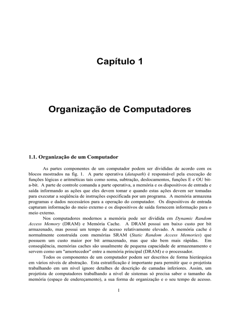 Capítulo 1 Organização de Computadores 1.1. Organização de um Computador As partes componentes de um computador podem ser divididas de acordo com os blocos mostrados na fig. 1. A parte operativa (datapath) é responsável pela execução de funções lógicas e aritméticas tais como soma, subtração, deslocamentos, funções E e OU bita-bit. A parte de controle comanda a parte operativa, a memória e os dispositivos de entrada e saída informando as ações que eles devem tomar e quando estas ações devem ser tomadas para executar a seqüência de instruções especificada por um programa. A memória armazena programas e dados necessários para a operação do computador. Os dispositivos de entrada capturam informação do meio externo e os dispositivos de saída fornecem informação para o meio externo. Nos computadores modernos a memória pode ser dividida em Dynamic Random Access Memory (DRAM) e Memória Cache. A DRAM possui um baixo custo por bit armazenado, mas possui um tempo de acesso relativamente elevado. A memória cache é normalmente construída com memórias SRAM (Static Random Access Memories) que possuem um custo maior por bit armazenado, mas que são bem mais rápidas. Em conseqüência, memórias caches são usualmente de pequena capacidade de armazenamento e servem como um "amortecedor" entre a memória principal (DRAM) e o processador. Todos os componentes de um computador podem ser descritos de forma hierárquica em vários níveis de abstração. Esta estratificação é importante para permitir que o projetista trabalhando em um nível ignore detalhes de descrição de camadas inferiores. Assim, um projetista de computadores trabalhando a nível de sistemas só precisa saber o tamanho da memória (espaço de endereçamento), a sua forma de organização e o seu tempo de acesso. 1 Ele não precisa saber qual a tecnologia de semicondutores ou quantos transistores (tamanho físico) foram utilizados para fabricar aquela memória. Sistema Operacional Processador Interface Parte Controle Entrada M em ória Parte Operativa Saída Fig. 1.1. Principais Blocos de um Computador. Fig. 1.2. Fotografia de uma estação de trabalho (workstation). A tela do tubo de raios catódicos (CRT) é o dispositivo de saída usual, enquanto que o teclado e o "mouse" são os dispositivos de entrada principais. Fig. 1.3. Fotografia do interior de um "mouse". 2 Fig. 1.4. Tela de um tubo de raios catódicos (Cathode Ray Tube - CRT). Um feixe de elétrons é acelerado através do vácuo contra uma tela revestida com fósforo. O feixe de elétrons é guiado em direção à tela através de uma bobina colocada na parte traseira do CRT. Este tipo de sistema, que é o mesmo usado em televisão e computadores, pinta através de uma série de pontos (pixels) uma linha de cada vez na tela. A tela é reanimada (refresh) de 30 à 60 vezes por segundo. Fig. 1.5. Cada coordenada no "buffer de quadro" na esquerda, determina o nível de cinza da coordenada correspondente para a tela do CRT, na direita. O pixel(X0, Y0) contem o padrão de bit 0011, o qual é um nível de cinza mais claro que o determinado pelo padrão de bit 1101 no pixel(X1, Y1). A fig. 1.6 mostra as tecnologias mais utilizadas ao longo dos tempos, com uma estimativa da performance relativa por custo unitário para cada uma destas tecnologias. Desde 1975, a tecnologia de circuitos integrados (CIs) define o que e com que rapidez os computadores são capazes de fazer. Assim, profissionais na área de computação devem se familiarizar com os conceitos básicos envolvendo circuitos integrados. Um transistor é simplesmente uma chave on/off controlada por eletricidade. Um CI, pode conter algumas centenas ou até mesmo alguns milhões de transistores. A taxa de aumento da integração tem sido irremarcavelmente estável ao longo dos últimos anos. A fig. 1.7 mostra o aumento da capacidade de memórias DRAM entre 1976 e 1992. A indústria de semicondutores tem quadruplicado a capacidade destes CIs a cada três anos. Esta incrível taxa de evolução na relação custo/performance e na capacidade das memórias tem governado o projeto de hardware e software de computadores e por isto, tornado obrigatório o conhecimento das tecnologias de CIs. A fabricação de um chip começa com silício (Si), uma substância encontrada na areia. O Si é chamado de semicondutor porque ele não conduz muito bem a eletricidade. Através de processos químicos, é possível se adicionar materiais ao Si, permitindo a sua transformação em: i) excelente condutor de eletricidade (similar ao cobre e ao alumínio), ou ii) excelente isolante (como plástico ou vidro), ou iii) áreas que conduzem ou isolam, de acordo com algumas condições especiais (como transistores, diodos, etc...). O processo de manufatura de CIs começa com um lingote (de 5 à 8 polegadas de diâmetro e 12 de comprimento) de cristal de silício, o qual é cortado em fatias (wafers) de cerca de 0,1 polegada de espessura. Os wafers passam então por uma série de etapas, durante as quais cria-se no Si vários elementos como transistores, diodos, capacitores, resistores, etc... Dado que um wafer custa aproximadamente o mesmo preço não importando o que está 3 construído em cima, poucos CIs implicam em altos custos porque grandes pastilhas de CIs são mais propícias a conter defeitos e assim ter de ser rejeitadas, o que reduz o rendimento do processo (process yield). Assim, projetistas de CIs tem que conhecer bem a tecnologia que está sendo utilizada para ter certeza de que o aumento no custo para produzir CIs maiores se justifica por uma melhoria na performance destes CIs. (a) (b) (c) Fig. 1.6. (a) Performance relativa por custo unitário para as tecnologias mais usadas em computadores ao longo dos tempos. (b) Gerações de computadores são normalmente determinadas pela mudança de tecnologia dominante. Tipicamente, cada geração oferece a oportunidade para desenvolver uma nova classe de c